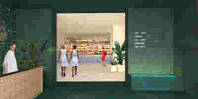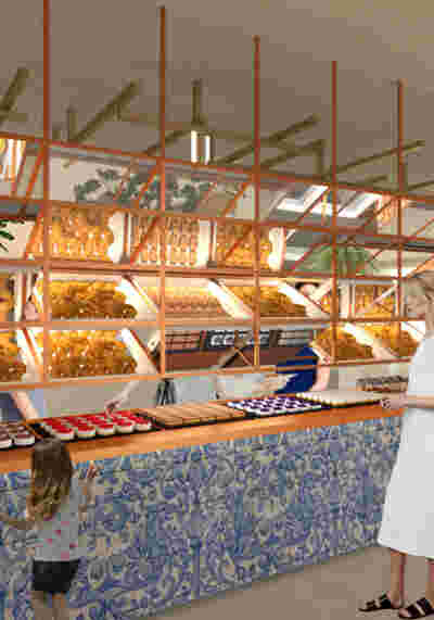 In our renovation, the bay leaf garland is enlarged and expanded to emulate a surface with a fish-scale structure: the new facades are to be formed of semicircular ceramic tiles, similar to those used by architect Eli Modiano on the excellent roof (a Mansart type with minimal deviation from the vertical, interrupted only by circular skylights) of the old customs offices in the port of Thessaloniki. The decorative detail of the listed building and the scaly “armor” of the new facade partake into a new dialogue, the latter in the tones of the light-colored terracotta, forming a kind of new vertical “roof” where the only actual slope is to be witnessed in the lintels themselves: they meet the parapet at an angle, emphasizing the vertical proportions of the openings and bring the thickness of the wall to a sharp edge.