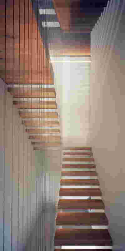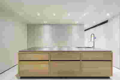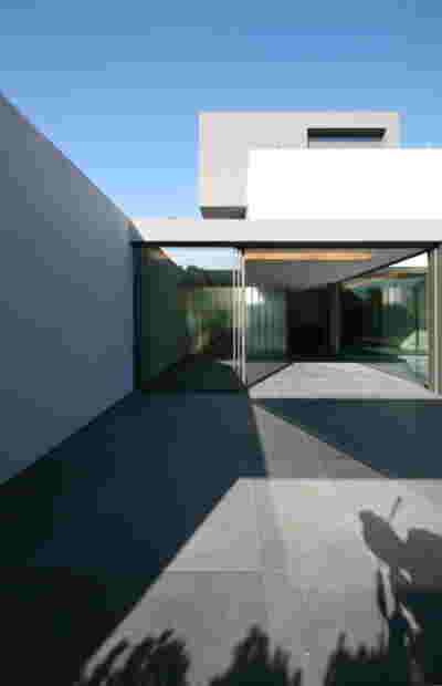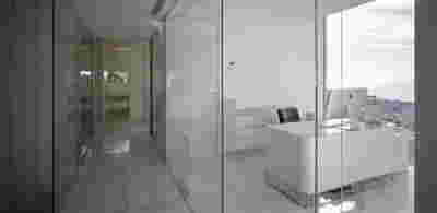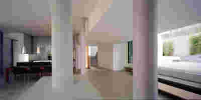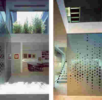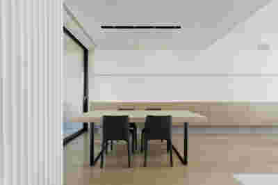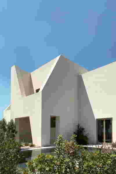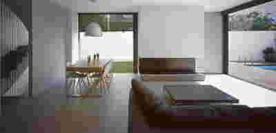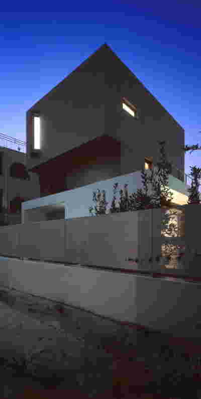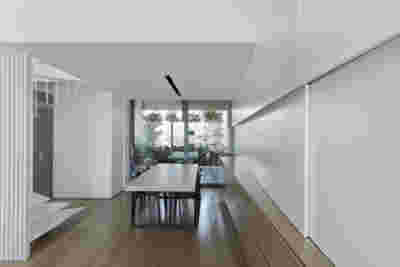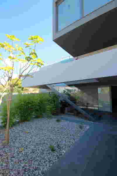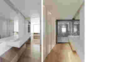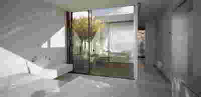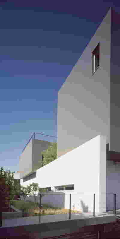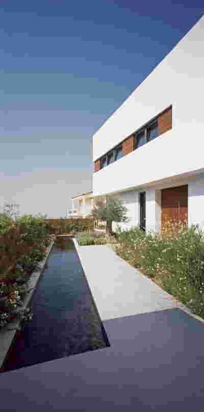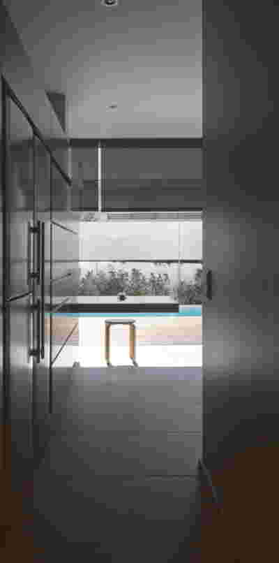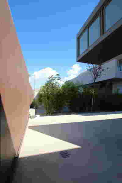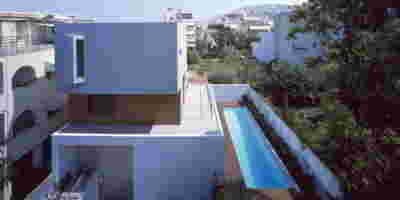 The similarity here with the marble quarry is not literal, in terms of the material itself -this particular residence may have followed the design of the Garden House in P. Psychiko, but marble finishes have not been chosen for the facades. On the contrary, the relationship with stone quarrying refers to the process of extracting volumes, since indeed behind the absolutely monolithic facade two large “blocks” have been removed to a depth of four meters. These voids form two gardens, one visible on the ground floor opposite the entrance and the second elevated, visible exclusively from the master bath on the first floor. A common feature of both gardens is the fact that they are both walled-in, like vases within the residence. These “secret gardens” manage to be completely invisible from the street, as the first floor spans its opaque and undisturbed façade hovering above the fence. In this way, the master bath manages paradoxically, to be completely transparent on both sides and, at the same time, completely invisible to visitors and neighbors. The house is divided into rectangular spaces between which, on the ground floor, diagonal relationships are created: From the entry of the house, the first garden “deflects” our movement and gaze diagonally, in a view that ends at the pool. A similar reverse diagonal relationship exists between the living room and the dining room, the latter being the only space in the house that protrudes into the garden.