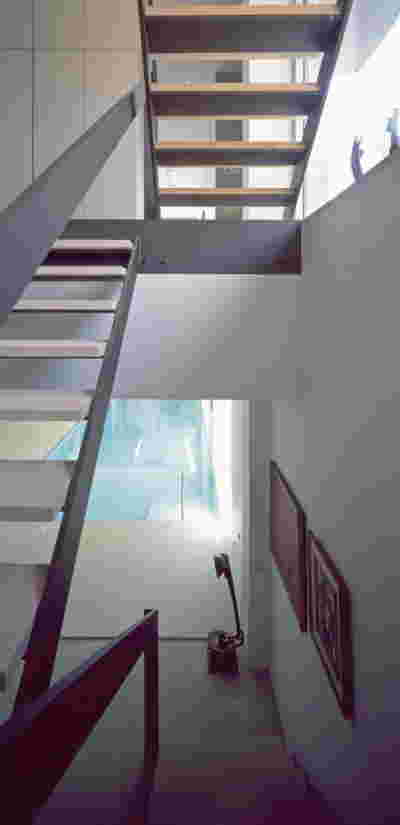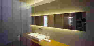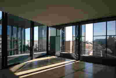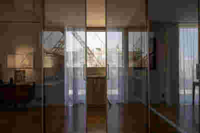 Our proposal for this duplex has eschewed repetitive balconies at the perimeter (the trademarks of the Polykatoikia, the omnipresent Athenian apartment building). The narrow façade of our building, due to its monolithic massing, achieves an ambiguity of scale as well as visual privacy from the two adjacent apartment buildings -the owners requested this early on, since those are the only tall buildings in the neighborhood, while the rest remain one and two-story houses. At the terrace of the new penthouse, we placed a jacuzzi, so as to mirror the living room’s fireplace, one featuring a glass back.