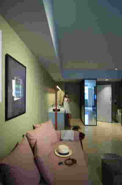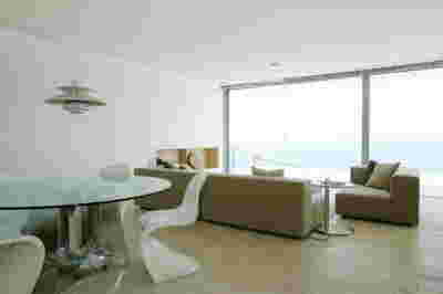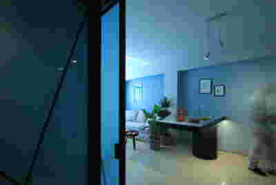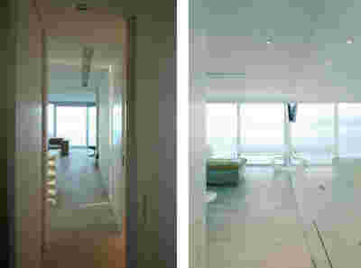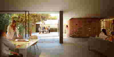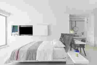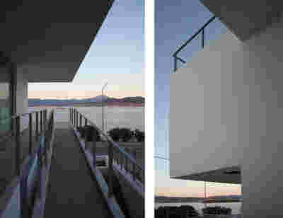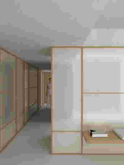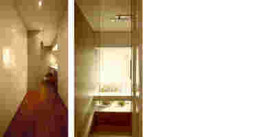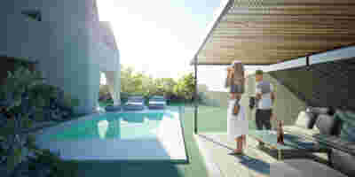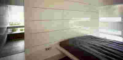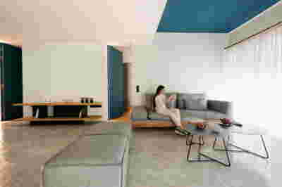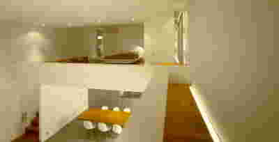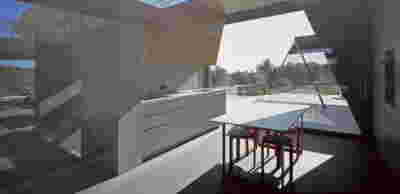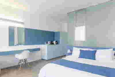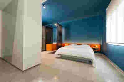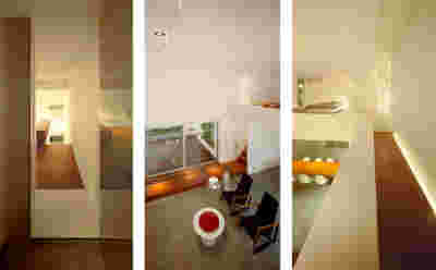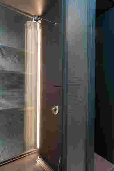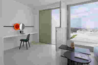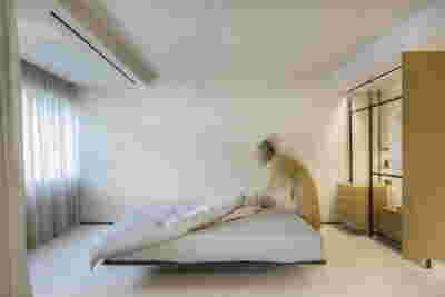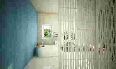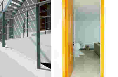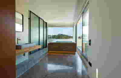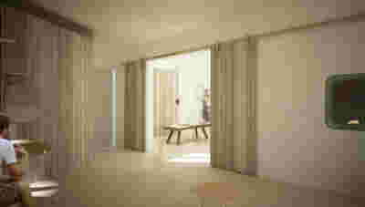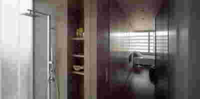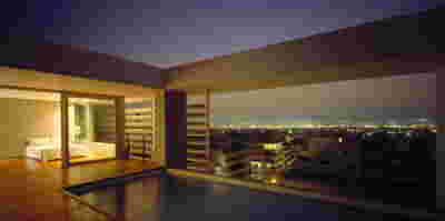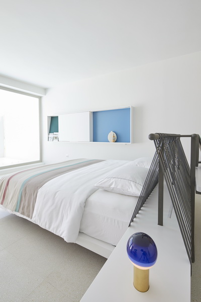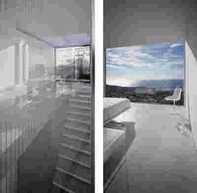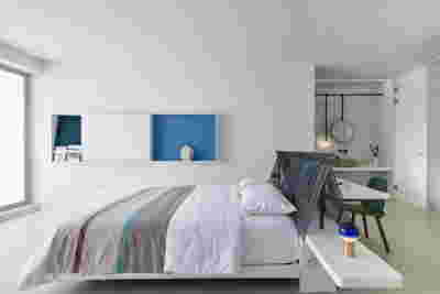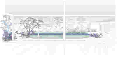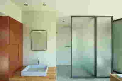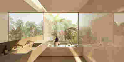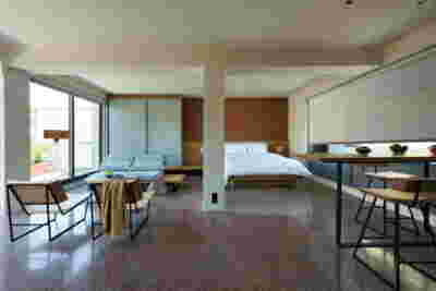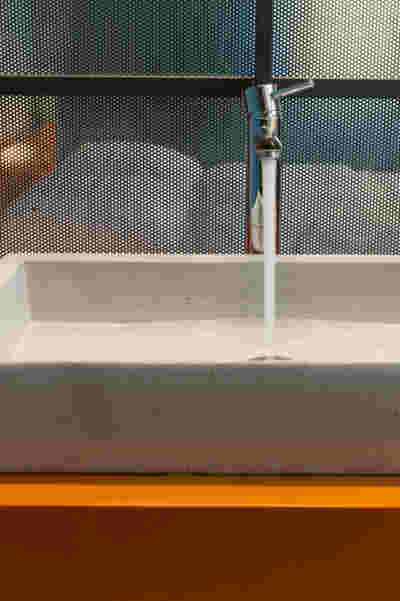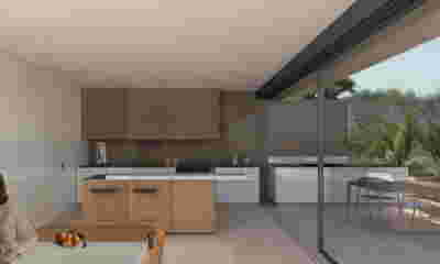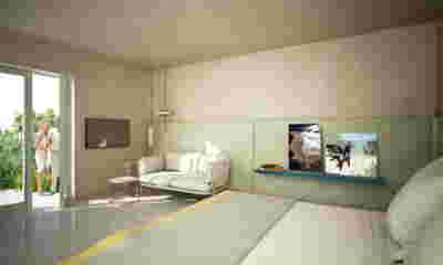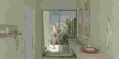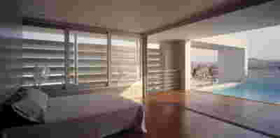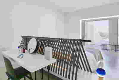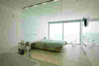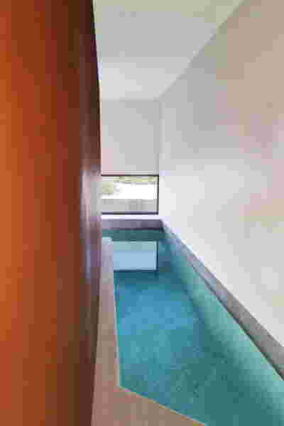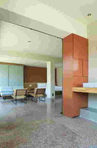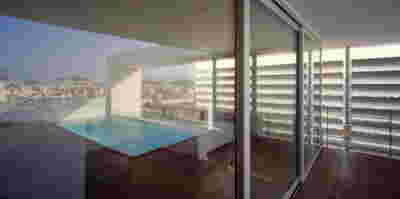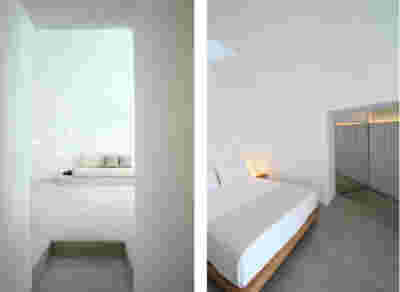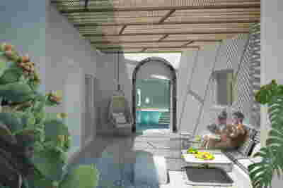 Type B, is a larger, L shaped room with a bedroom and a bathroom, with access from the backyard. It has an unobstructed view of the sea, while the window that separates the inside and the outside at this facade, slides towards the wall, unifying the inside and the outside and practically doubling the living space of the unit. Residents bathe in a partially covered jacuzzi, in complete privacy, as if they were in a cave. The shower is designed on the back of the room, overlooking the planted garden.