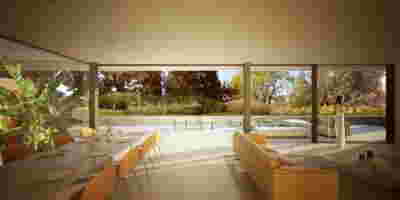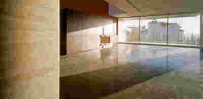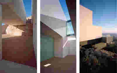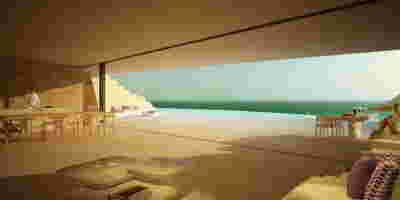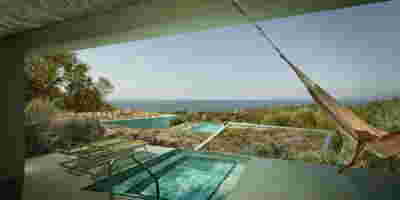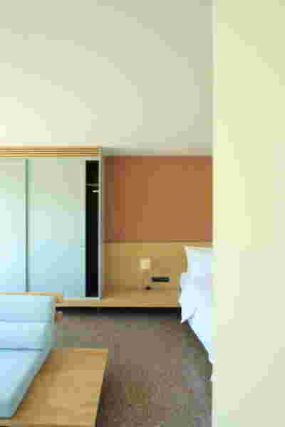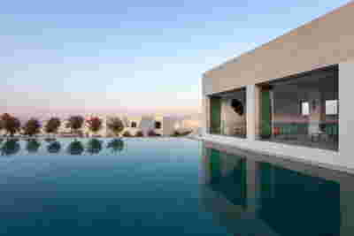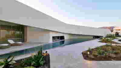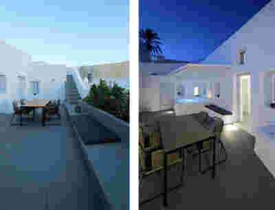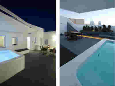 The memory of the mine -not only that of the particular site but also that of the rich mining history of the island- is preserved. Trencadís Hotel refers to the mine indirectly, not to its pre-existing amphitheater shape but to its energy: its public areas are carved in the slope and feature two large excavations, two deep quarries in the landscape, filled with water at their lowest level. Walking through the reception, the spa, the restaurants, one watches the light descend on such a narrow courtyard, an excavated with precision orthogonal quarry, flooded at its deepest point. A second cut, the linear pool overlooking the sea, repeats this geometrical rigor and contrasts it with the earth-anchored public buildings of buried footprints. In a fitting analogy, the road connecting the highest slope with the lowest, coastal part of the plot, crosses under the community road.