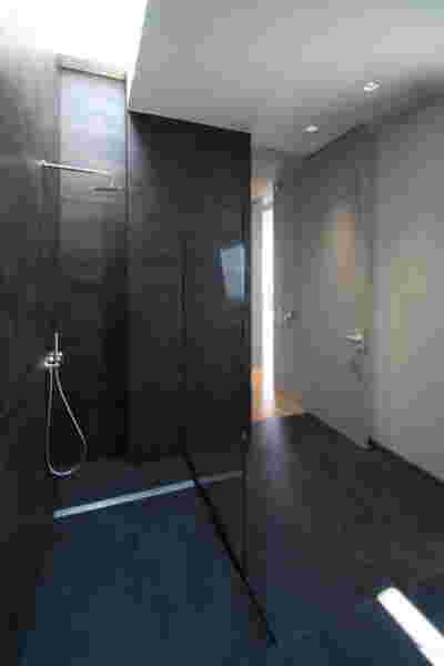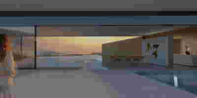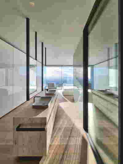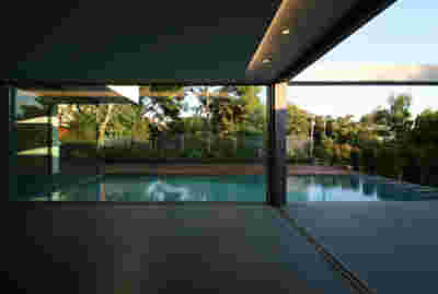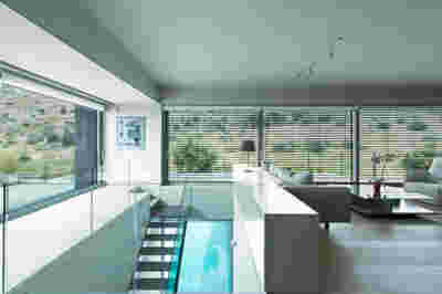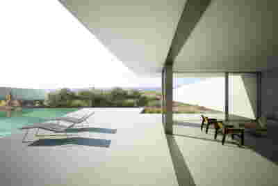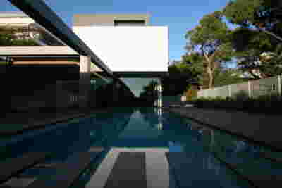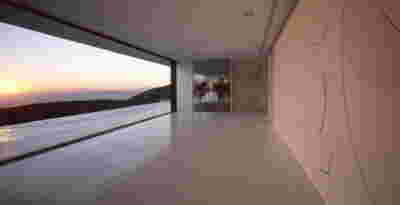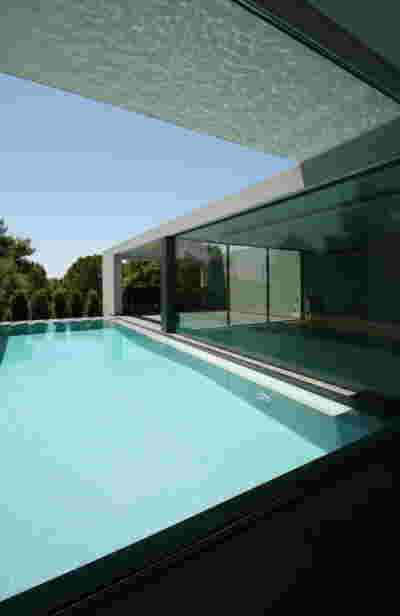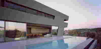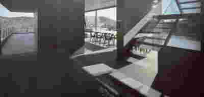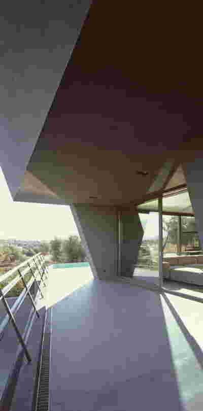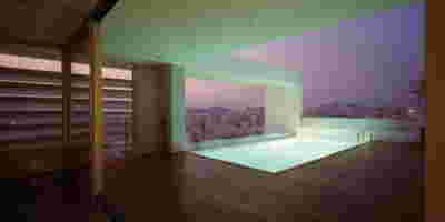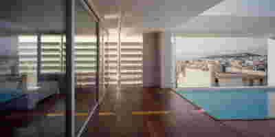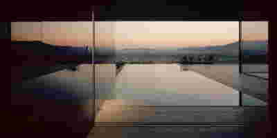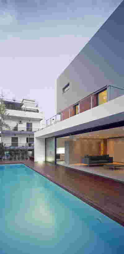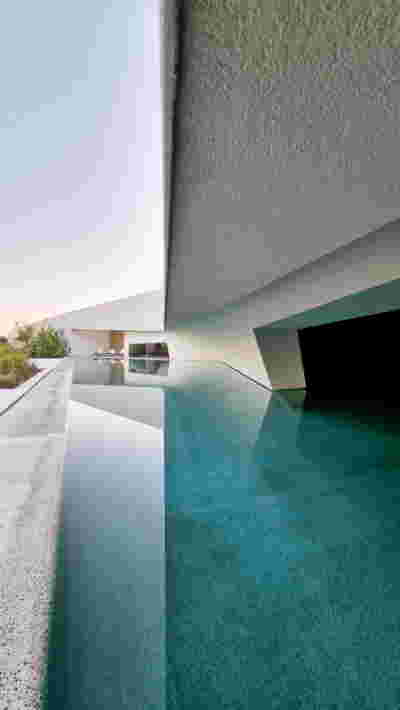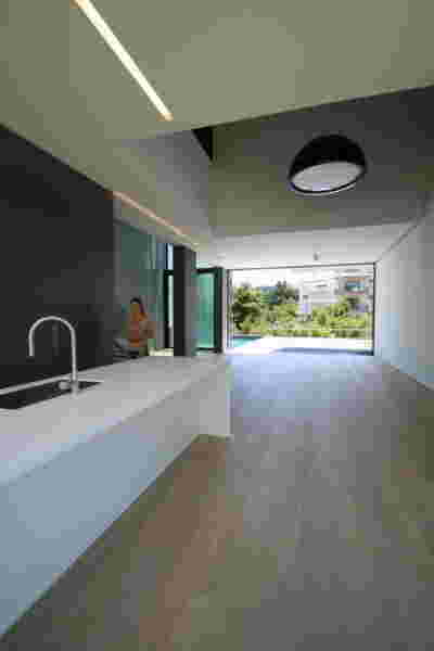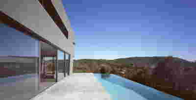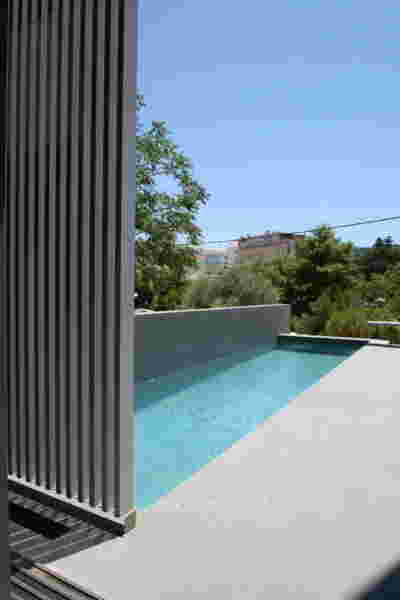Quite expectantly, from this strongly sloped plot perched on the mountain side, this house would have impressive views towards the city. What was not foreseen was how this view would shape the house itself. How that is we would allow its design to be influenced by this view, instead of parachuting a well proportioned, autonomous building/object that benefited from a good view. It is with this in mind, that we proposed an “elevated platform” on the ground floor –upon it a large balcony, plants, the living room, the dining room, the kitchen and the pool are to be found. The platform forms the base of sight and only the two side walls insulating the neighbors, frame the view -however, the distance between them is such that they tend to hide in the limits of peripheral vision: In the sixteen meters span no column interrupts this view and only an unfolding of the glass facade shapes the interior space. This platform defines quite literally at its shadow the rest of the house, with the bedrooms below, offered access to the garden and one additional storey bellow, all ancillary functions.