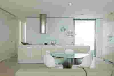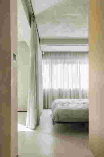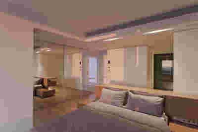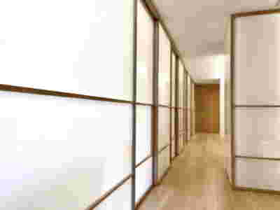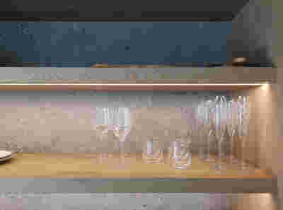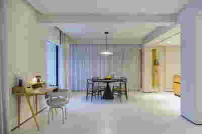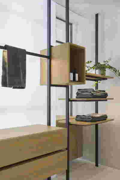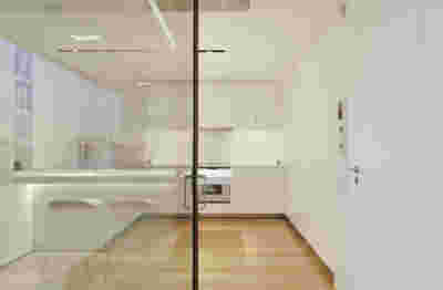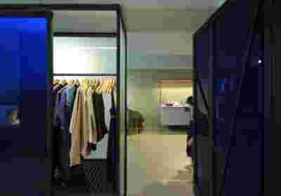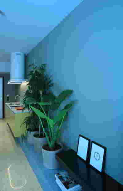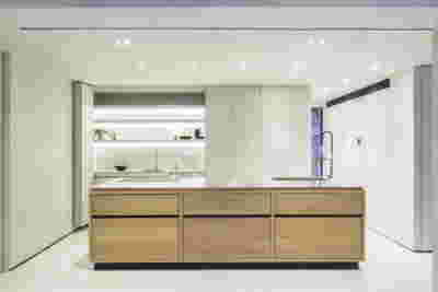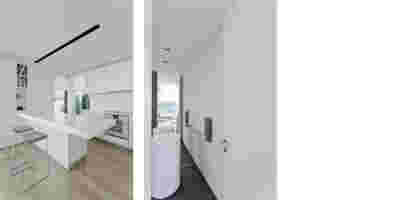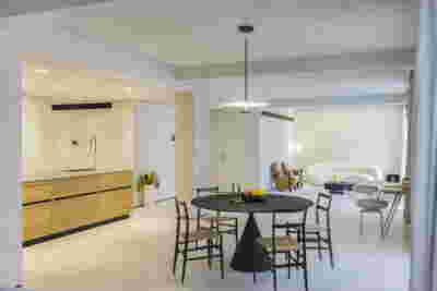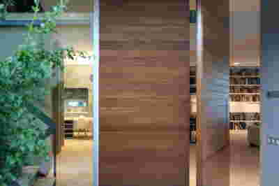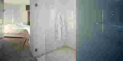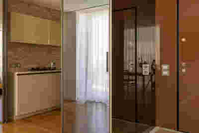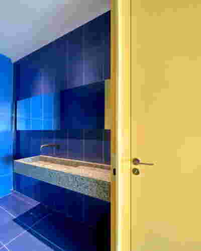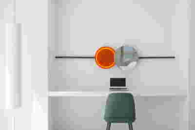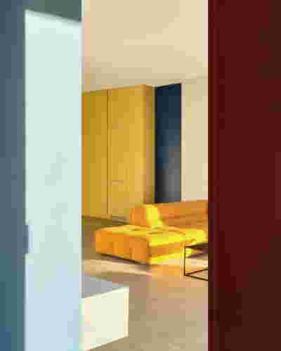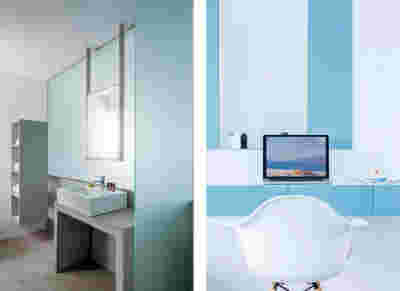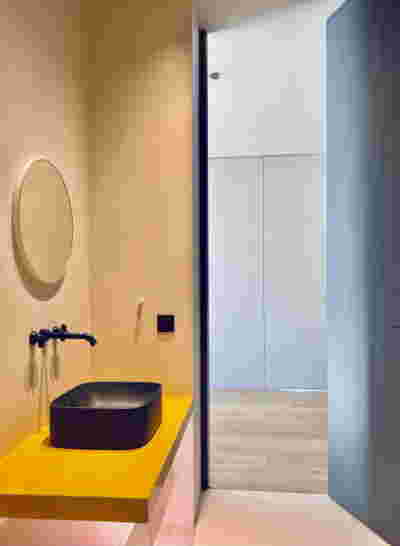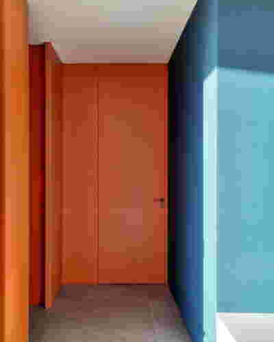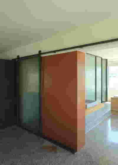Early on we noticed the clients’ deep understanding of Italian and Scandinavian design. This was not only impressive, it also led to a certain reversal of the typical design development: at the very outset the collection of furniture was almost complete and we were meant to design the house around them. Thus, the color of the interior walls became a subject of discussion: were we to emulate a white gallery setting or could we introduce colors to match different textures? The renovation eventually combines both approaches -the very articulation of spaces seemed to favor it: the formation of two boxes, one for the kitchen and one for the dressing closet are underlined by the bold use of color. The first box is the kitchen, lined with Rimadesio sliding glass doors it is finished with Karnazeiko marble (from Argolida, Peloponnese) and frames a view towards the sprawling apartment buildings towards Acropolis. This box is replicated by the lacquered volume housing a small library. It is concealed behind a sliding panel that replicates as a door leading to the bedrooms.