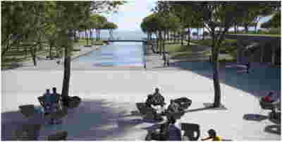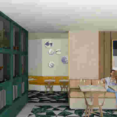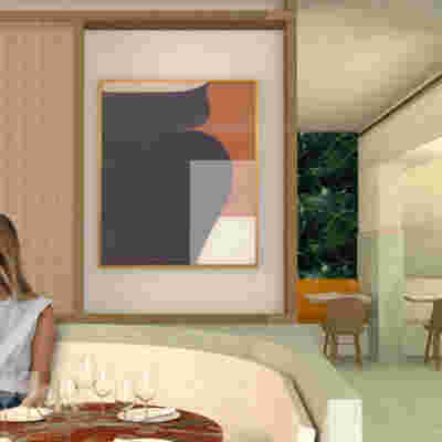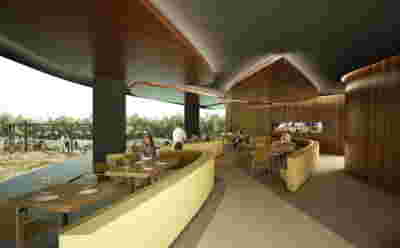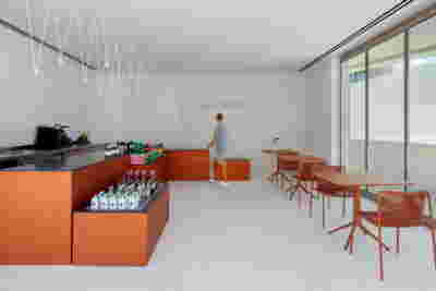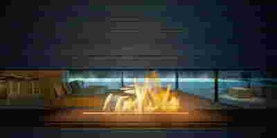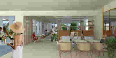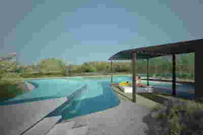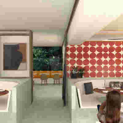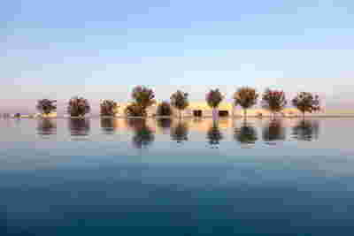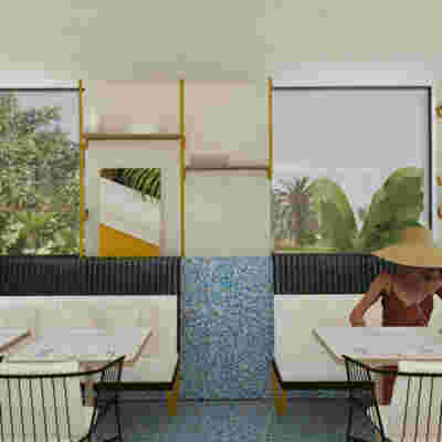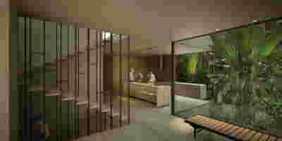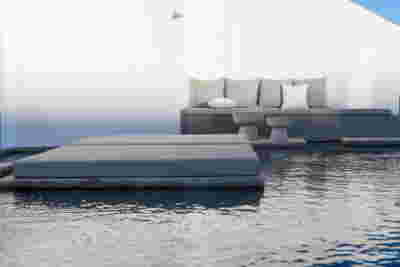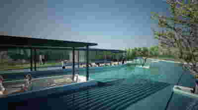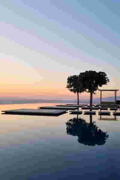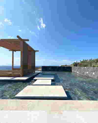 We designed the common areas around an elevated pool with trees and platforms in the water. Centrally placed, the building that will house the wellness areas is covered by a large swimming pool paved with tiles in dark shades matching the stone walls. The resulting shade of the water resembles that of the sea and the dark tonality of the tile blurs the boundaries between deep and shallow areas of the pool. Marble stepping stones start from the back area of ​​the sunbeds and end on three platforms towards West. Moving these platforms to the center of the pool (instead of its edge), also frees up a zone on the axis of which a more distant temple-like platform is framed, one marked by a wooden canopy. This is a almost ephemeral structure conveys a festive use –opposite it diagonally and in recess, we designed a much larger pergola that houses the restaurant space. Instead of the typology of a roof on stone columns, we have chosen the logic of a light construction that is realized with a metal structural frame its covered in wood. Its chestnut finish not only matches the furniture and the neighboring deck at the pool bar, but also maintains color affinities with the beige stone surfaces that occasionally appear (in a kind of mosaic) in the perimeter stonework. In the interior layout of the restaurant we organized “neighborhoods” of tables, interspersed with planting areas: the metal planters we designed include a floor air conditioner or form seating corners.