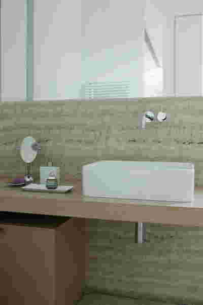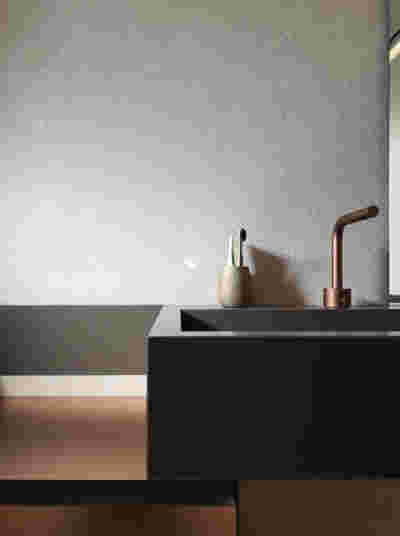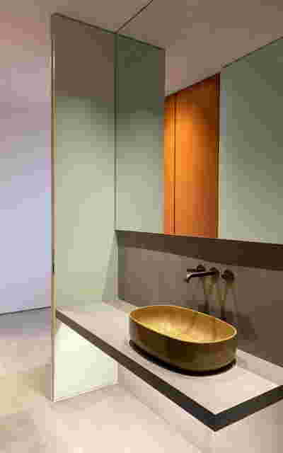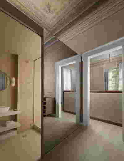 After this door follows the corridor lined with black and white prints and painted terracotta. This color looks as if it relates to the monumental neoclassical buildings across the street -in reality it was selected as the perfect match to the terrazzo floor of the entry hall. Marble does reappear in the master bath -here Oasis Green (from Tinos), so as to match the wooden finish at part of the interior. We think this renovation achieved a quite unique balance between vintage furniture (escaping easy attribution from contemporary production brands), along with Greek marble surfaces (their inclusion to such a large percent within the interior finishes, started to remind us of Milanese interiors, a familiar environment for the clients themselves).