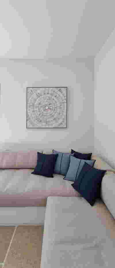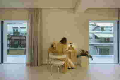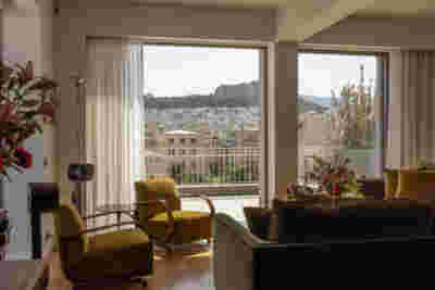 The monumental lineup here is impressive: the National Technical University (1862-1878) by Lysandros Kaftantzoglou directly across the street and the Archeological Museum (1866-1889) by Ludwig Lange / Ernst Ziller on the left. As if this frontal staging of neoclassical architecture was not enough, the Lycabettus hill’s curved outline looms at the background, the ultimate Athenian landmark, reminiscent of the Sugarloaf Mountain in Rio de Janeiro. Both the Museum and the University partake in a similar architectural agenda: a layering of marble colonnades in front of terracotta walls, a dialogue enriched by the greenery in the open spaces at the foreground. The apartment on the seventh floor overlooks these historical landmarks and its renovation reassembles deep colors with white walls. Responding to the large terrace, we chose to enlarge all windows, selecting a warm grey for the exterior facades, walls painted white in the interior.