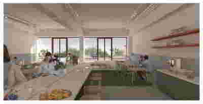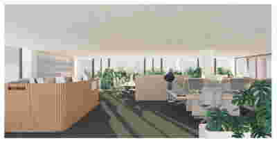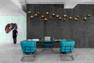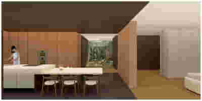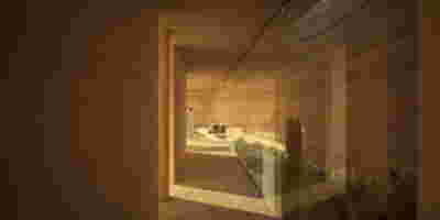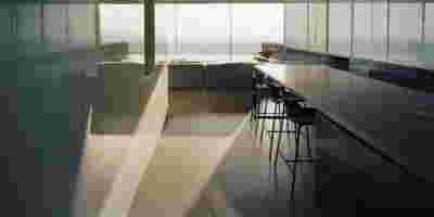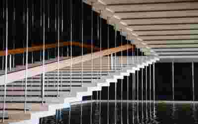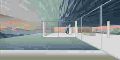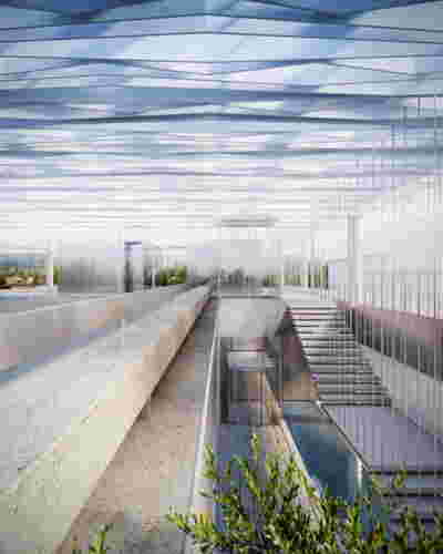 Corresponding to the landscape that we traversed prior to arrival, the new visitor center seems to float: this is helped by the formation of its perimeter with cantilevers that visually separate the visitor center on the first floor from the work area on the ground floor. Having entered through the axial access to the first floor, the distant view to the mountains is framed by an expanse of shallow water. This water reflects ripples of light to the ceiling, marking the movement of the sun. To our right, the space is organized into three zones: The first consists of a lounge with two islands of furniture. A second zone is formed by a linear counter with the possibility of serving coffee and light refreshments -next to it planters create protected areas. The third zone is formed by the meeting and video area -a wall covered with woven metal forms n outer limit, offering the possibility of isolation with sliding walls. The above functions constitute areas within the otherwise uniform space of the upper floor, where the omnipresent roof of bent sheets flows uninterrupted overhead. In the same logic, the smaller closed spaces have a ceiling lower than the total free height – there is a kitchen for preparing light meals, toilets and an office space. On the left, departing from the first floor, a second ladder suspended by cables connects us to the ground floor. To its opposite, climbing plants descend, accentuating the open two-story space –glimpses to the ground floor workspace are possible through a skylight to our right. At the footprint of the staircase, a water pond accentuates the hovering staircase. The ground floor is a sheltered workspace, with offices strategically placed on the perimeter near the entrance and surrounded by metal panels interspersed with perforated elements to filter natural light.