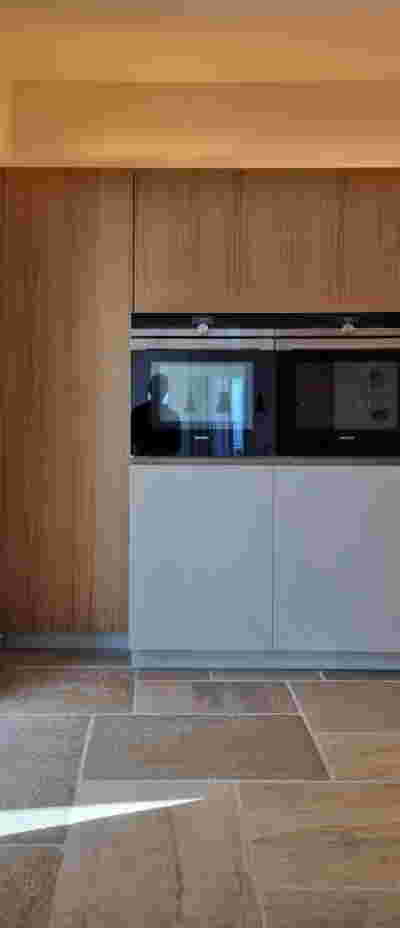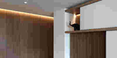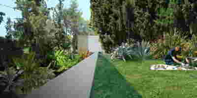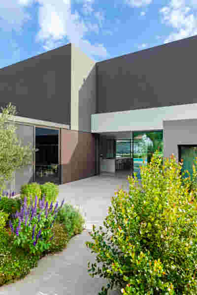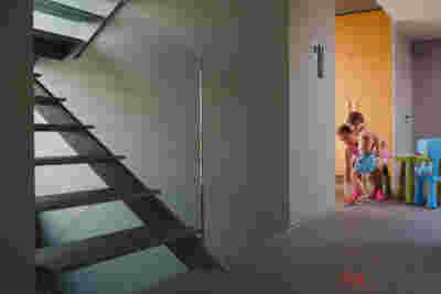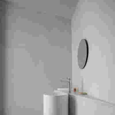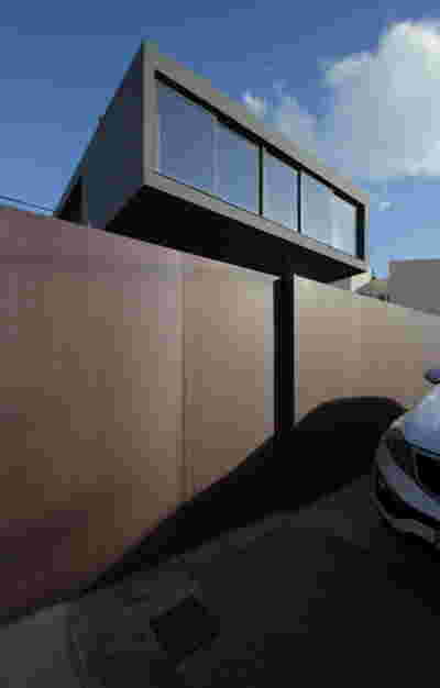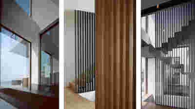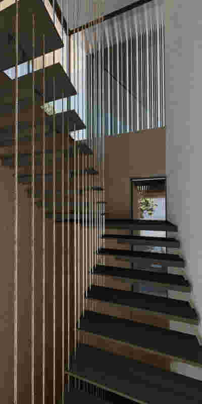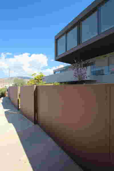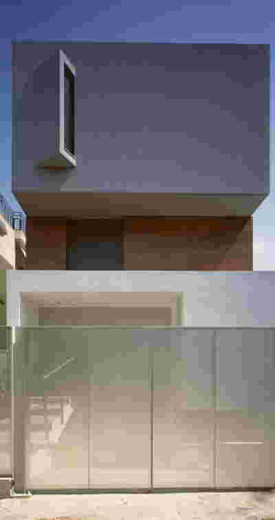 Above the first floor, which opens to the east and the garden, there is a smaller second floor, designed as a penthouse, containing the office and a guest room. A change of architectural vocabulary was here required, one enabled by the volume’s setback, as well as its cladding with metal panels. This penthouse is topping the wider first floor which is clad in a texture that reminds of quarries, of the mining process: with their grooves visible, a series of molded GRC concrete panels will be using gravel from the excavation. Standing occasionally on the edges of site excavations, we had already recognized the special beauty of the pink and beige rocks of this Athenian suburb. We wanted the return of the overlooked and discarded, this time celebrated, dignified, showcased on the elevation, restoring on a minute scale the identity of Filothei.