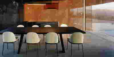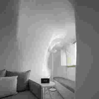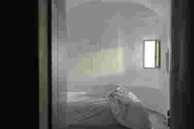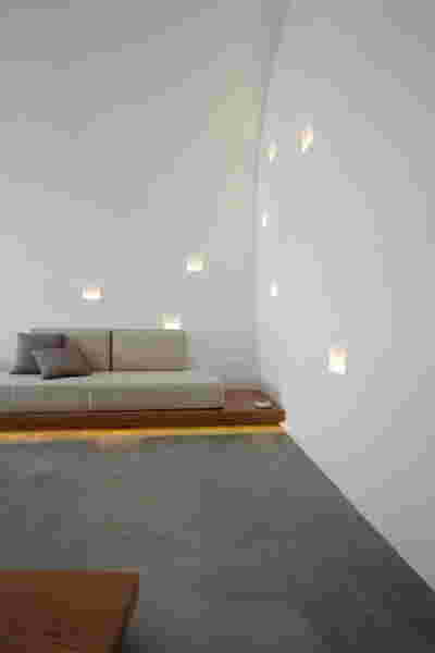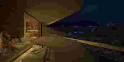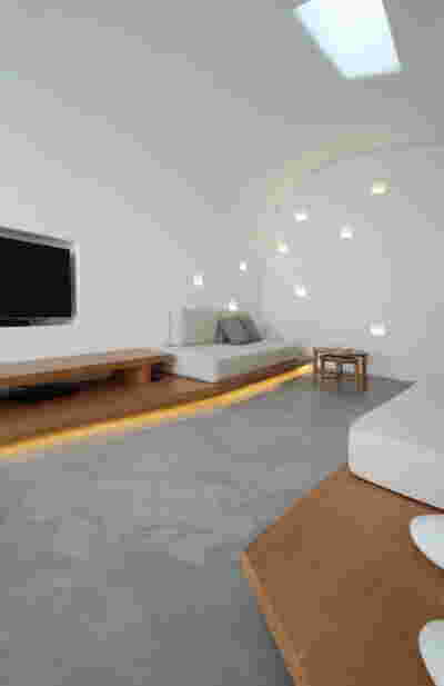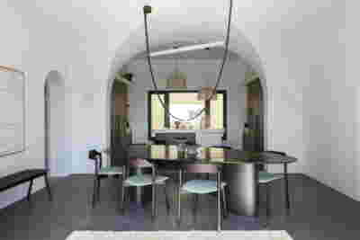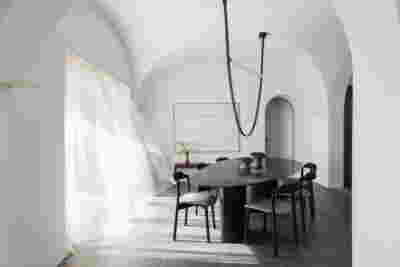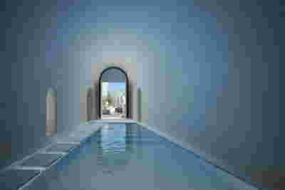 We reach this villa by climbing steps from the side. They lead to the edge of the trapezoidal pool. The surface of the water itself becomes the main space of the rooms, the area of gathering, living, contemplating the view of the sunset above the planted roofs. A sunken seating area, a platform at water level, a pergola and a semi-outdoor space organize different functional zones in this area. From this submerged in the steep slope dwelling, the swimming pool stands out as the only prominent element, free on all three sides. The rooms are characterized by their vaulted interiors and, externally, the exclusive use of local volcanic stone. They remain bright and airy as, apart from their facade, they are also organized around a backyard. The interior design by MEMNEO architecture upgrades the spaces with beautiful selections of material and furniture, “weaving a narrative between the rugged beauty of its location and the practicalities of sculpting an innovative home, creating a space that embraces a profound sense of coexistence within the landscape” as they mention.