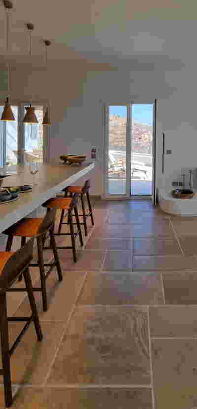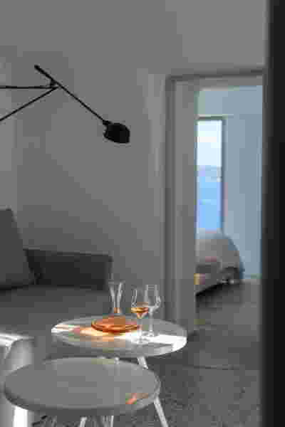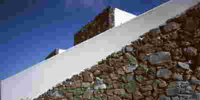 Although built in two consecutive phases, Epitome represented from early on a shift in relation to all the other accommodations of the Canaves company that were located at the Caldera: instead of the white plastered aesthetic, it had chosen stone walls and natural materials. After all, the conditions of this plot were different -it had a large surface area, a vehicular road on one side and almost no neighboring buildings. So instead of the cramped plots in Caldera, with its irregular properties on vertiginous slopes, in Epitome extreme privacy is offered by extending parallel stone walls on the East-West axis. This organizing principle was set into place even from the first, western, phase of the hotel, one that was completed by K-Studio in 2018. We decided to retain this repetition of linear elements as the connecting element between the second phase we designed to the east, behind and higher than the first phase that was already completed further west.