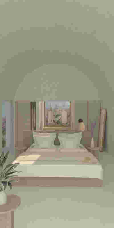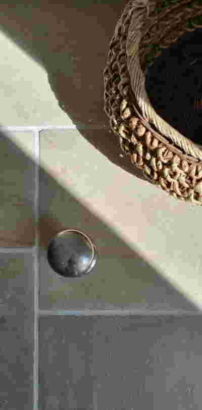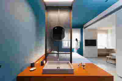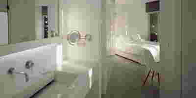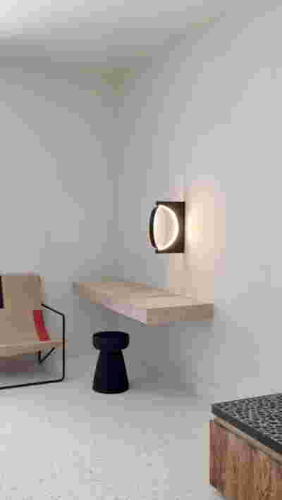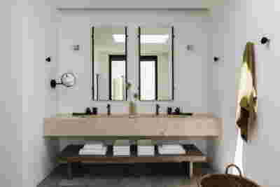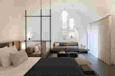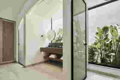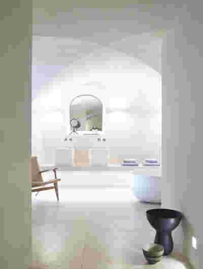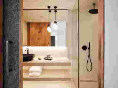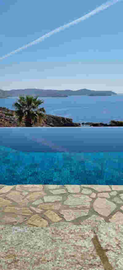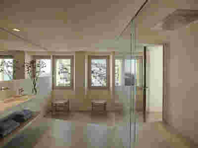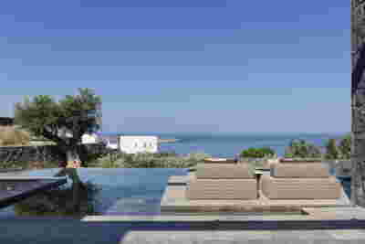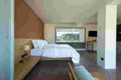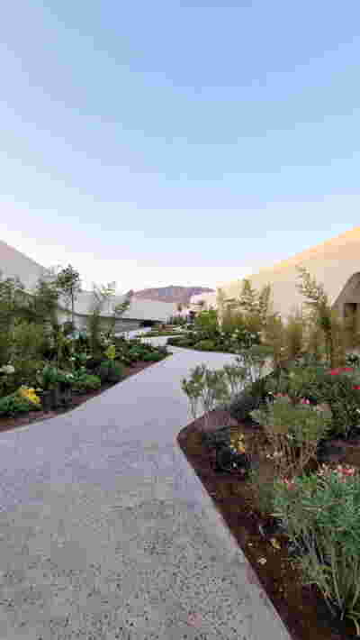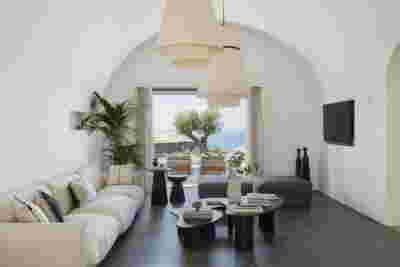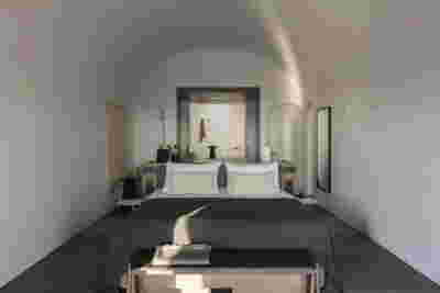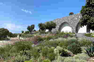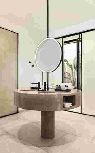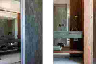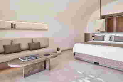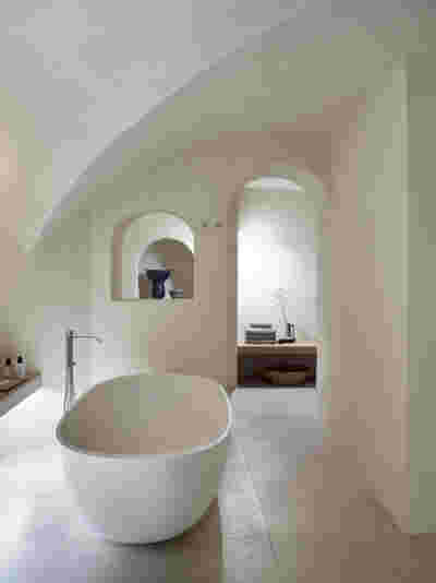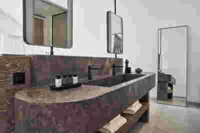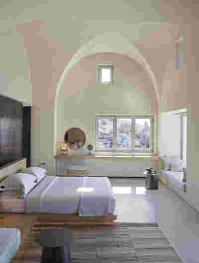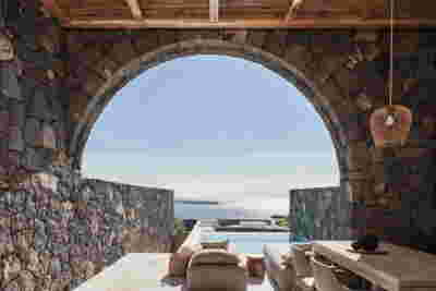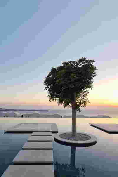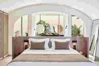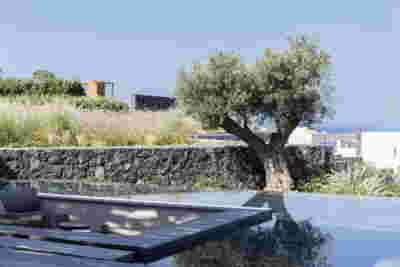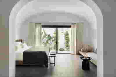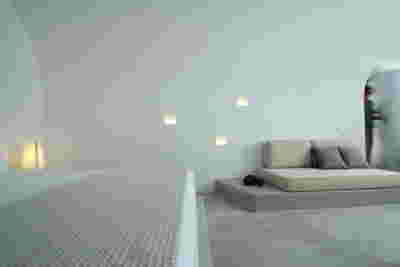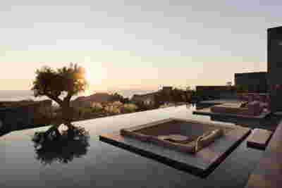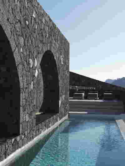 The rooms we designed, the Hideaway Pool Suites, retain elements in common with the first phase of the hotel, in the extensive use of local stone and in the color palette of fabrics, woods and marbles. As one arrives at Epitome and starts walking in the zone that joins the two phases of the hotel, he is walking in an oasis with lush vegetation and sounds of birds. From there the Hideaway Pool Suites remain almost invisible –their retreat into a stepped section justifies their name. In addition, the rooms of the new wing, adapted to the relief of the ground, are mostly subterranean with their planted roofs forming gardens. We didn’t apply the familiar external vault, the architectural icon of Santorini -and we had the same inclination in other hotels we designed in the island such as Santorinini Grace (2010) and Nous (2022). For us the connection with the local architecture is made with the materials, with arches in the free standing stone walls that precede the rooms and with vaults that shape them internally. With its planted roofs, the Epitome extension remains “invisible” both when the visitor enters and from above. The variety in the planting of the roofs underlines the landscape design of the hotel -the rich selection of plants sets Epitome apart in the arid landscape of the island. Segments of this new planted landscape have also been highlighted in the rooms: planted gardens form the backdrop of several rooms and large glazed surfaces unify them with the bathrooms. It is in this zone that double circular mirrors infront of glass, upgrade the deeper end of a room, reflecting the greatest asset of the plot: the sunset and the view towards Thirasia.