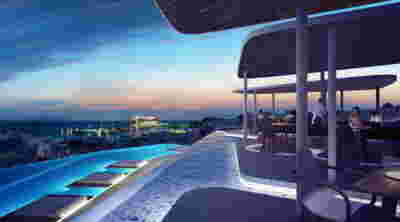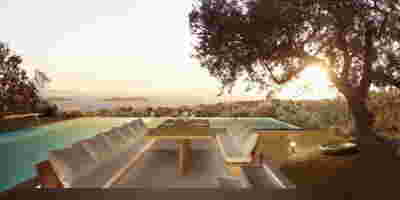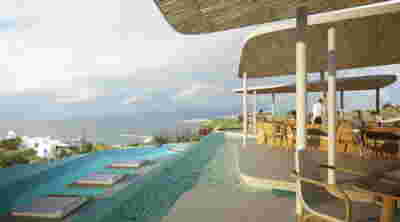 The infinity pool with the pergola overlooks the sunset