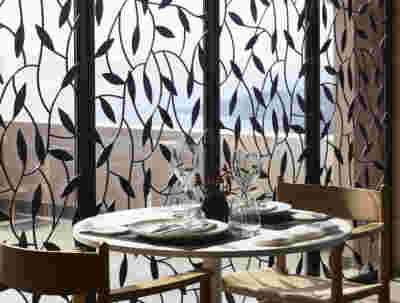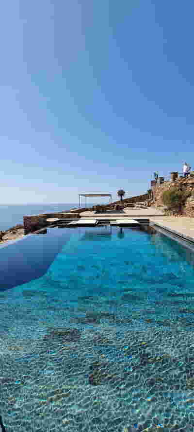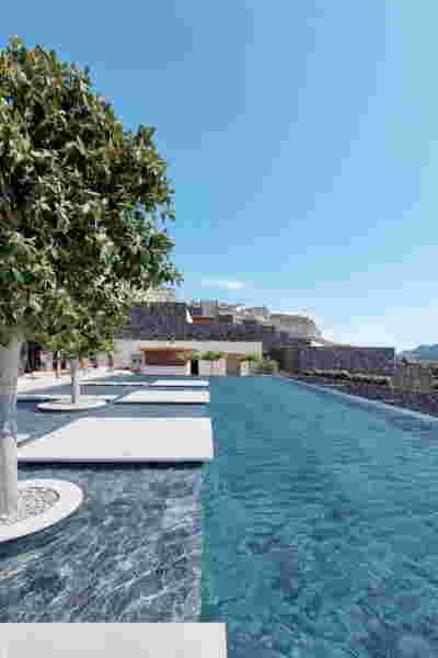The restaurant’s pergola is cantilevered on its three visible sides –its eaves form a strong horizontal line of wood, a modern gesture in contrast to the timeless stone walls around it. And we wanted to combine the familiar typology of pool platforms with what we believe distinguishes Epitome, the planting: that is, to give the character of a garden which is made up of the scattered new trees, metal planters and perimeter planting. Overall, in the Epitome we designed, the landscape takes center stage against the background of local stone masonry walls -it dominates as a wild grass lawn on the roofs of the rooms and, as an acupuncture, with trees at the pool garden.
