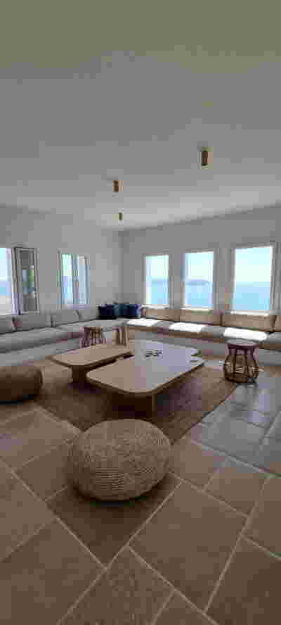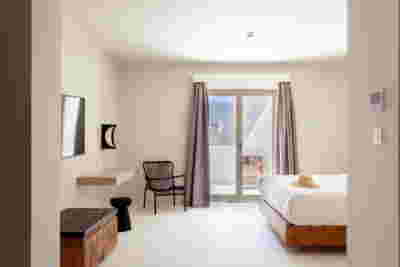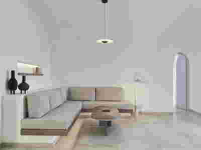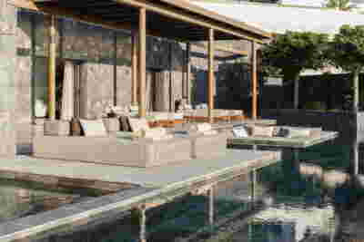 Οn the beach front, the Sand Dune Villas claim a special place in the landscape. They depart from the discreet, “earthy” architecture of the rest of the rooms and stand out more like cabanas upon the beach. Given large autonomous courtyards, you cross your personal garden to reach your door. Their architecture is set to create memorable experiences: Eating in the sunken courtyard with a pool engulfing you, like being on a yacht. Having a shaded yard with aromatic plants that you touch with your fingertips when immersed in the bathtub. Facing the fire on cool days as you ascend the last steps before entering the living room. To be covered with a protruding roof, sharp at its perimeter like obsidian, the glass-like volcanic rock from which the perlite derives from. Smelling the wood on all the walls and having the curtain move from the wind –sensing the summer itself on the beach…