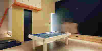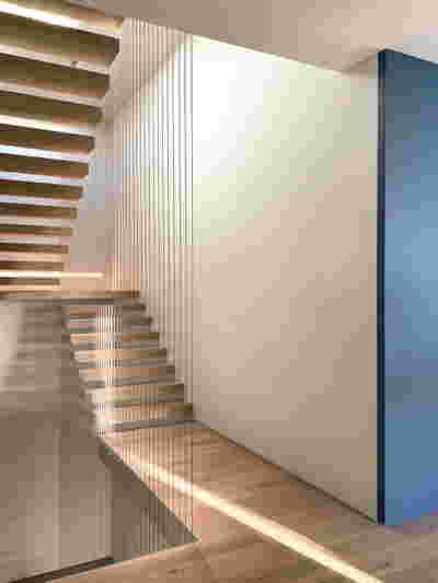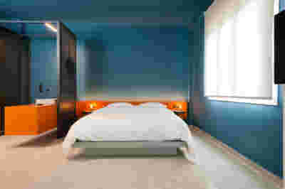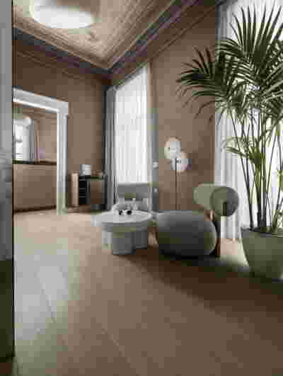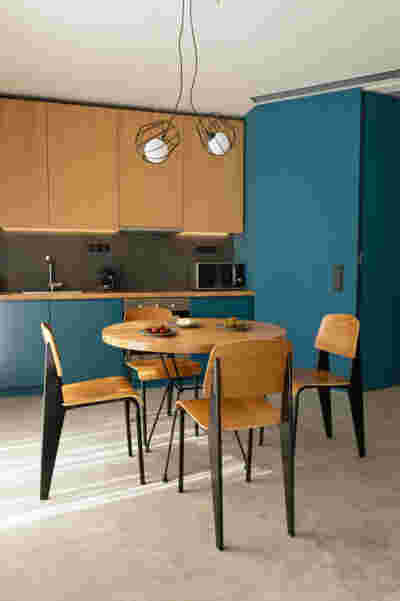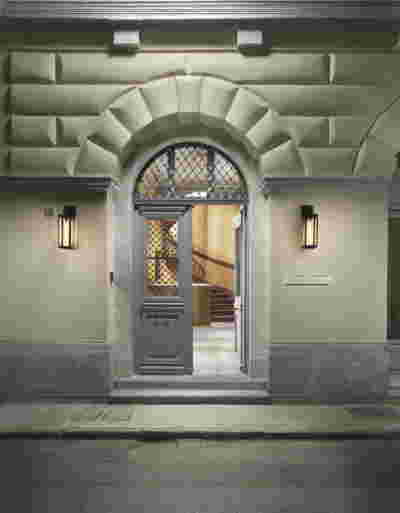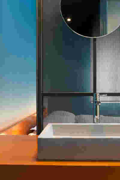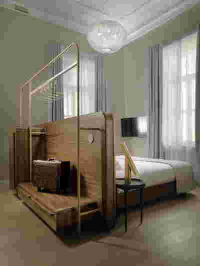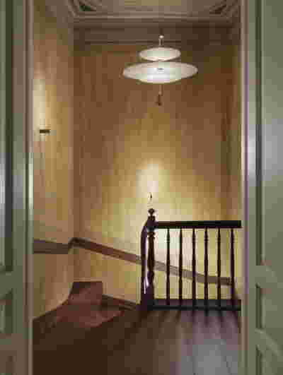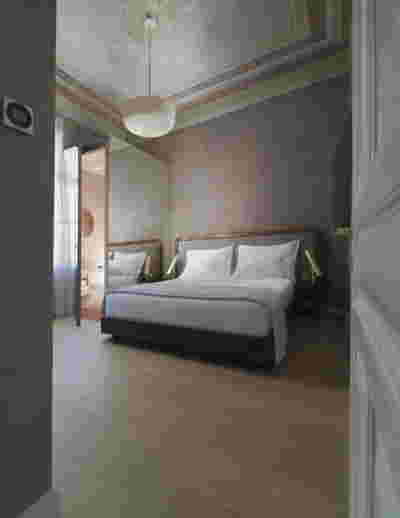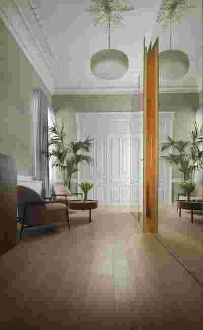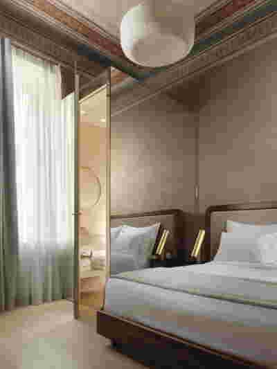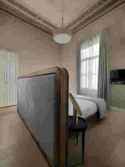 In the internal layout of the hotel, we kept the impressive wooden staircase that connects the ground floor to the first floor. And we even created an identical one in the same place for the descent to the basement. A new vertical staircase and elevator core is placed at the rear of the building to serve all levels. We also maintained a skylight in the separating wall so that the hall to the rooms retains natural light on each level.