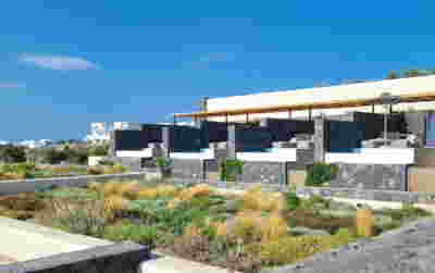 The intervention forms an architecture of landscape: Rooms with planted roofs are assembled on the slope, creating a discreet layering of terraces that seemingly pre-existed. Although the stepped section of the restored perlite mine could be considered as a starting point for the proposal, the new rooms deliberately do not form a recognizable geometry of repetitive curves. They draw inspiration from the neighboring landscape of Milos itself: instead of the legible “organization” and order of a tourist resort, Trencadís’ layout refers to plots and plantings with polygonal or curved outlines that fit together like fabrics on a rug. Thus the hotel is not simply lost within a slope with parallel terraces -it camouflages its own architecture in a planted landscape of irregular geometry. With planted terraces interjected and orientating rooms to different sections of the panoramic view, one is actually inhabiting the very landscape of Milos.