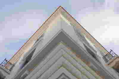For the inspiration from the listed façade, we focused on its details. Indeed, something unique has initially escaped our attention: a garland of laurel leaves was repeated three times above its windows. Initially when we singled out this decorative element as a starting point to form a new facade texture, we did not realize the quiet coexistence of this small detail within architecture. But then, gradually, we began to recognize it in other places as well: carved on a marble lintel on Prassa Street or in a plaster version of it, on the axis of a façade on Patision Street, opposite the Polytechnic University. These had become simplified, flat versions of the laurel band which used to decorative primarily semicircular mouldings: the torus at the base of a column as applied to Trajan’s column or the extensive golden mouldings on the frames of the vaults designed by the architect E. M. Barry in National Gallery in London.