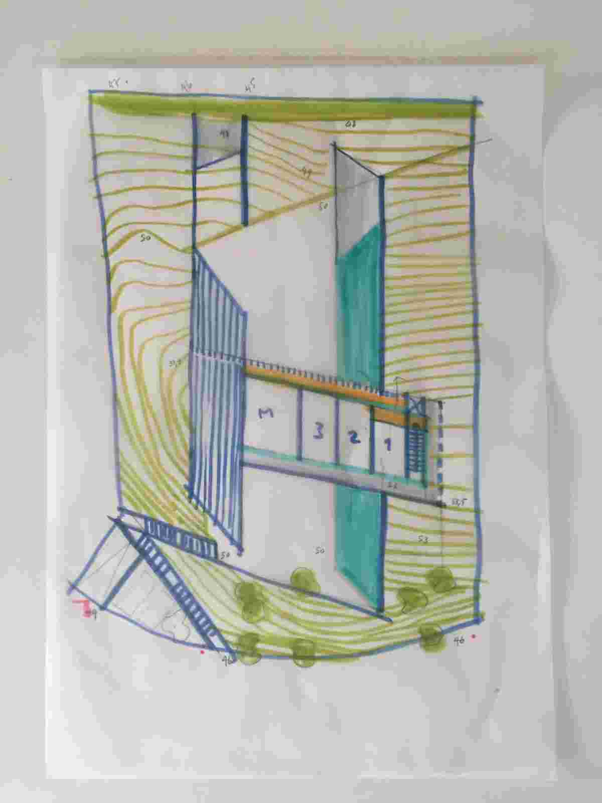 ntitled, engravings by Marita Nikoloutsou. A concrete bridge captures the imagination of the architect and gives the necessary pretext for bands of lines to meet in the diagonal, as seen in perspective, from the down below. Similar origami-like endings are pursued fearlessly in the design of the house, as if