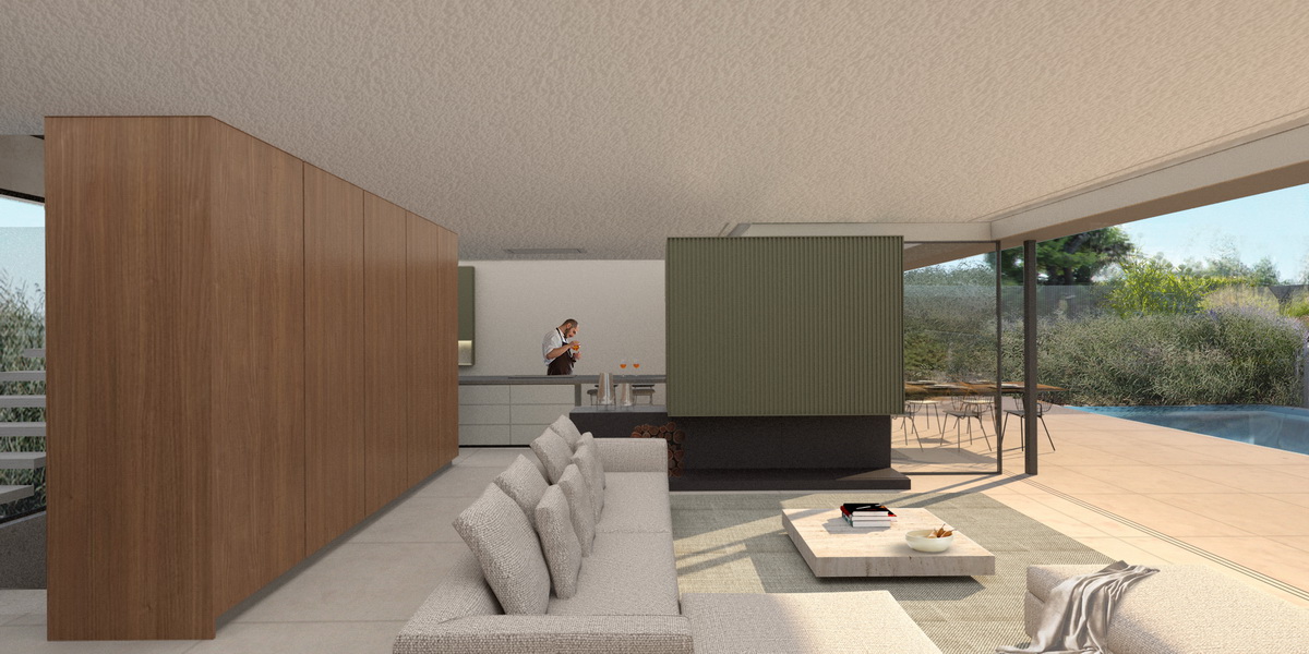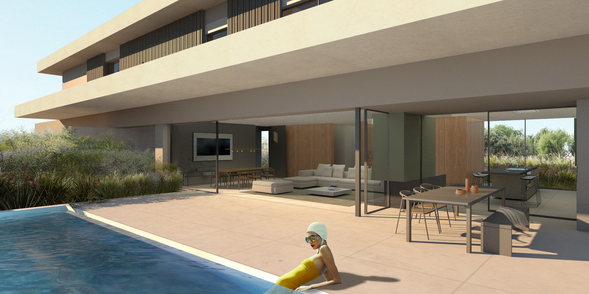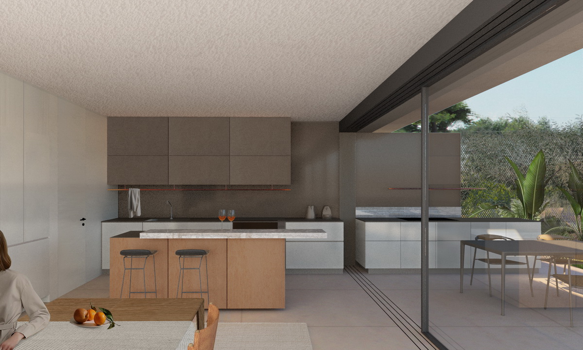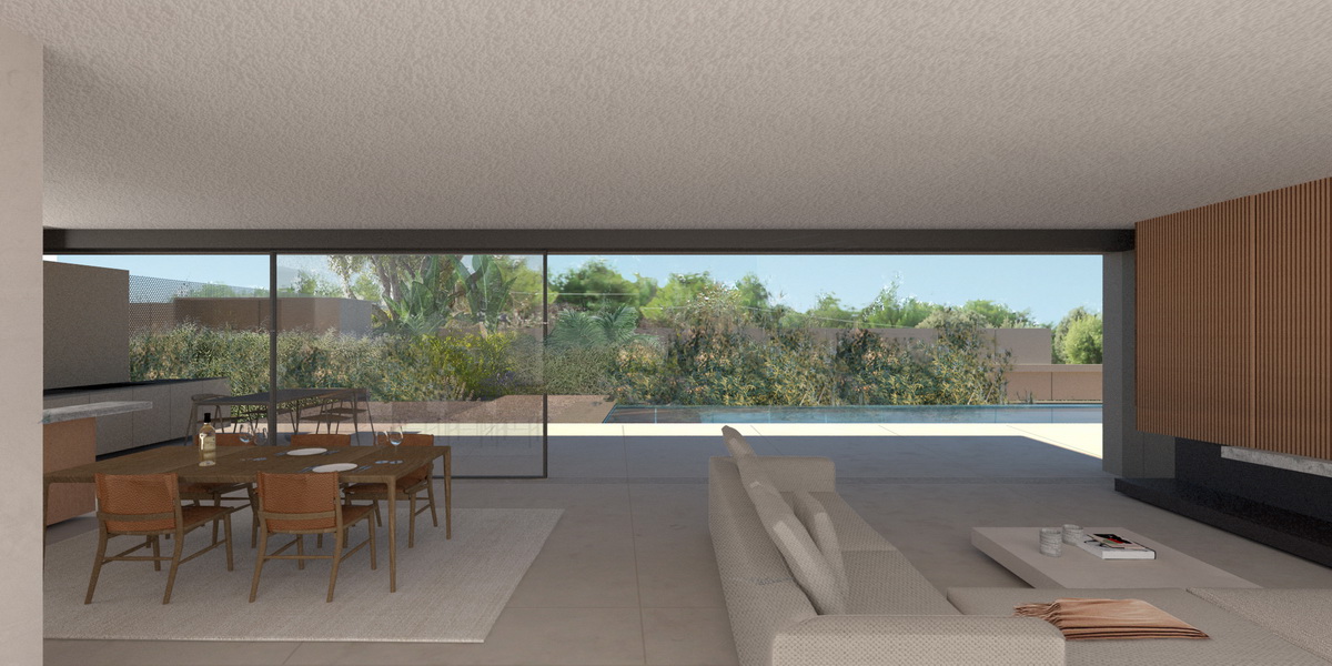 A key question in this apartment building was how to create two equal homes within a single envelop. In other words, from the beginning the concept was how not to form two autonomous, repetitive dwellings within the plot -so the proposal adopted large horizontal slabs that underline the length of the plot facing the neighboring park. While formal integration is sought, at the same time, functional autonomy is preserved –entry to each house is separate, avoiding a common staircase: One is placed on the narrow side of the plot and the other on the front side -the latter is the one that aligns with a void between the houses, a planted entrance yard that discloses the whole depth of the plot. As a consequence of the different access paths, floor plans do differ, both in the layout and the staircases -maintaining each time large, south facing openings towards the park. On the first floor, bedrooms are differentiated from the ground floor’s glass openings with vertical blinds along the entire length of the facade.