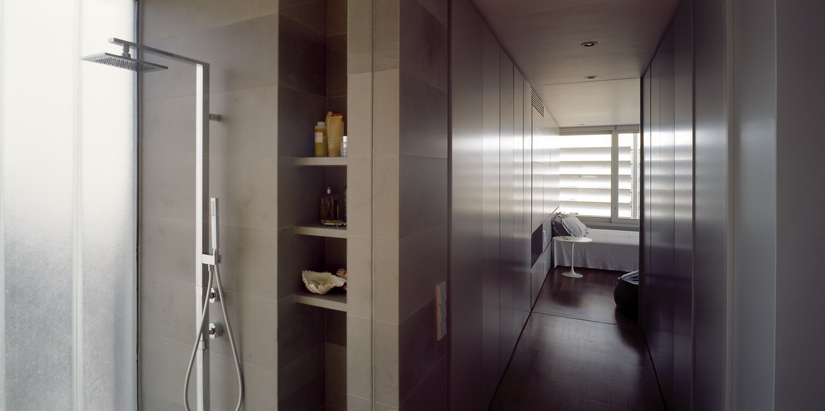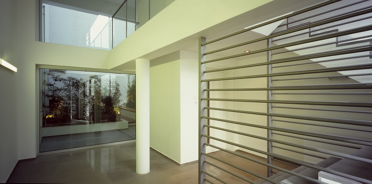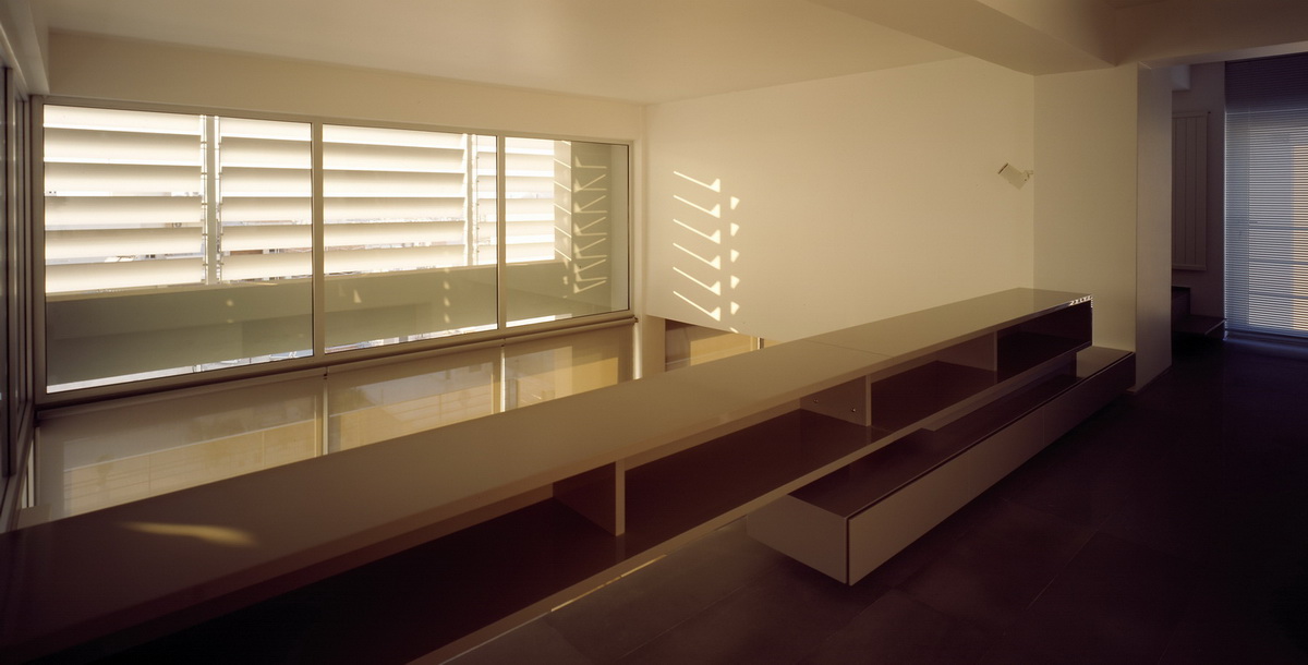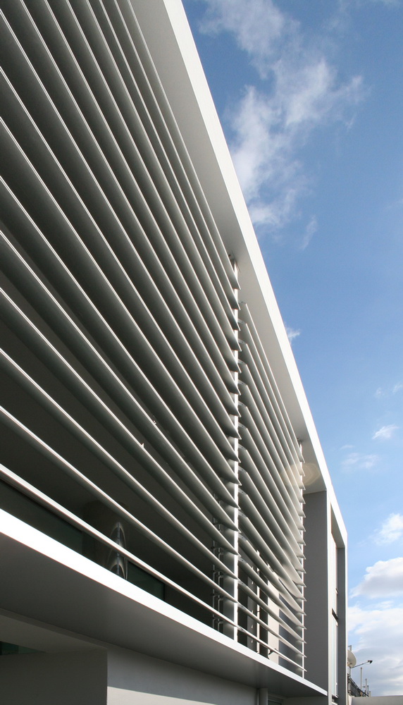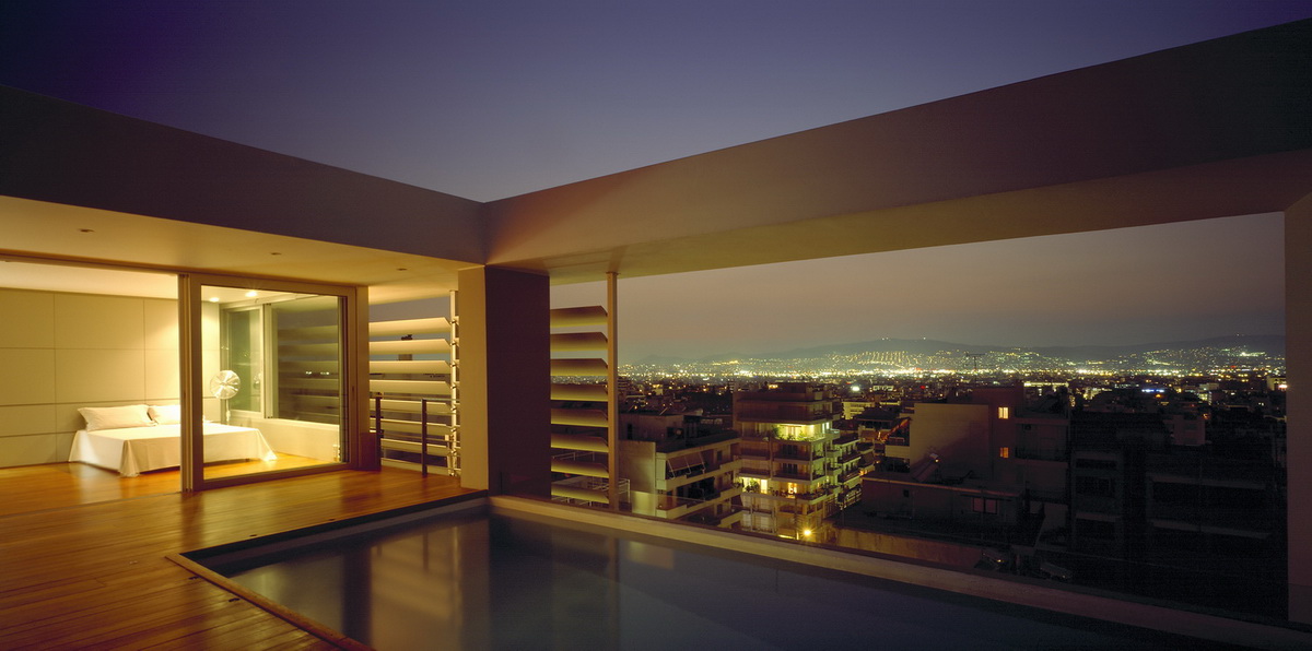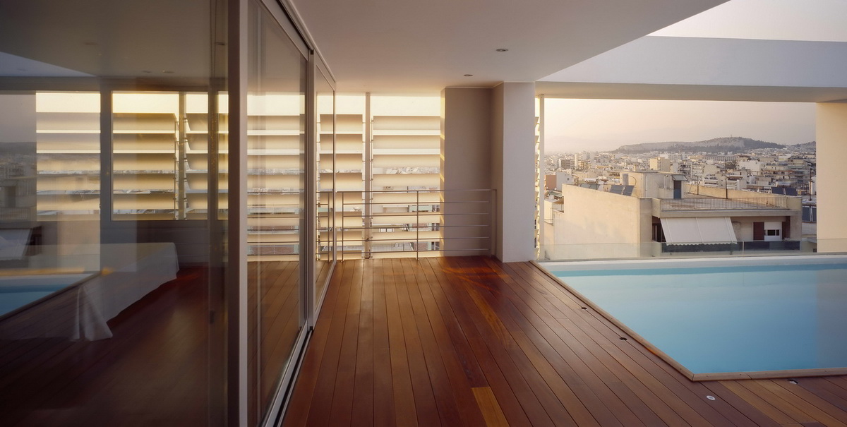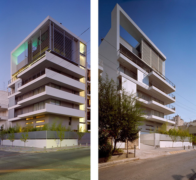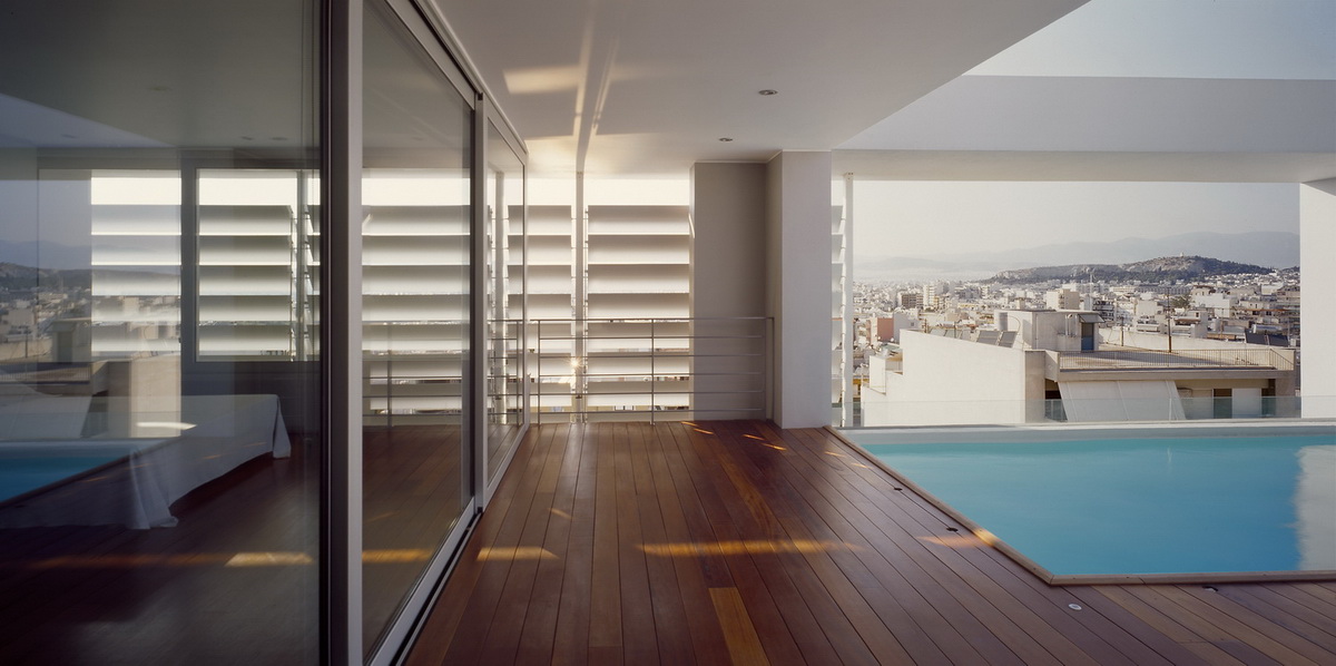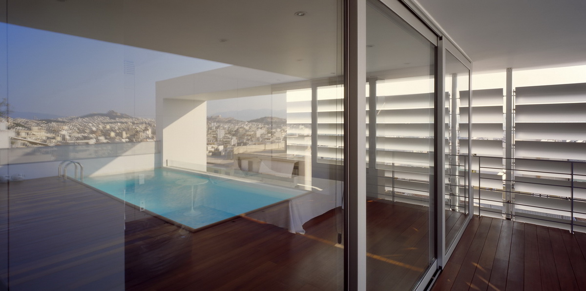 This apartment building occupies a corner site and has been designed so as to allow the apartments to connect equally to the two streets as well as to the back garden. The staircase has been placed on the side so as to allow on the ground floor a visual connection with the garden on the backyard. This corner arrangement allows the staircase to be clearly defined from the street, demarcated by a vertical zone of u-glass, a departure from the ill-lit circulation cores of conventional apartment buildings. The apartment building in Nea Smirni comprises of three typical apartments, a double height ground floor studio, as well as a three storied top apartment. This last apartment, defined by a series of horizontal blinds, has a pool adjacent to the master bedroom as well as a balcony that overlooks the double height living areas. The last floor with the pool and master bedroom frames an impressive view of the Acropolis.