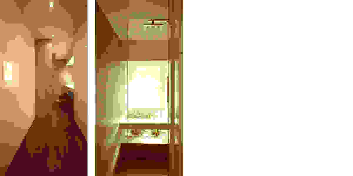 This apartment occupies the ground and first floor of an apartment building that we designed in Nea Smyrni, Athens. The autonomous entry to this apartment is made through a ramp. Upon entry, one encounters the apartments’ double height space corresponding to the living room area. The marble floor of the living room area is almost equal with the deck of the inner courtyard, a wooden floor that protrudes in the apartment serving as an extended landing for the staircase that leads to its first floor. In the single height area of the ground floor, the dining room and kitchen area are to be found. The fireplace is formed by two parallel slabs of concrete –it is embedded in a gypsum board wall that includes slots for air-conditioning and lighting. The bed on the first floor is kept at a distance from the inner balcony so as to secure privacy for the owners upstairs. Apart from the bed, no other furniture is meant to occupy the first floor –wardrobes are meant to occupy the perimeter of the space, demarcating the bath area.