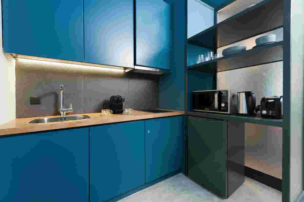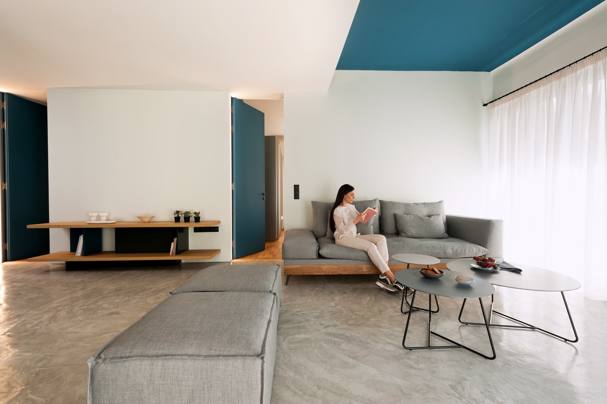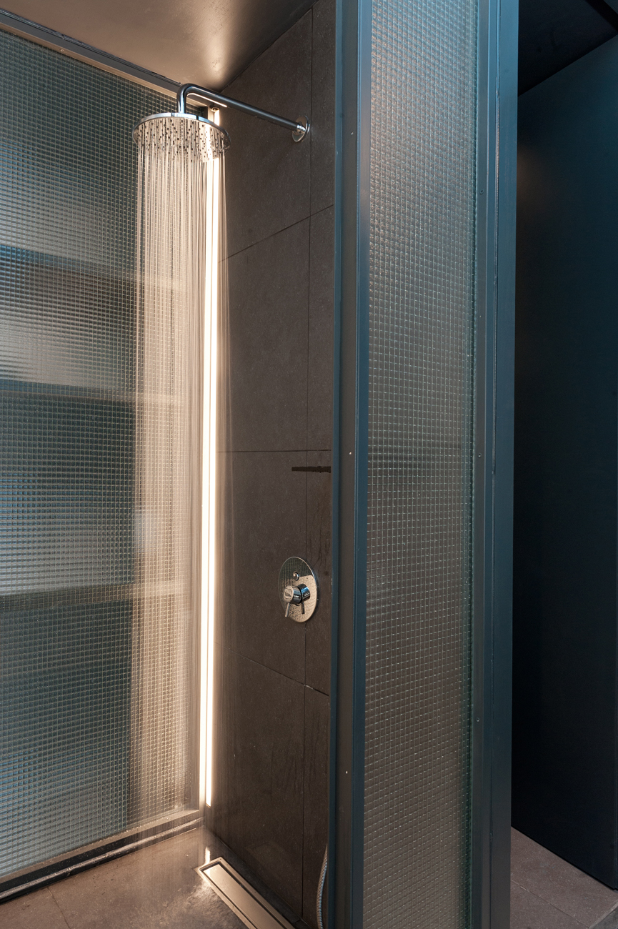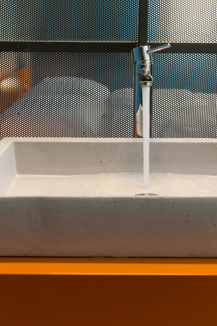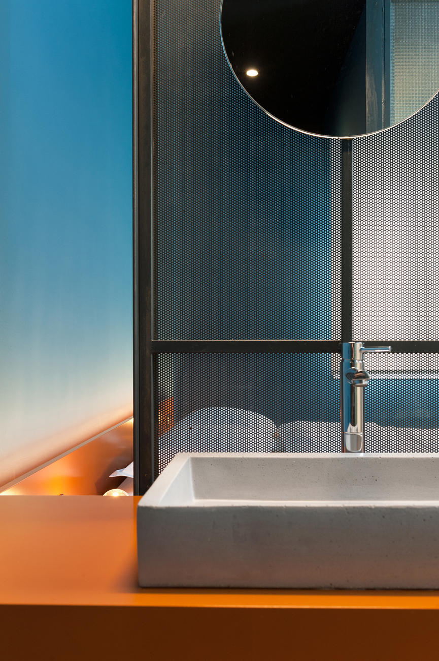 This 50s apartment building is distinguished by its variety of uses: It is very close to the most central square in Athens, Syntagma Square and this explains its liveliness, particularly noticeable as you go up to the 4th floor, reaching the renovated apartment -the succession of open doors, workshops, commercial uses emulate a city that has entered the building. The block of flats is the acute end of a building block, which gives plenty of light on its three sides, but at the same time results in the trapezoid shape of the floor plan. In the zone that leads to the small alleyway in the back, the lighting gradually decreases significantly, so it was decided to remove all the internal walls and insert into that zone a freestanding bath. The differentiation of this “island” is also emphasized by the way it is made: with metallic frames and reinforced glass it forms both the shower and the back of the kitchen. In the same sense, the wash basin is placed in cantilevered orange bench that is a continuation of the wooden headboard of the bed. Similarly cantilevered are the bedside tables on either side of the bed –made of a circular section with reinforced glass, they are fixed at a short distance from the headboard itself.