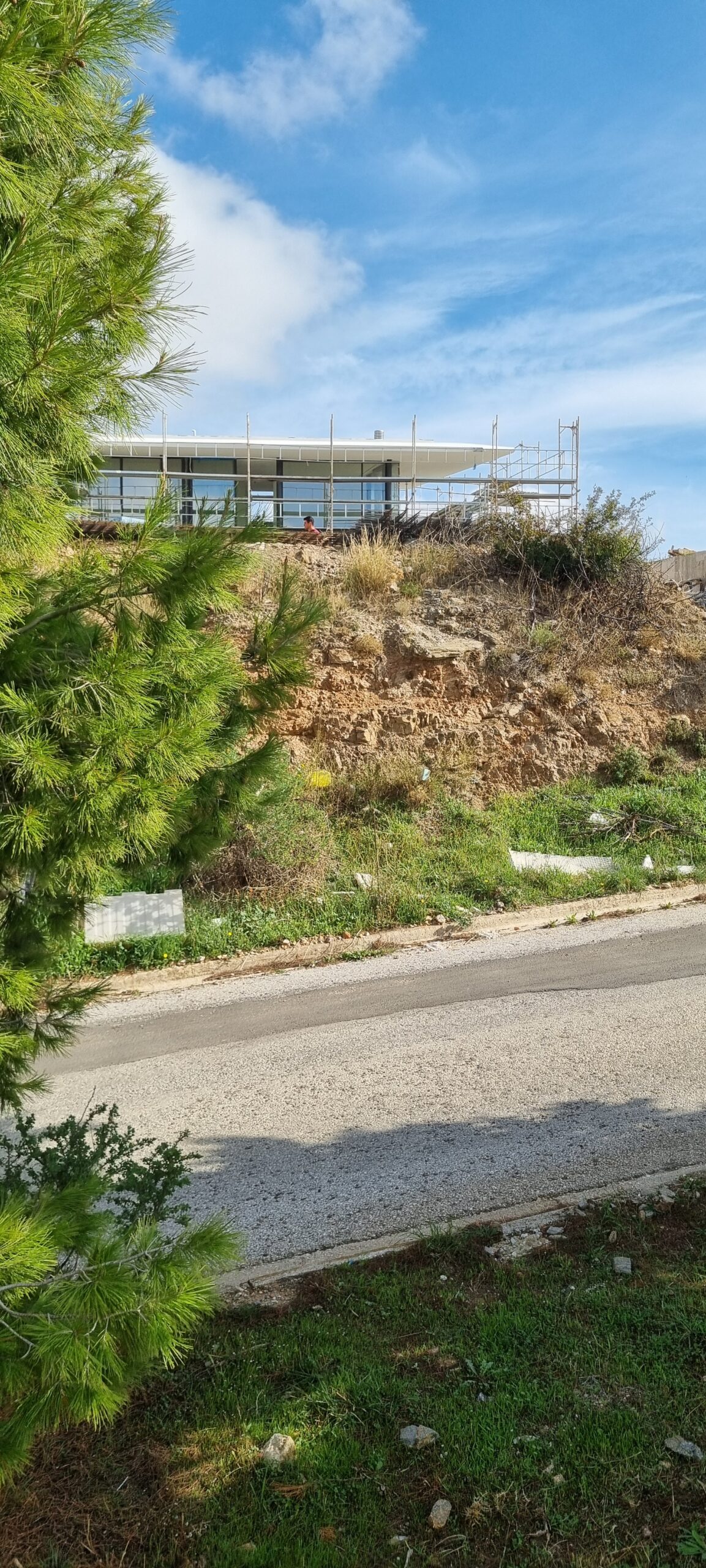 ntitled, engravings by Marita Nikoloutsou. A concrete bridge captures the imagination of the architect and gives the necessary pretext for bands of lines to meet in the diagonal, as seen in perspective, from the down below. Similar origami-like endings are pursued fearlessly in the design of the house, as if