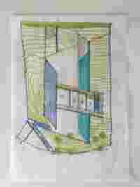 Similar origami-like endings are pursued fearlessly in the design of the house, as if foreshortenings were in effect. Even the roof was inclined so as to conform with local building regulations -laws that aspired to produce a more vernacular, roof tiled outline for the neighborhood.