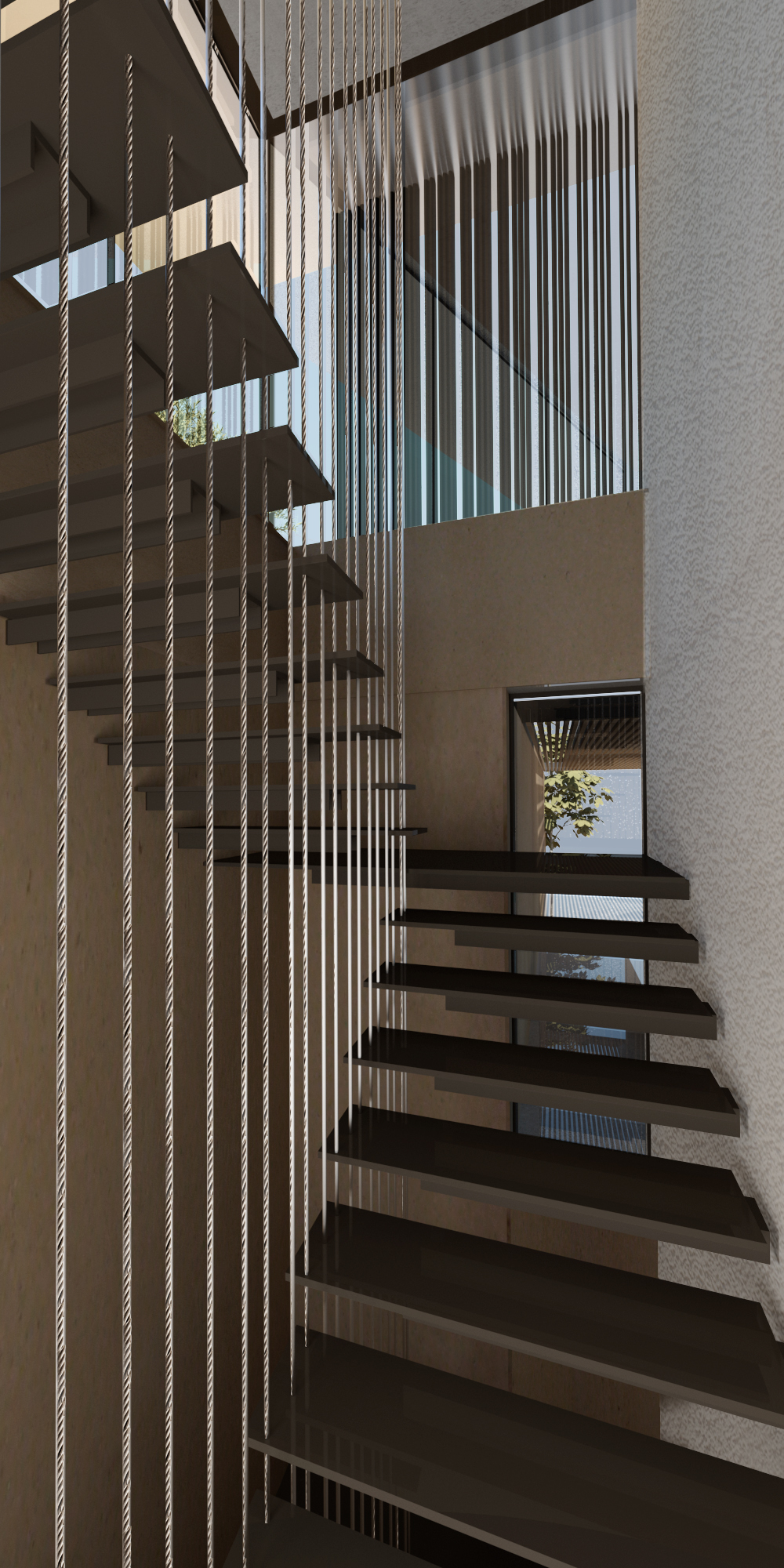Our proposal for this duplex has eschewed repetitive balconies at the perimeter (the trademarks of the Polykatoikia, the omnipresent Athenian apartment building). The narrow façade of our building, due to its monolithic massing, achieves an ambiguity of scale as well as visual privacy from the two adjacent apartment buildings -the owners requested this early on, since those are the only tall buildings in the neighborhood, while the rest remain one and two-story houses. At the terrace of the new penthouse, we placed a jacuzzi, so as to mirror the living room’s fireplace, one featuring a glass back.