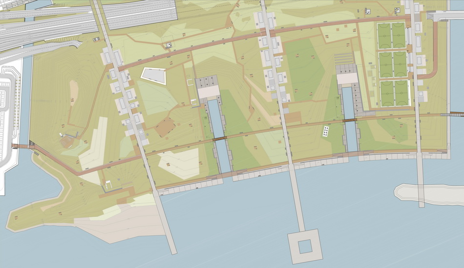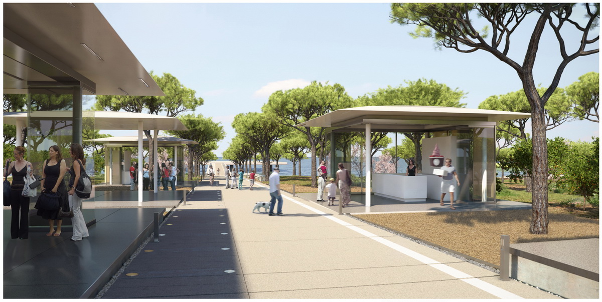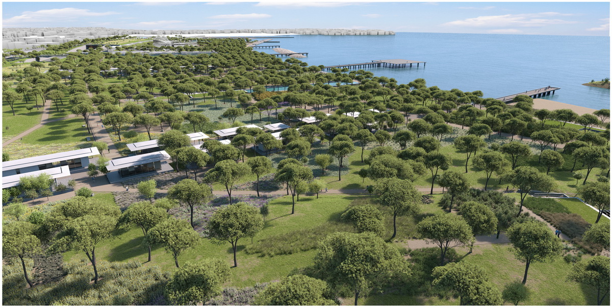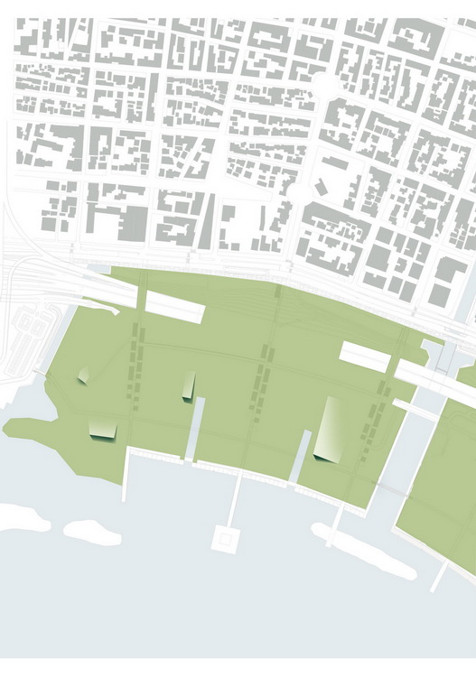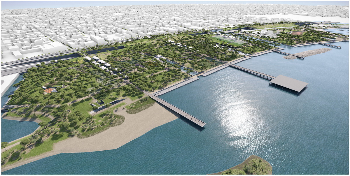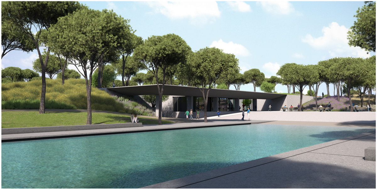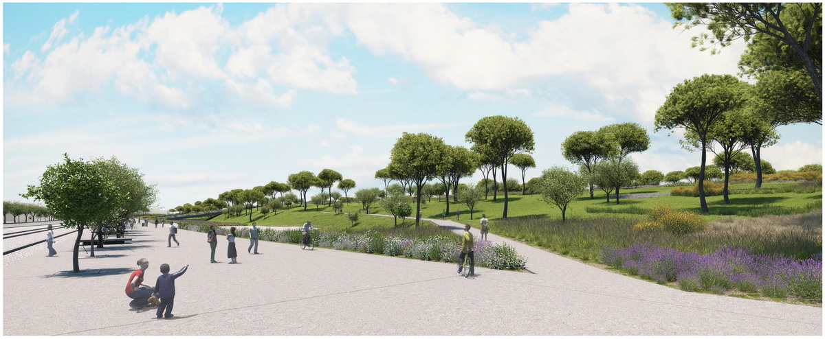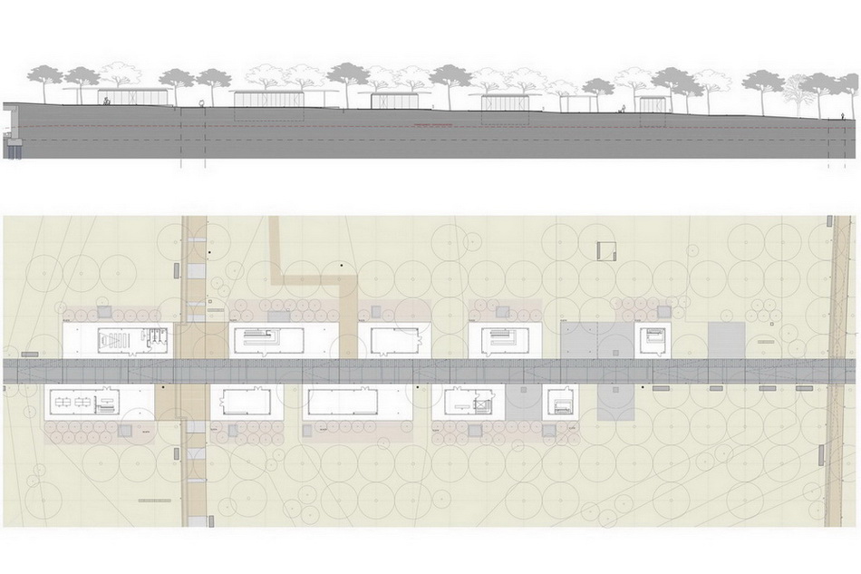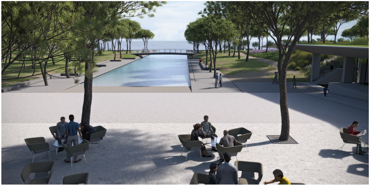 Οne of the most crucial interventions in Athens, this park reestablishes the lost connection of the city to the sea. Lines trace this dynamic dialogue: linear water elements extend within the park while transparent buildings line along five axis that form piers on the seafront. These connect the city over the proposed coverage of the highway –from that point the gradual inclination of the ground towards the sea houses the rest of the buildings, which half buried, disclose their slender planted roofs. The grid of the free standing buildings on the axis defines the placement of trees within a Mediterranean waterfront.