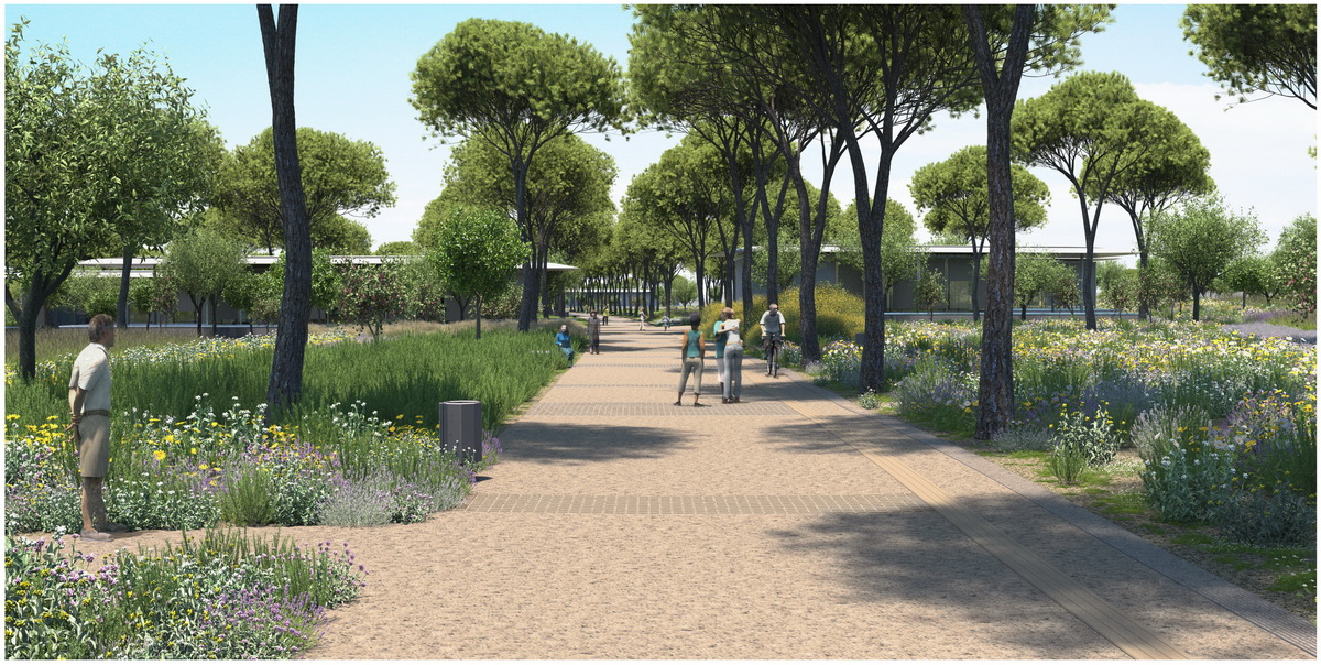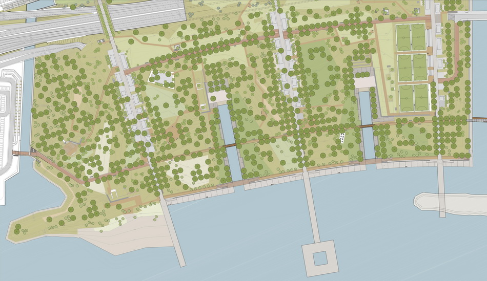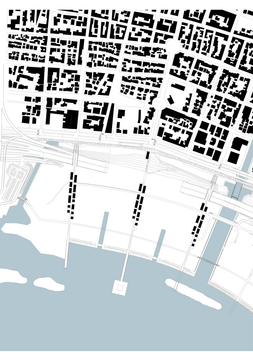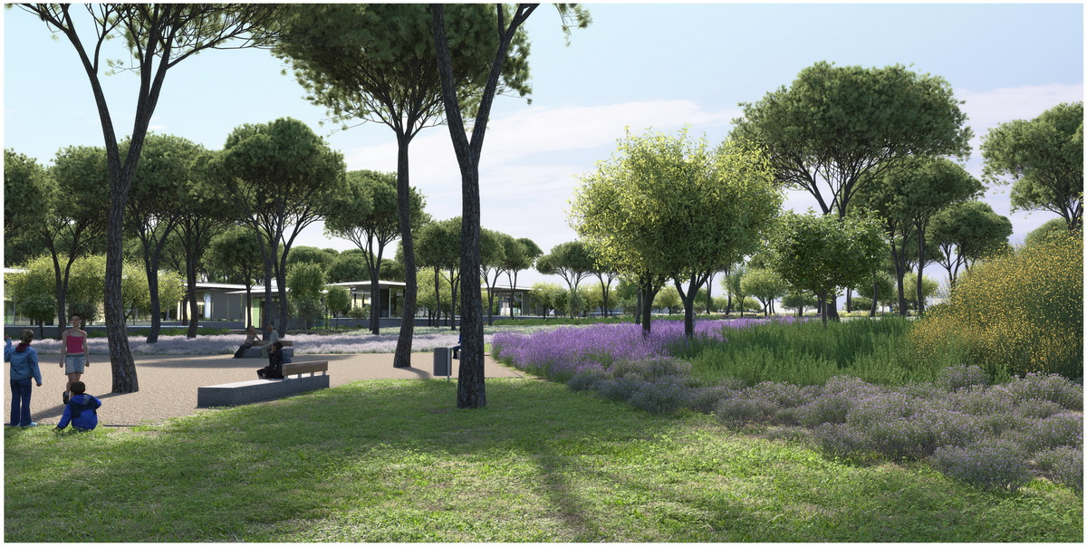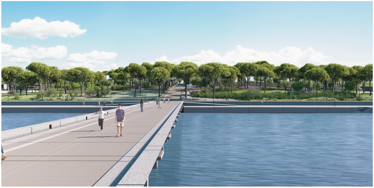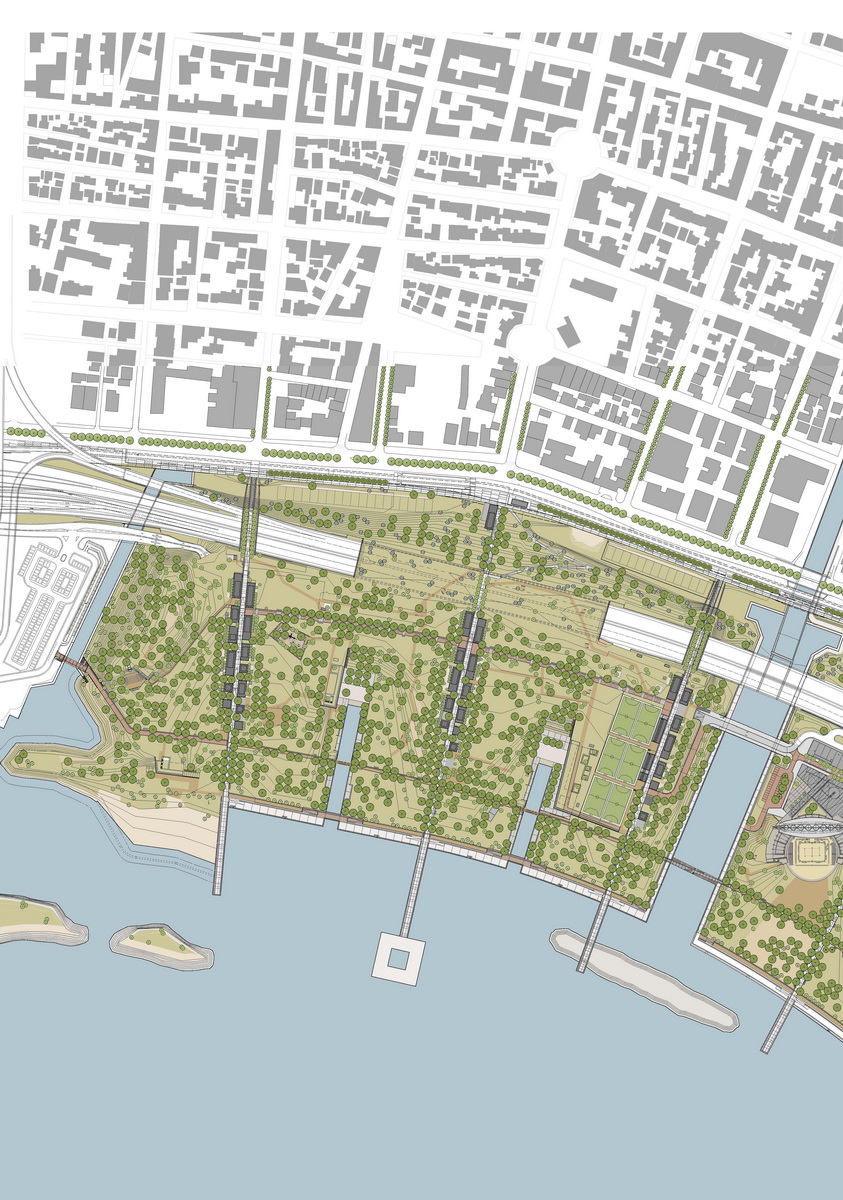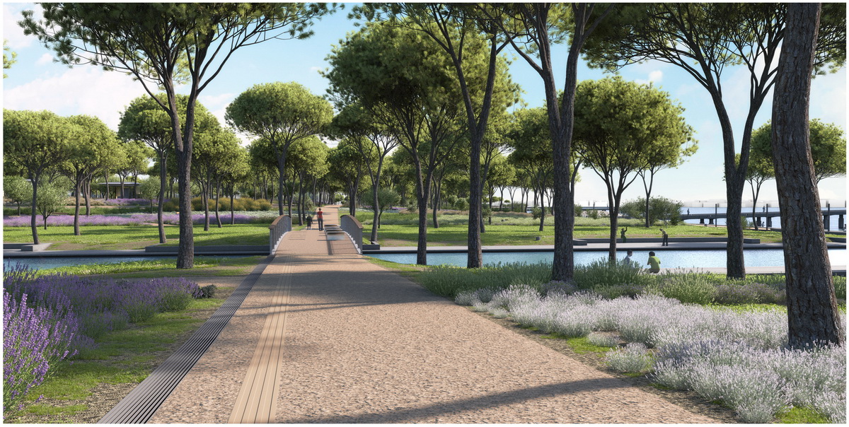 Οne of the most crucial interventions in Athens, this park reestablishes the lost connection of the city to the sea. Lines trace this dynamic dialogue: linear water elements extend within the park while transparent buildings line along five axis that form piers on the seafront. These connect the city over the proposed coverage of the highway –from that point the gradual inclination of the ground towards the sea houses the rest of the buildings, which half buried, disclose their slender planted roofs. The grid of the free standing buildings on the axis defines the placement of trees within a Mediterranean waterfront.