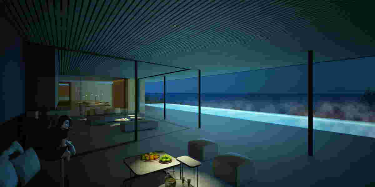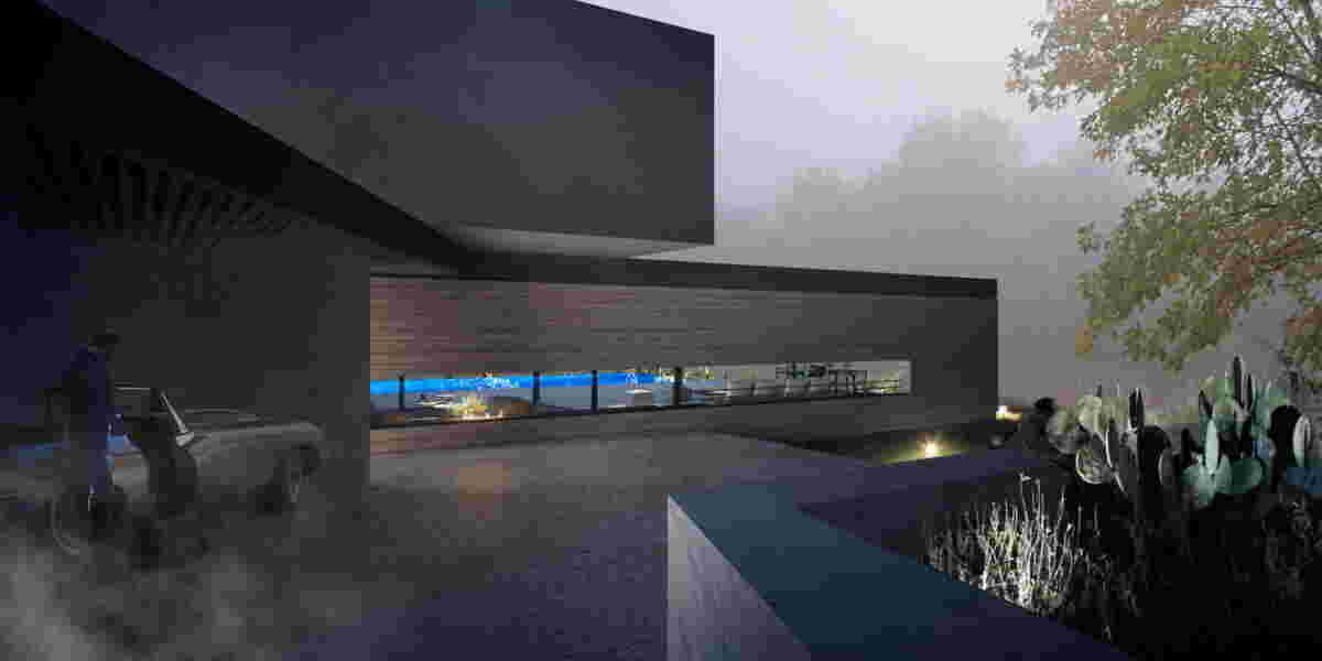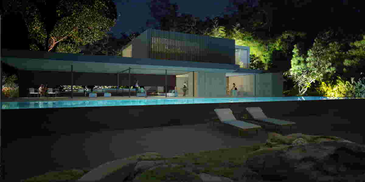 We are imagining a cold winter night. The exhaust of the car after ignition at the driveway, the dewiness of the surrounding forest, the glistening pool at the background and the flames of the glass fireplace, built in the street façade. This overlapping of fire and water creates a layered image where the limits of hot and cold are blurred: the heated outdoor pool’s evaporation replicates the effect of warmness at the background. In this residence that spans parallel to the coast in Chalkidiki, a pergola extends to all sides of the house, accommodating vehicle entry, parapet for guests, living room’s roof and outdoor shaded areas. The bedroom areas at the upper floor retain a completely blank façade towards the guest who upon entry, descends gradually within the sloped landscape.