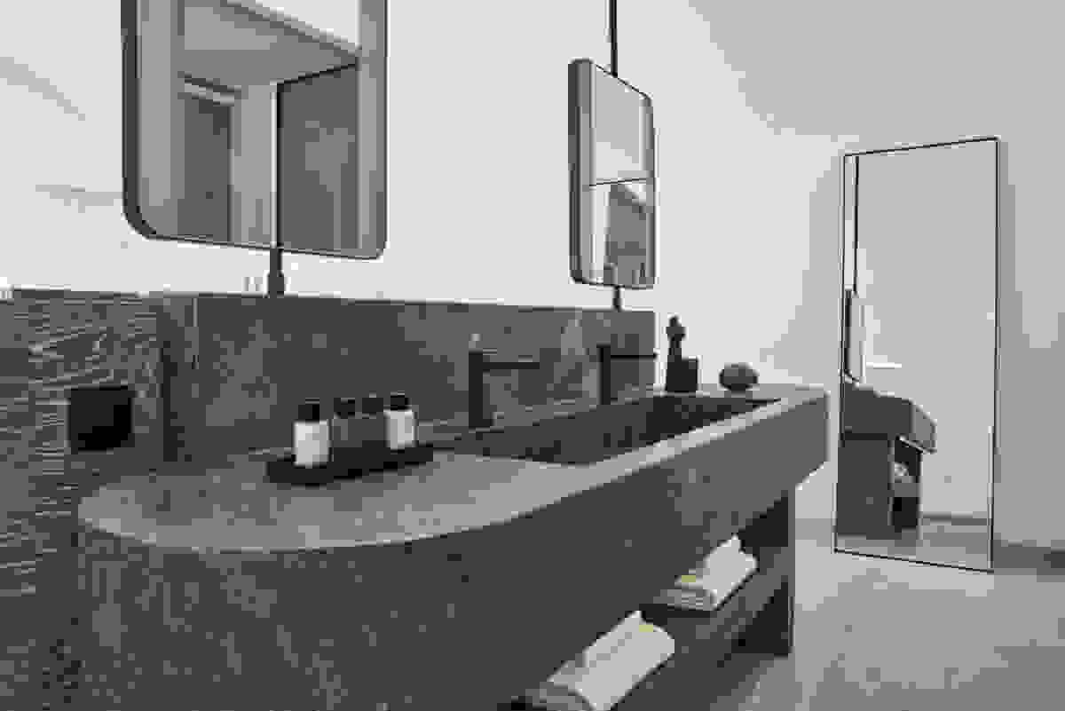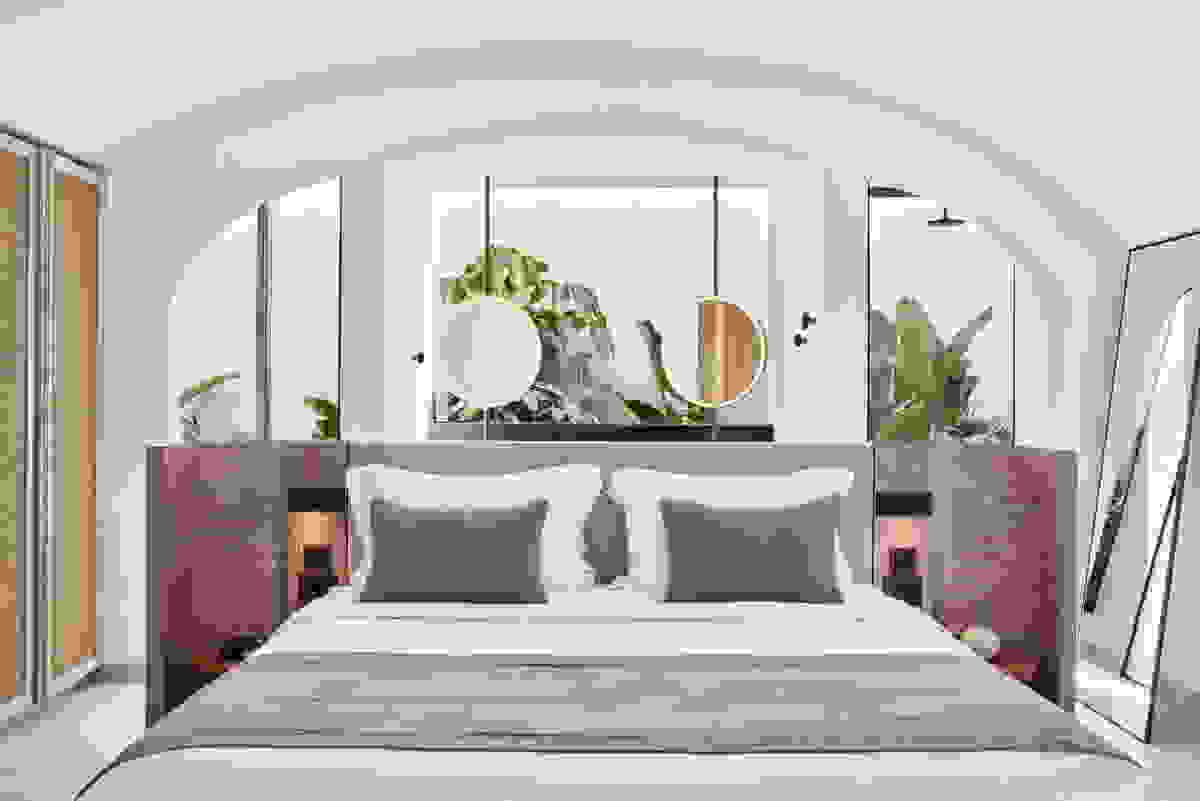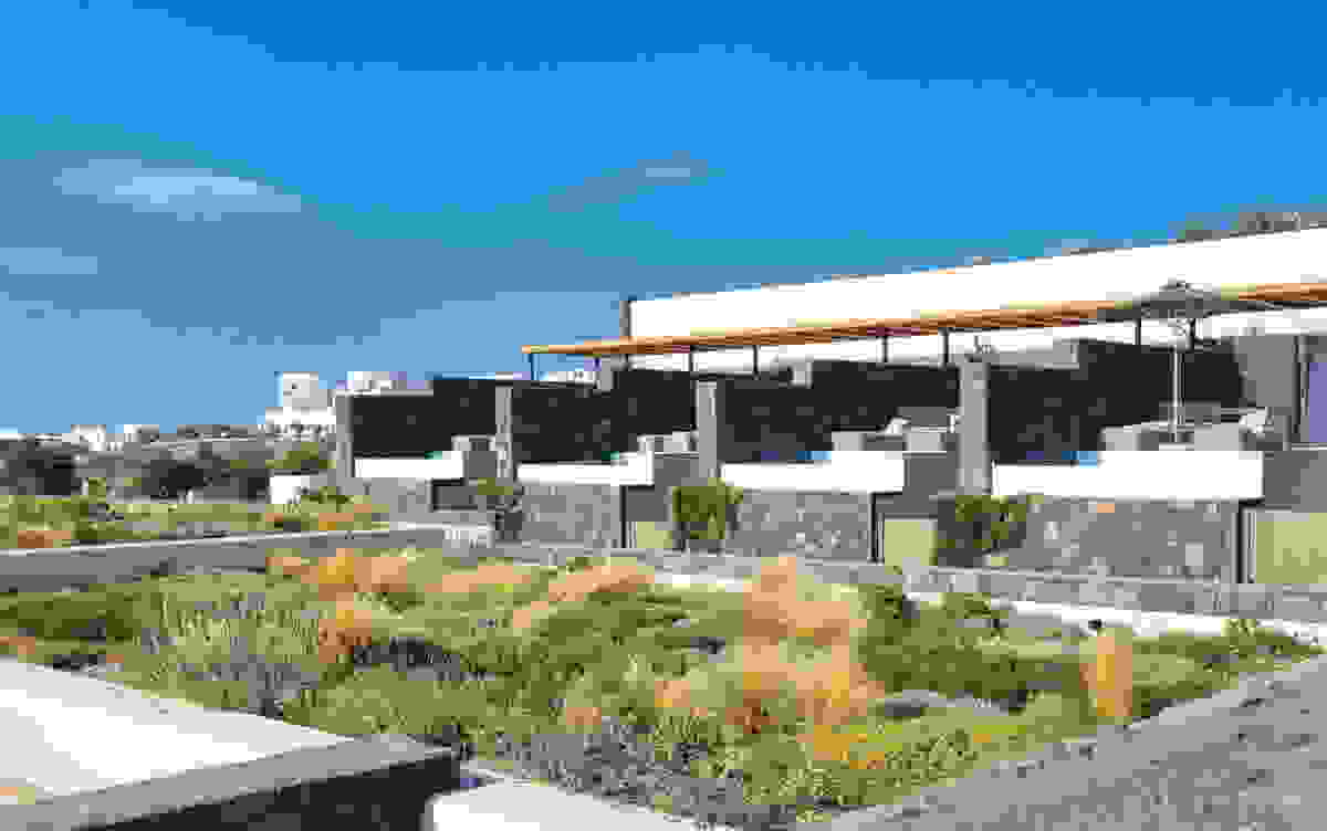 The rooms we designed, the Hideaway Pool Suites, retain elements in common with the first phase of the hotel, in the extensive use of local stone and in the color palette of fabrics, woods and marbles. As one arrives at Epitome and starts walking in the zone that joins the two phases of the hotel, he is walking in an oasis with lush vegetation and sounds of birds. From there the Hideaway Pool Suites remain almost invisible –their retreat into a stepped section justifies their name. In addition, the rooms of the new wing, adapted to the relief of the ground, are mostly subterranean with their planted roofs forming gardens. We didn’t apply the familiar external vault, the architectural icon of Santorini -and we had the same inclination in other hotels we designed in the island such as Santorinini Grace (2010) and Nous (2022). For us the connection with the local architecture is made with the materials, with arches in the free standing stone walls that precede the rooms and with vaults that shape them internally. With its planted roofs, the Epitome extension remains “invisible” both when the visitor enters and from above. The variety in the planting of the roofs underlines the landscape design of the hotel -the rich selection of plants sets Epitome apart in the arid landscape of the island. Segments of this new planted landscape have also been highlighted in the rooms: planted gardens form the backdrop of several rooms and large glazed surfaces unify them with the bathrooms. It is in this zone that double circular mirrors infront of glass, upgrade the deeper end of a room, reflecting the greatest asset of the plot: the sunset and the view towards Thirasia.
