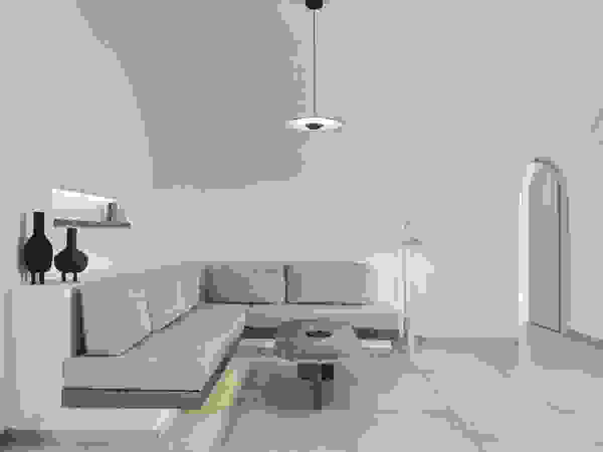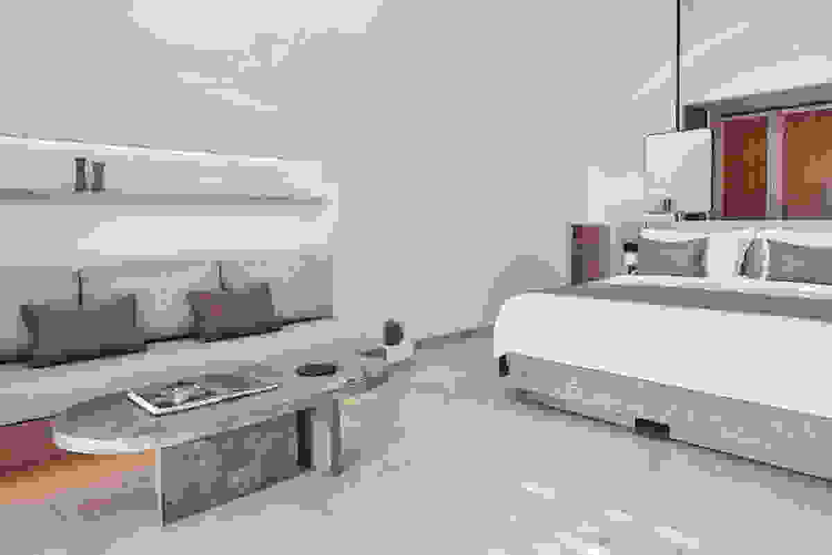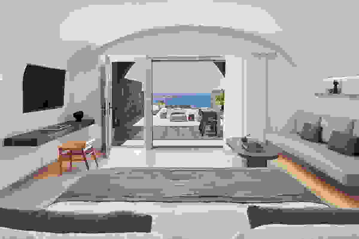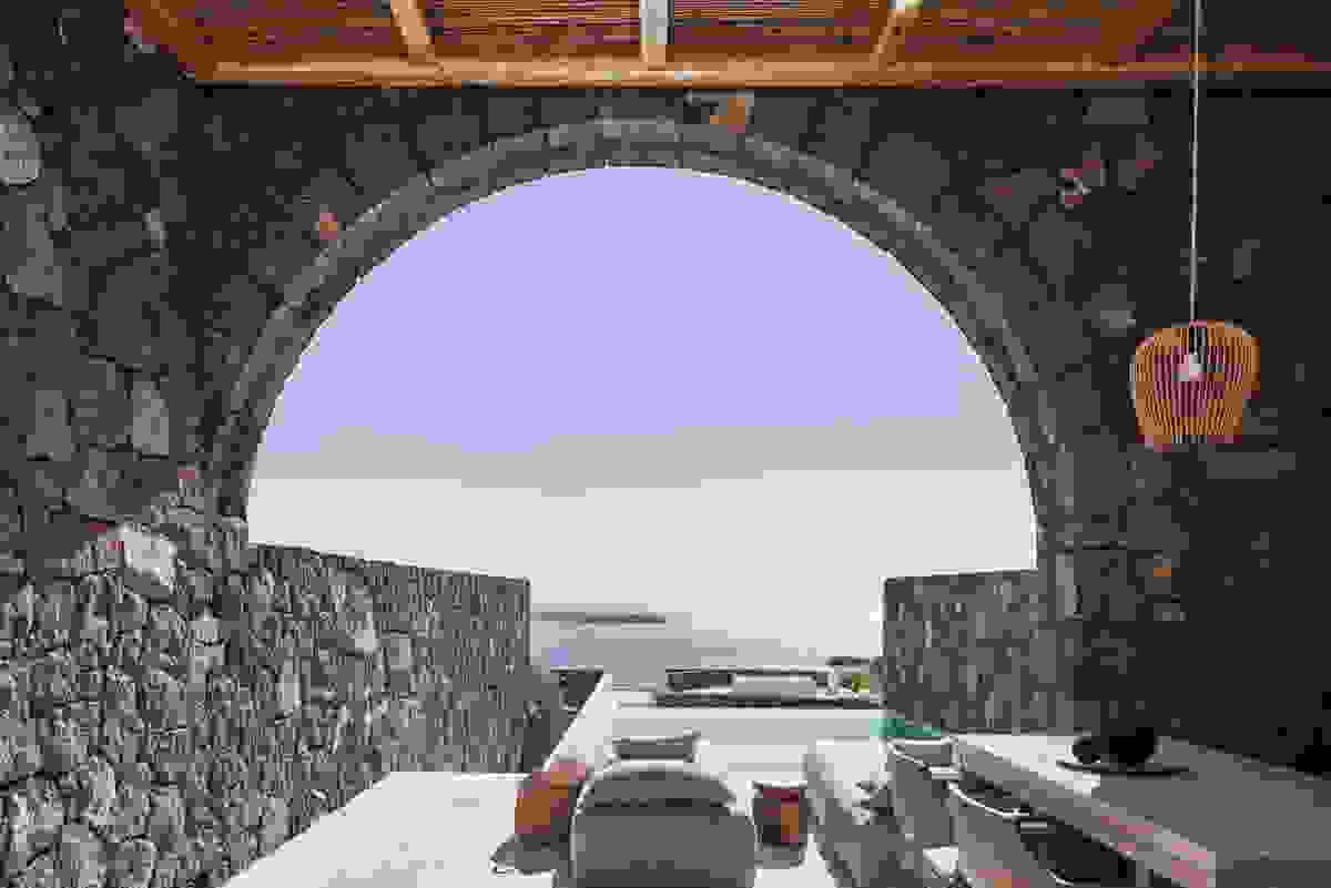 Although built in two consecutive phases, Epitome represented from early on a shift in relation to all the other accommodations of the Canaves company that were located at the Caldera: instead of the white plastered aesthetic, it had chosen stone walls and natural materials. After all, the conditions of this plot were different -it had a large surface area, a vehicular road on one side and almost no neighboring buildings. So instead of the cramped plots in Caldera, with its irregular properties on vertiginous slopes, in Epitome extreme privacy is offered by extending parallel stone walls on the East-West axis. This organizing principle was set into place even from the first, western, phase of the hotel, one that was completed by K-Studio in 2018. We decided to retain this repetition of linear elements as the connecting element between the second phase we designed to the east, behind and higher than the first phase that was already completed further west.
