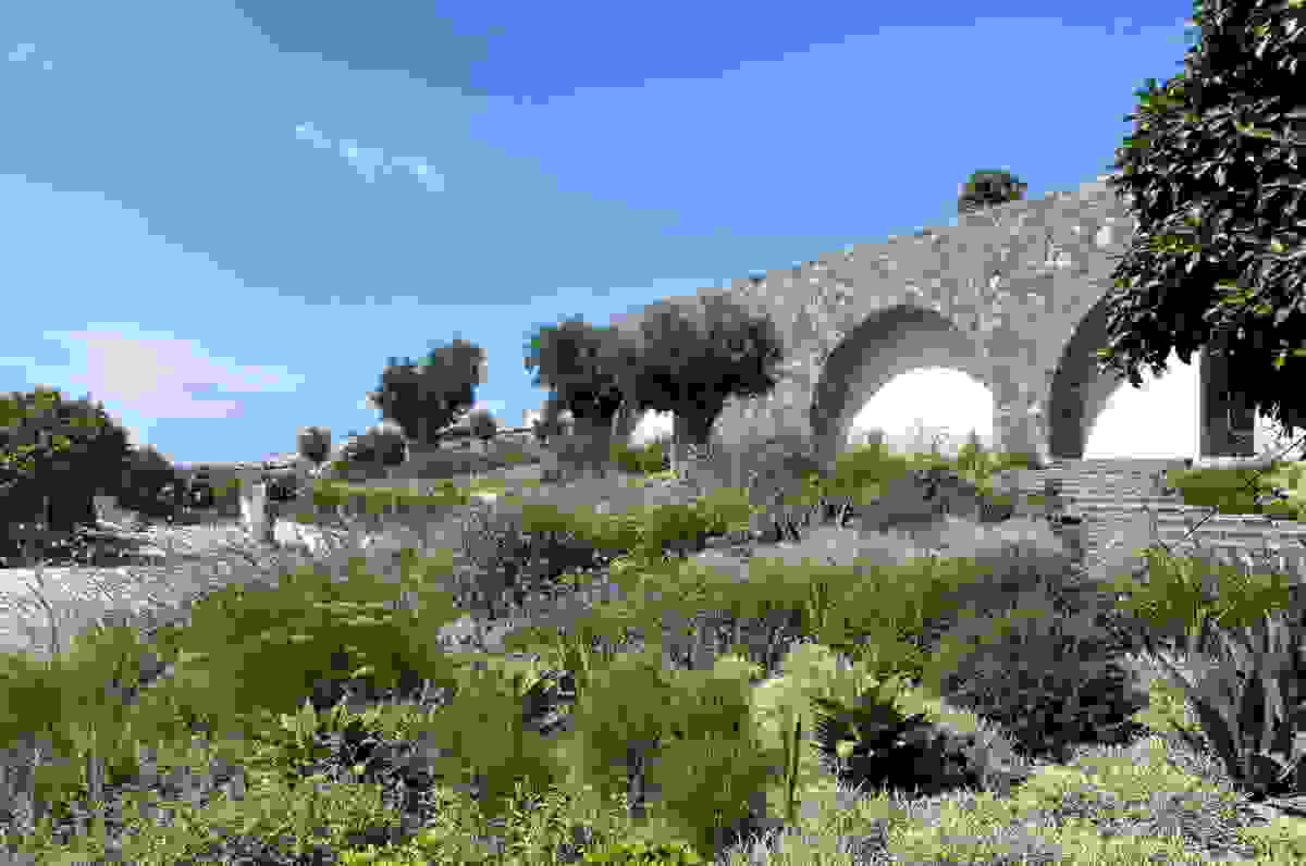 The restaurant’s pergola is cantilevered on its three visible sides –its eaves form a strong horizontal line of wood, a modern gesture in contrast to the timeless stone walls around it. And we wanted to combine the familiar typology of pool platforms with what we believe distinguishes Epitome, the planting: that is, to give the character of a garden which is made up of the scattered new trees, metal planters and perimeter planting. Overall, in the Epitome we designed, the landscape takes center stage against the background of local stone masonry walls -it dominates as a wild grass lawn on the roofs of the rooms and, as an acupuncture, with trees at the pool garden.