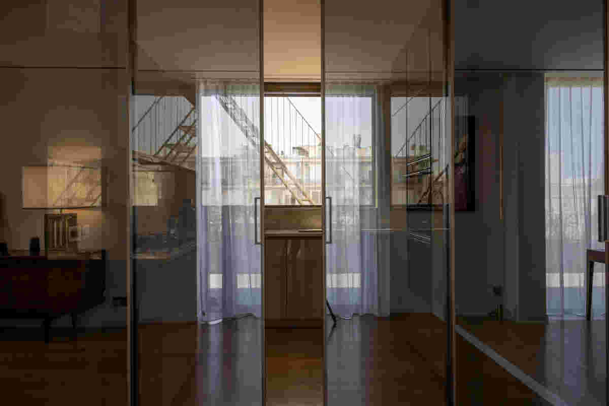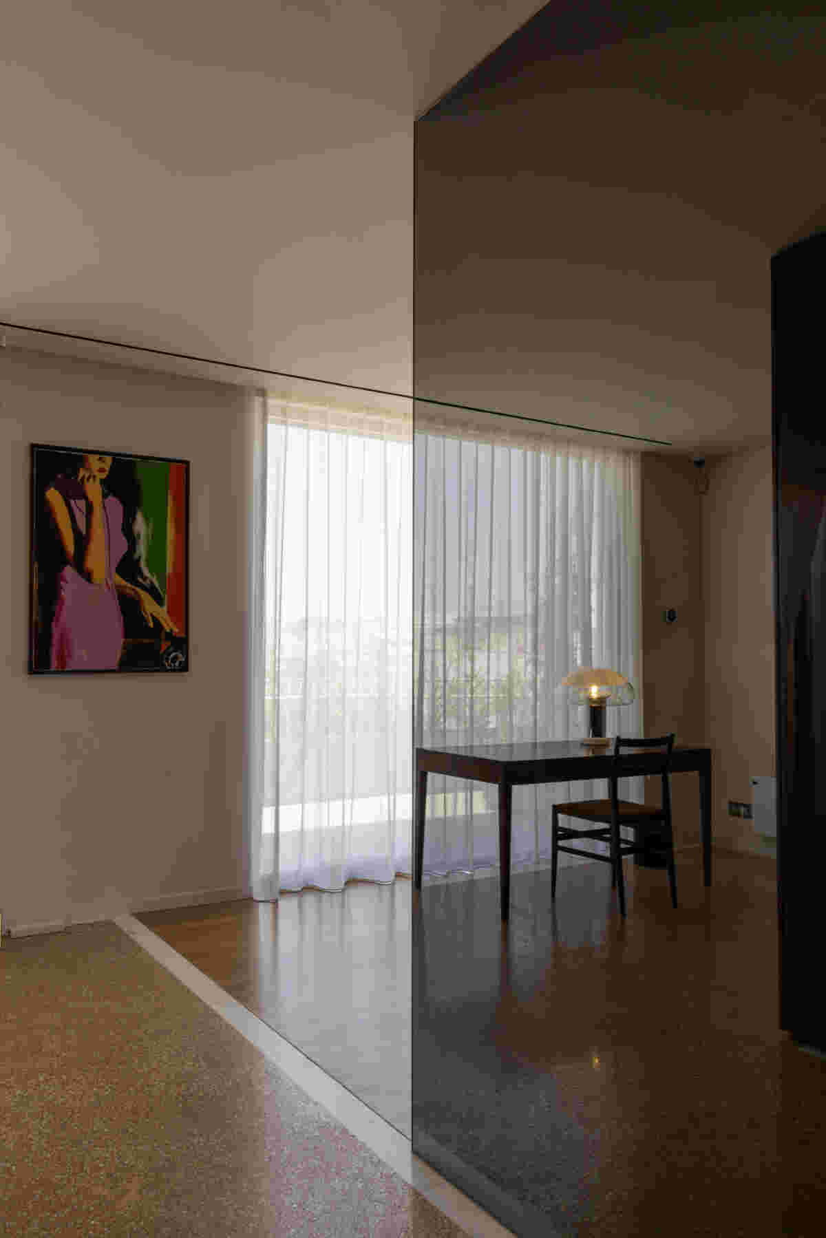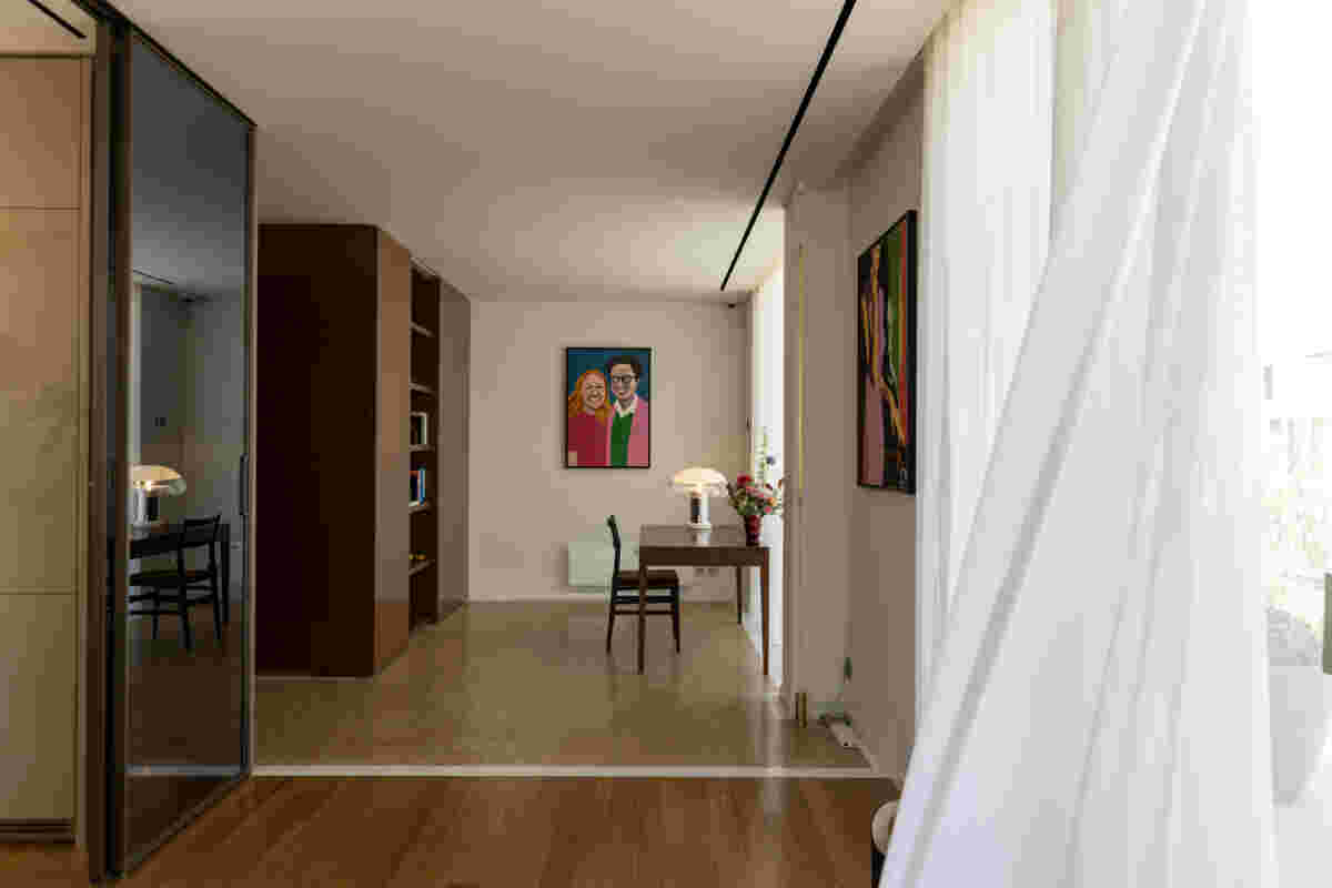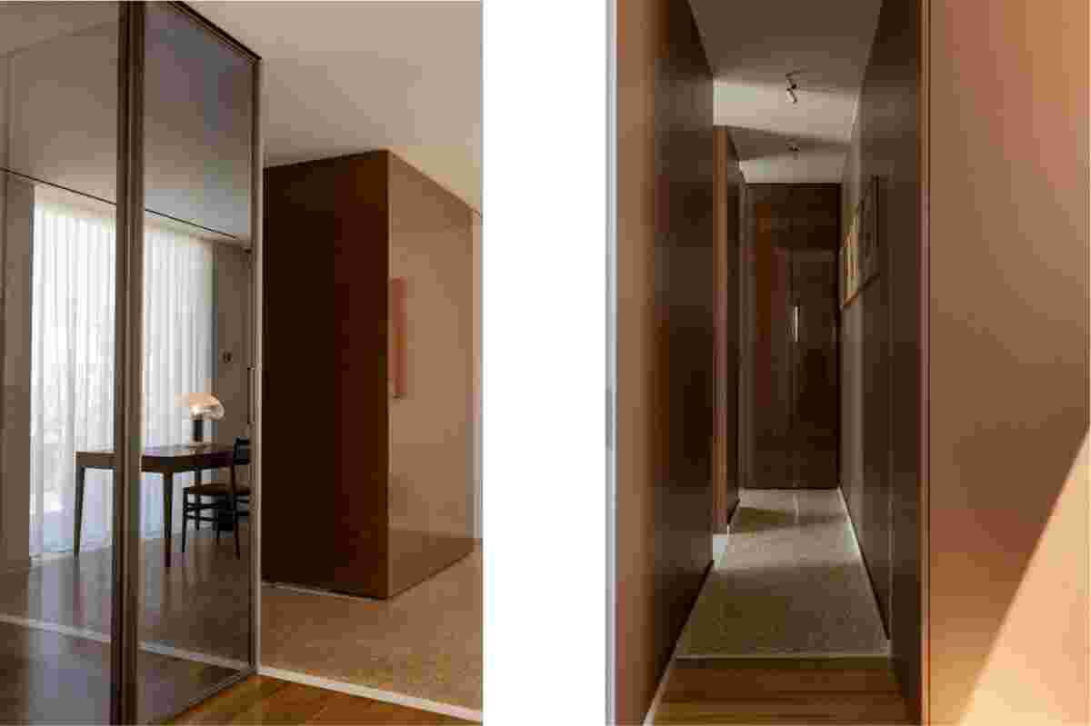 Early on we noticed the clients’ deep understanding of Italian and Scandinavian design. This was not only impressive, it also led to a certain reversal of the typical design development: at the very outset the collection of furniture was almost complete and we were meant to design the house around them. Thus, the color of the interior walls became a subject of discussion: were we to emulate a white gallery setting or could we introduce colors to match different textures? The renovation eventually combines both approaches -the very articulation of spaces seemed to favor it: the formation of two boxes, one for the kitchen and one for the dressing closet are underlined by the bold use of color. The first box is the kitchen, lined with Rimadesio sliding glass doors it is finished with Karnazeiko marble (from Argolida, Peloponnese) and frames a view towards the sprawling apartment buildings towards Acropolis. This box is replicated by the lacquered volume housing a small library. It is concealed behind a sliding panel that replicates as a door leading to the bedrooms.