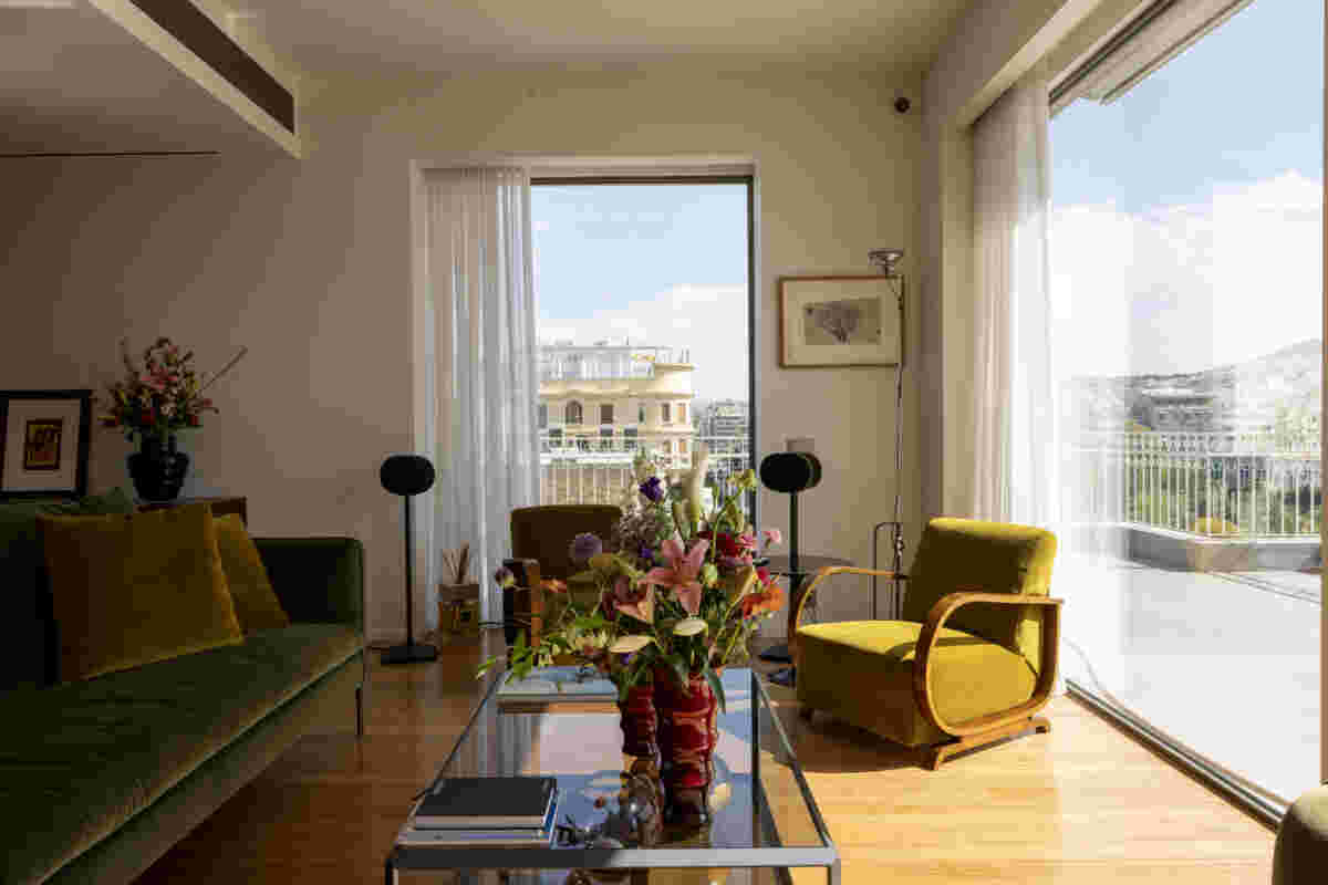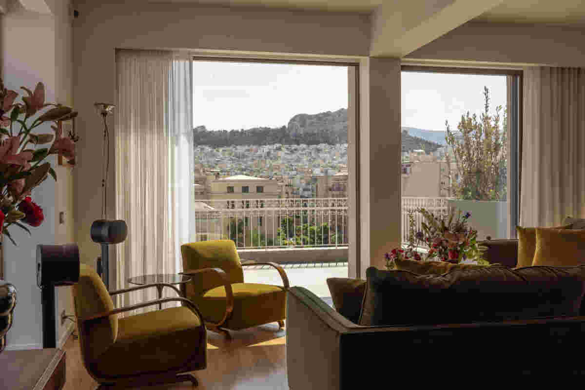 The monumental lineup here is impressive: the National Technical University (1862-1878) by Lysandros Kaftantzoglou directly across the street and the Archeological Museum (1866-1889) by Ludwig Lange / Ernst Ziller on the left. As if this frontal staging of neoclassical architecture was not enough, the Lycabettus hill’s curved outline looms at the background, the ultimate Athenian landmark, reminiscent of the Sugarloaf Mountain in Rio de Janeiro. Both the Museum and the University partake in a similar architectural agenda: a layering of marble colonnades in front of terracotta walls, a dialogue enriched by the greenery in the open spaces at the foreground. The apartment on the seventh floor overlooks these historical landmarks and its renovation reassembles deep colors with white walls. Responding to the large terrace, we chose to enlarge all windows, selecting a warm grey for the exterior facades, walls painted white in the interior.