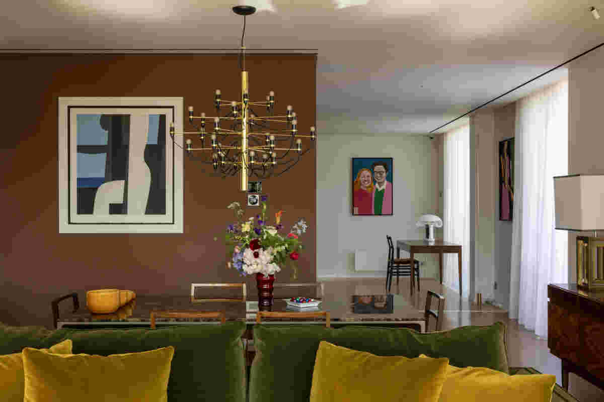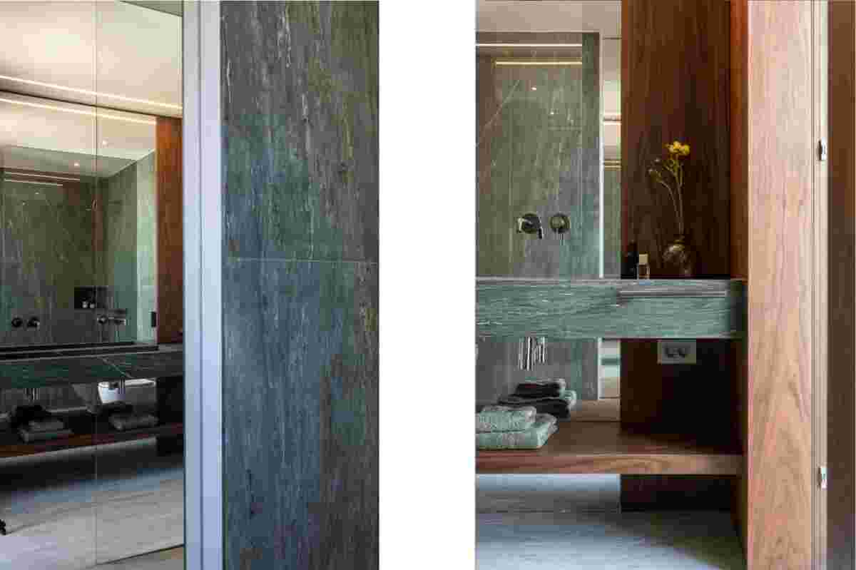 After this door follows the corridor lined with black and white prints and painted terracotta. This color looks as if it relates to the monumental neoclassical buildings across the street -in reality it was selected as the perfect match to the terrazzo floor of the entry hall. Marble does reappear in the master bath -here Oasis Green (from Tinos), so as to match the wooden finish at part of the interior. We think this renovation achieved a quite unique balance between vintage furniture (escaping easy attribution from contemporary production brands), along with Greek marble surfaces (their inclusion to such a large percent within the interior finishes, started to remind us of Milanese interiors, a familiar environment for the clients themselves).
