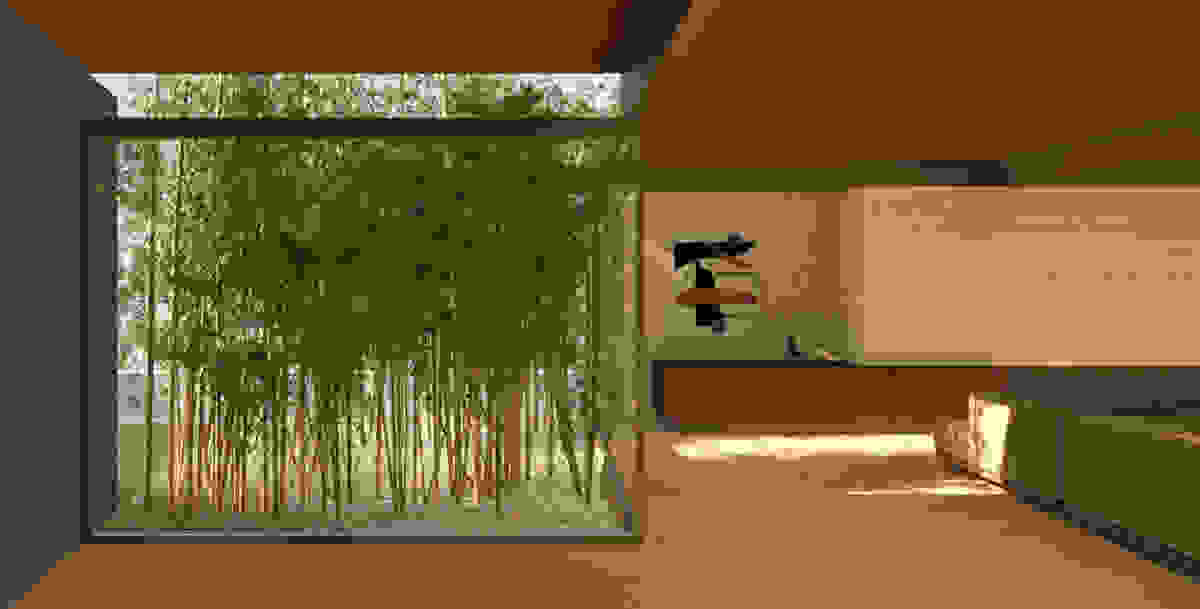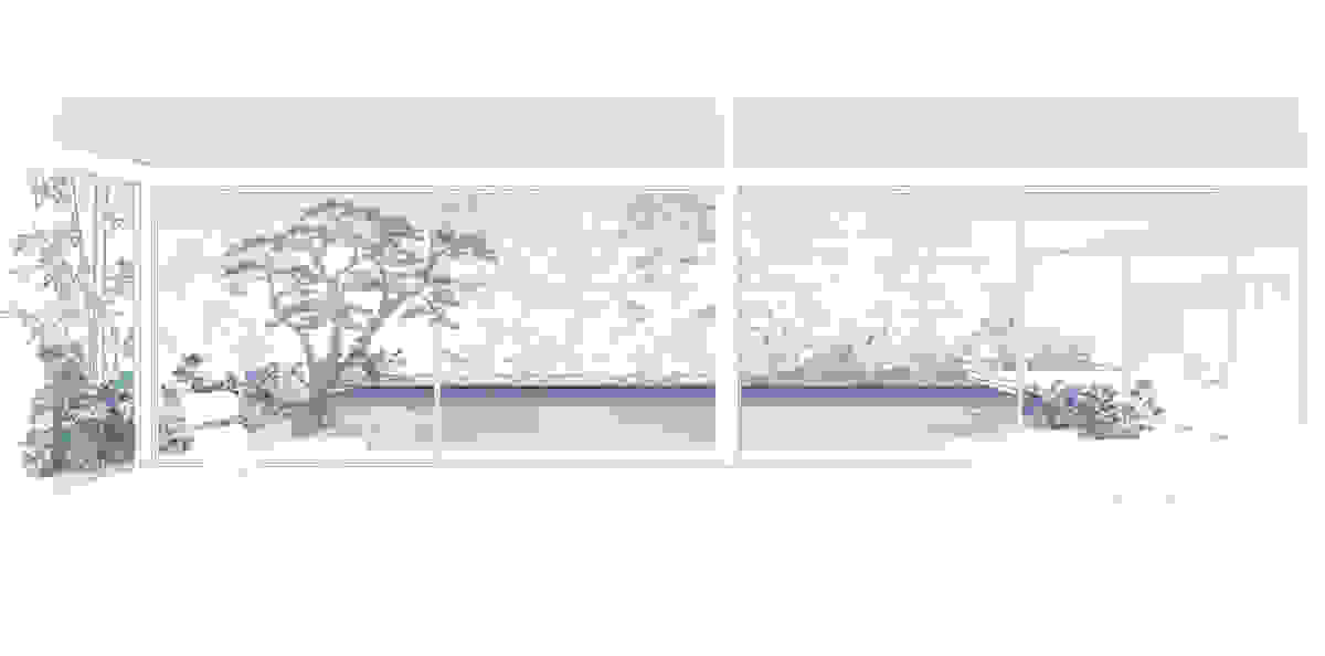 The similarity here with the marble quarry is not literal, in terms of the material itself -this particular residence may have followed the design of the Garden House in P. Psychiko, but marble finishes have not been chosen for the facades. On the contrary, the relationship with stone quarrying refers to the process of extracting volumes, since indeed behind the absolutely monolithic facade two large “blocks” have been removed to a depth of four meters. These voids form two gardens, one visible on the ground floor opposite the entrance and the second elevated, visible exclusively from the master bath on the first floor. A common feature of both gardens is the fact that they are both walled-in, like vases within the residence. These “secret gardens” manage to be completely invisible from the street, as the first floor spans its opaque and undisturbed façade hovering above the fence. In this way, the master bath manages paradoxically, to be completely transparent on both sides and, at the same time, completely invisible to visitors and neighbors. The house is divided into rectangular spaces between which, on the ground floor, diagonal relationships are created: From the entry of the house, the first garden “deflects” our movement and gaze diagonally, in a view that ends at the pool. A similar reverse diagonal relationship exists between the living room and the dining room, the latter being the only space in the house that protrudes into the garden.
