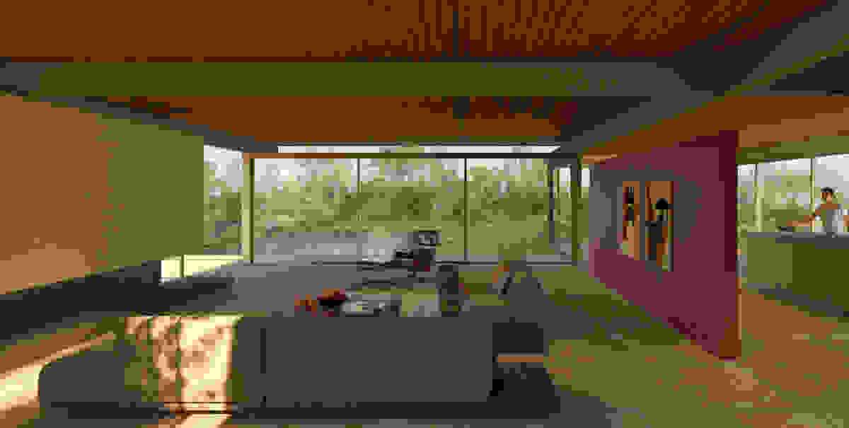 As part of this initial presentation, we did include our first renderings: on the interior design they witness echoes of the Case Study Houses, the series of houses built in Los Angeles in the 1960s. At first, this seemed a natural response when we found out that the owner grew up in an iconic house built in 1963: an emblematic architectural project on the Saronic Gulf that distilled principles of celebrated American modernism such as extensive glazing and large cantilevers. Indeed, the aesthetics of the 1960s proved to be common ground with the owners of the Quarry House -and although we will discontinue exposing the internal beams (a trademark within the architectural vocabulary of the 60s era), we realized that a new attraction was growing, this time to another iconic work of 1963: the Yale School of Architecture in New Haven, an emblematic work of brutalism with its bush-hammered concrete facades that exposed their aggregates.