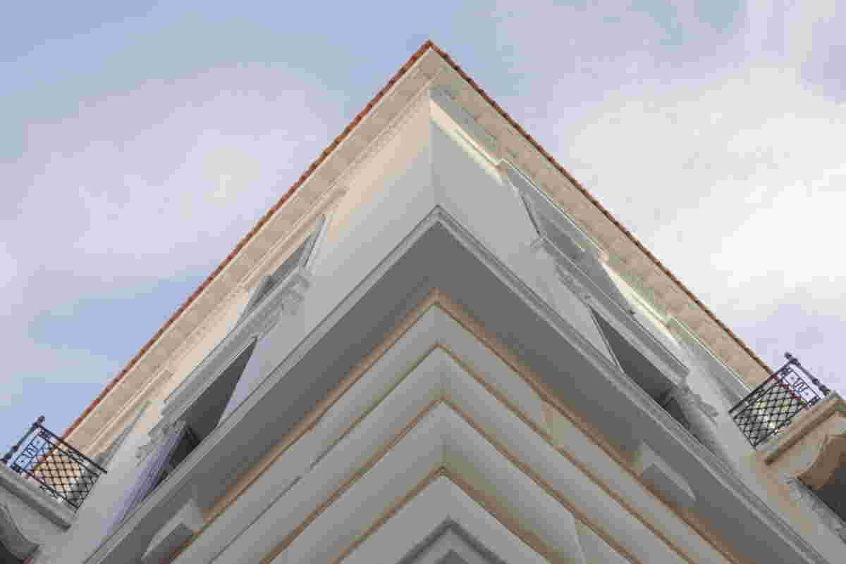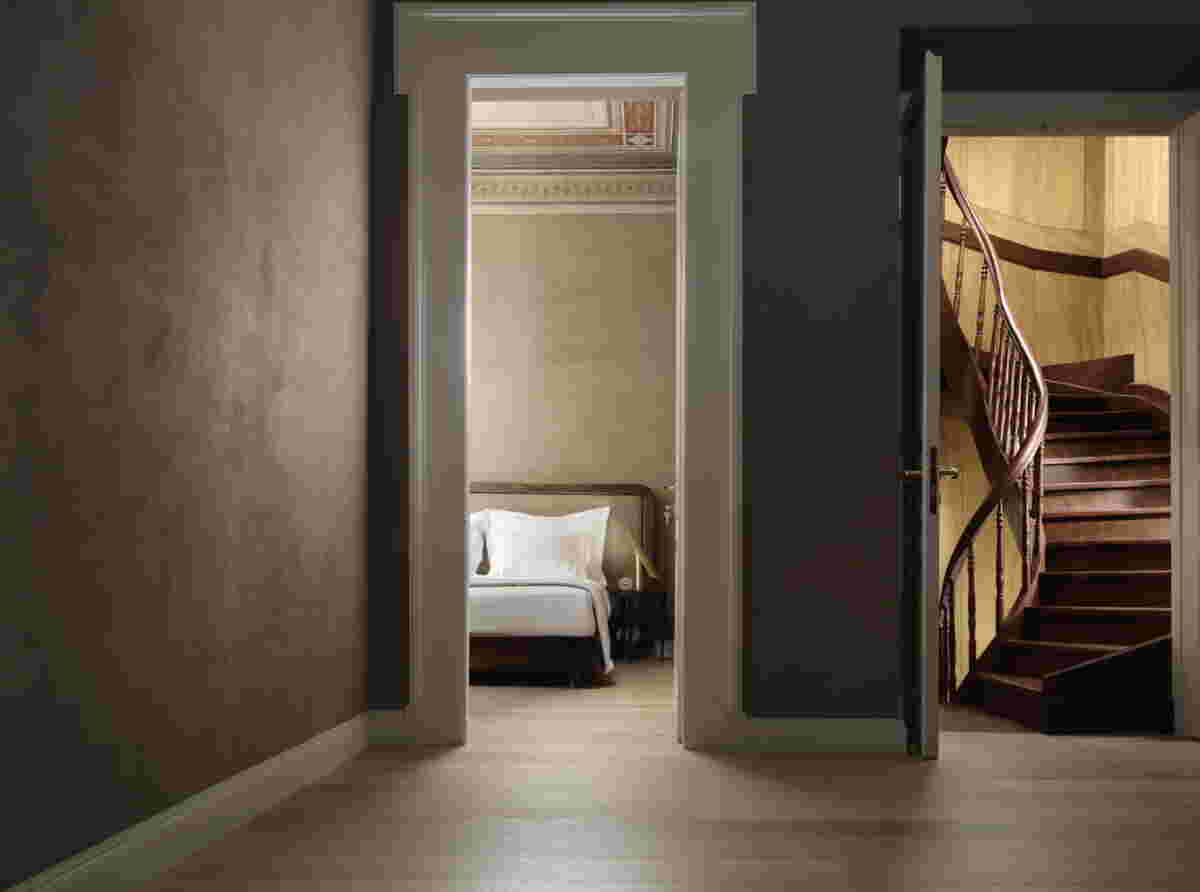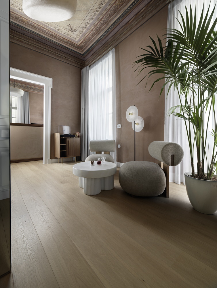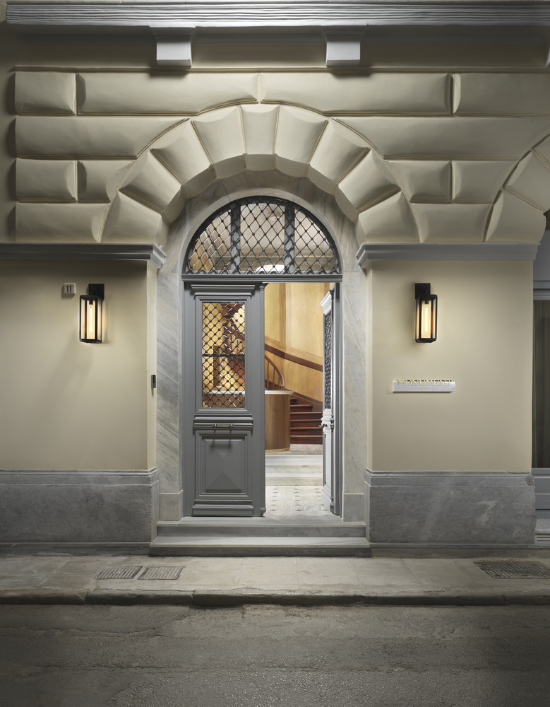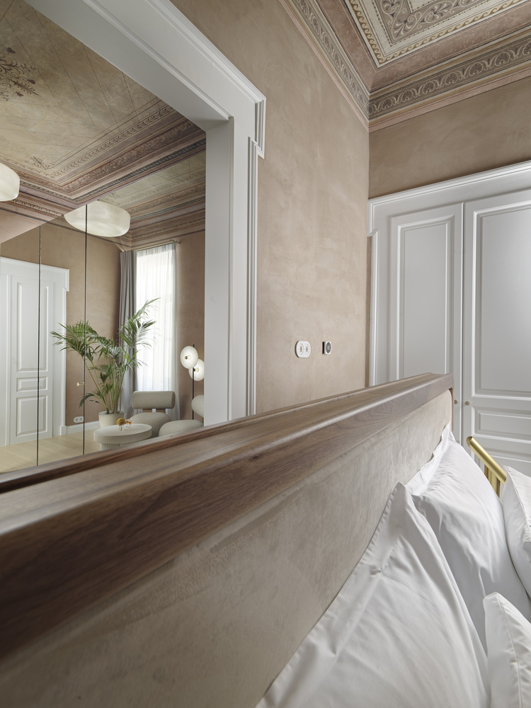 We attempted a corresponding reference to the facade of this neoclassical building on the ground floor, in the common areas of the hotel. Its facade, quite rare in that it faces three streets (Kalamida, Agiou Dimitriou and Melanthiou streets) has a characteristic archway. Inspired by this, we designed an arched opening and similar alchoves in the high ceiling interiors at ground floor. The original palette of the neoclassical ceilings influenced our selections for the colors in each individual room -matching the tones of each ceiling, we chose the colors of the textured walls and we completed the interiors with contemporary furniture that, without ever alluding to a prior condition, set a dialogue with the neoclassical past.