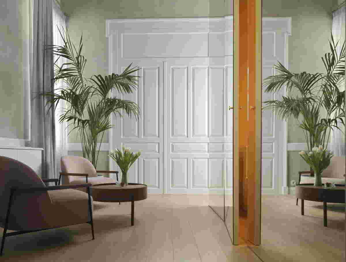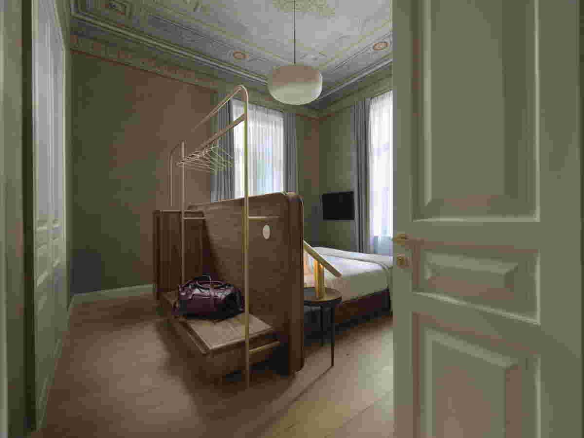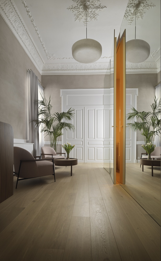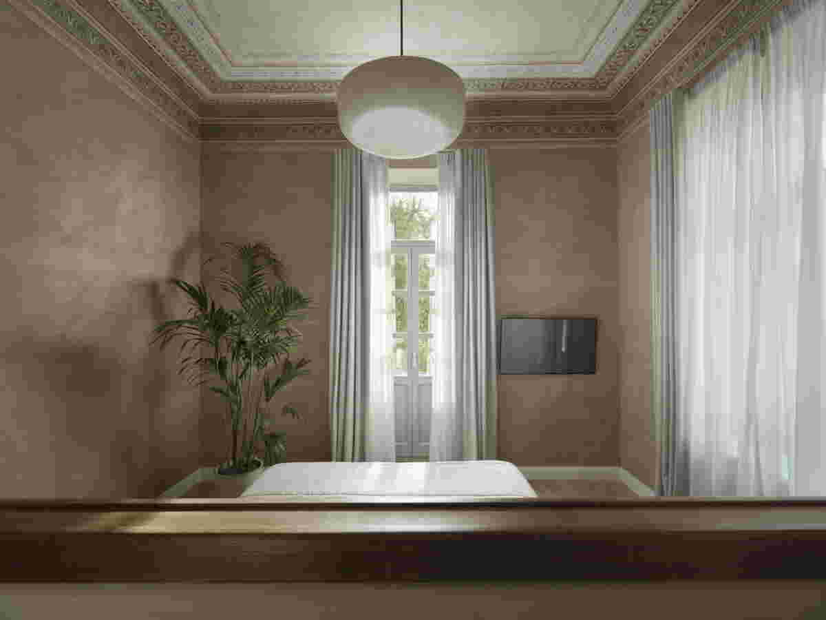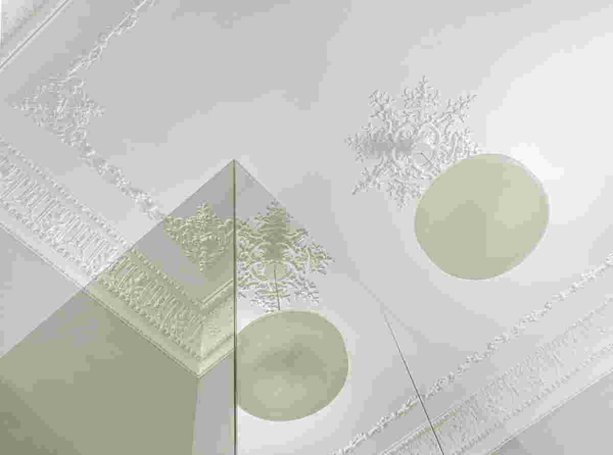 Likewise, for us, the renovation of this project, its transformation into the hotel Monument, became an occasion for a dialogue of new and old, this time at an architectural level. That is, from the beginning we raised the question of how the new addition to the interior can be distinguished with similar clarity in relation to the pre-existing structure, and, at the same time, highlight the old. In this regard, there were two elements that we wanted to emphasize, the axial articulation and the ceilings: In the existing layout of the floors, the rooms featured an axial organization marked with tall double doors. This arrangement was faithfully preserved in our renovation, as was the basic structure of rooms –the new spaces for the bathrooms are placed sideways, secondary to the axial movement. They become boxes that do not touch the painted ceiling -lined with mirrors they disappear and reflect the ceiling. In this way the new and the old acquire a clear differentiation.