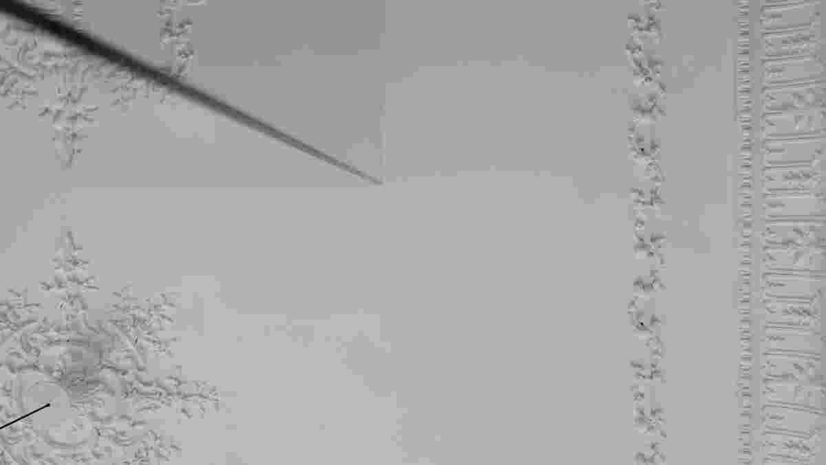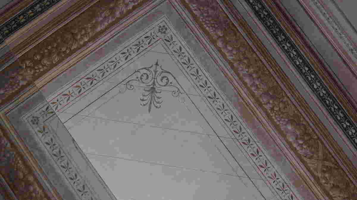 One could focus on a single detail of this renovation and consider it emblematic of the entire scheme. I am referring to the conservation of specific area on the second floor, at the perimeter of the ceiling decoration. There, our conservator, as part of the renovation, locally removed the white paint so as to disclose a deeper, rectangular section of the original, richly colored ceiling. Within this limited area, in the so-called “witness,” the conservator preserved the original colorful mural as well as the later white coating, thus recording how the aesthetic preferences of users had changed throughout history. Through this new, ordered and controlled “peeling” which was not the result of weathering, we are offered a fleeting glimpse into the past, in a palimpsest that retains historical layers in distinct form.