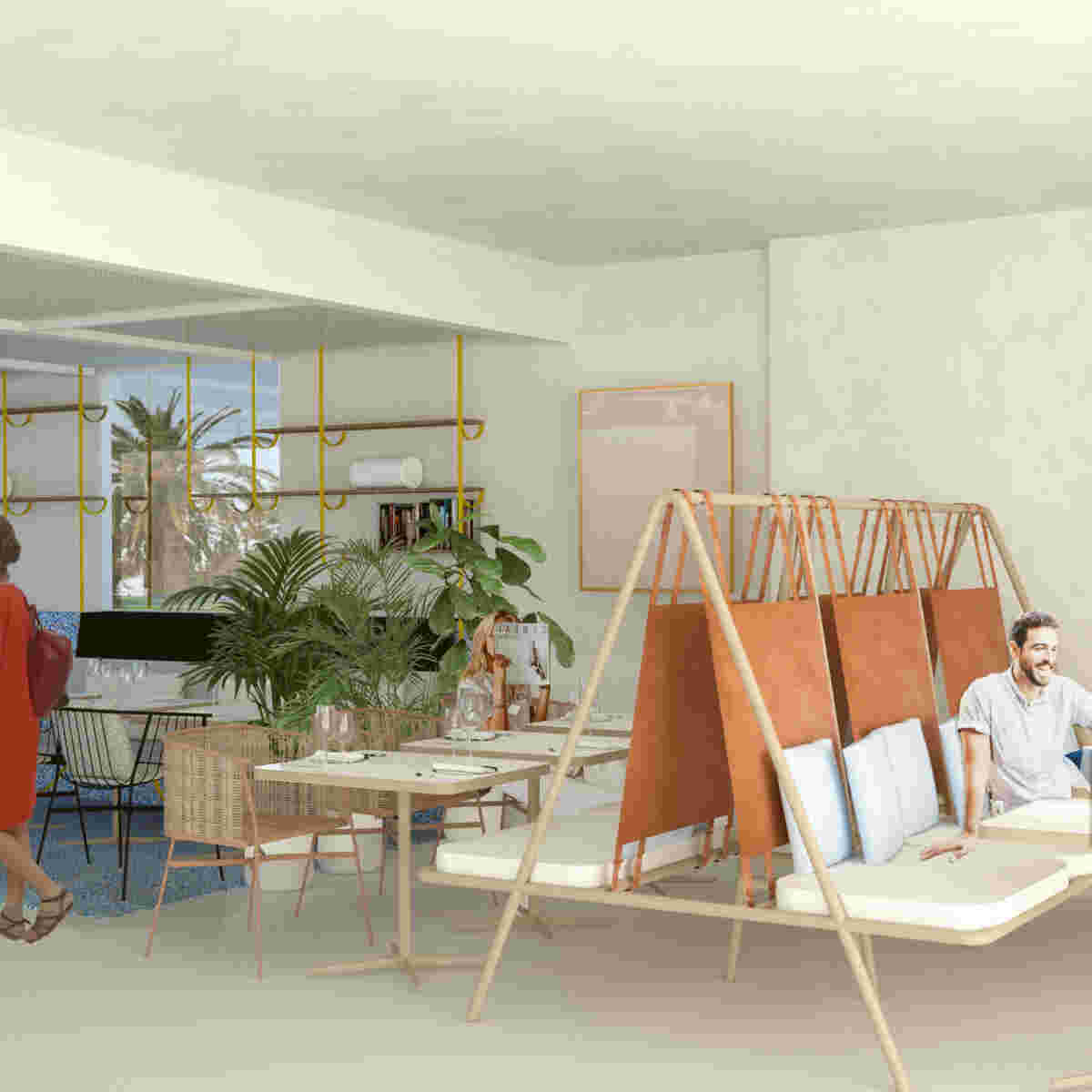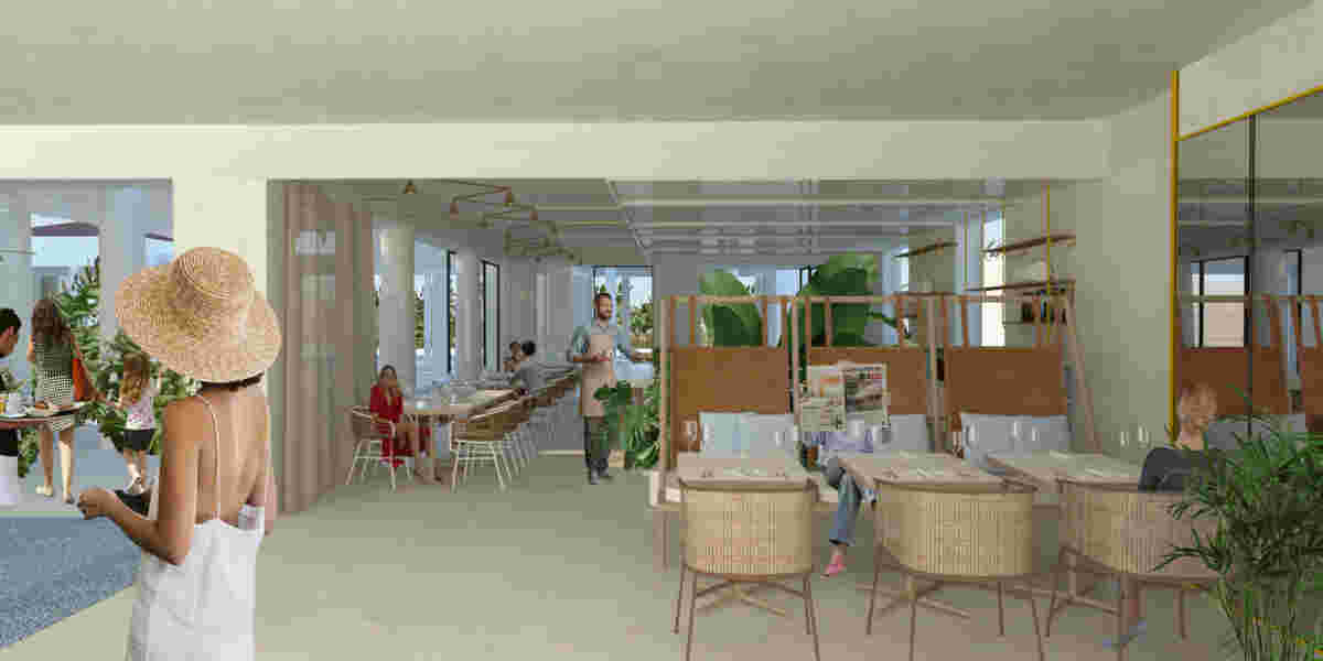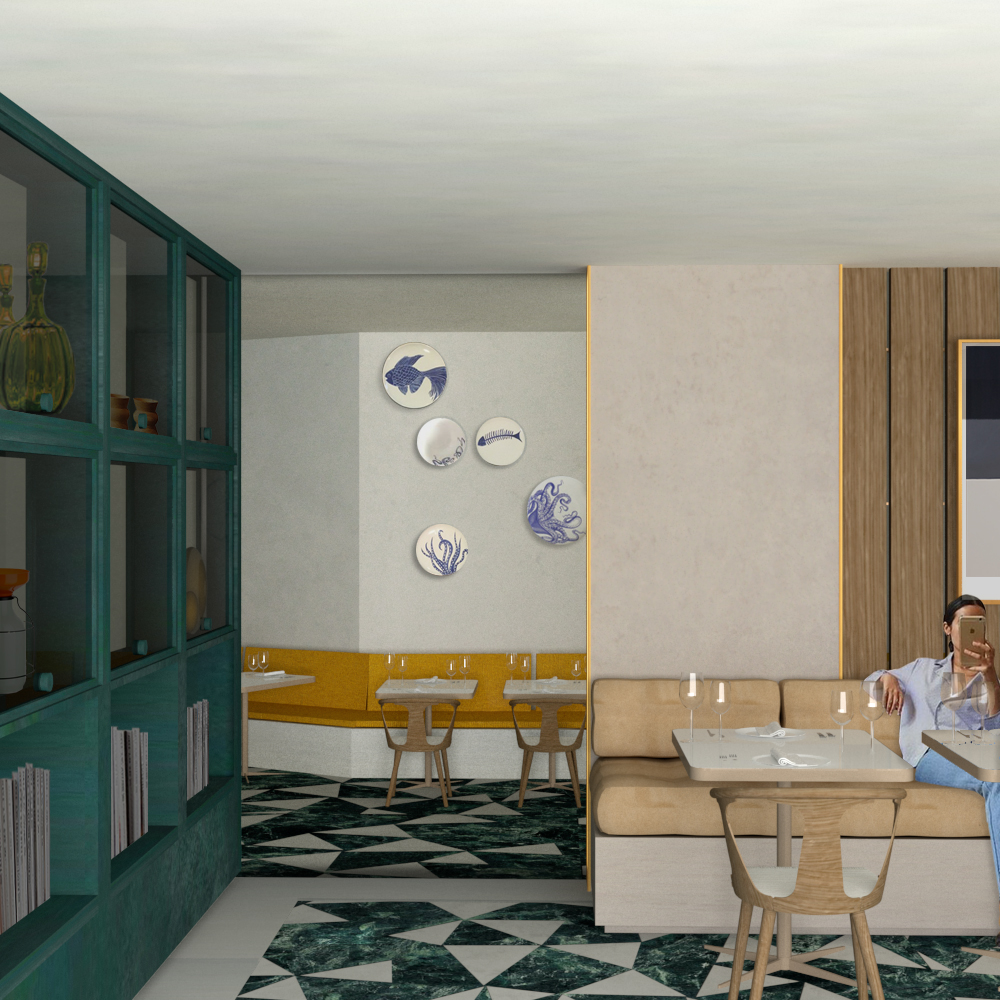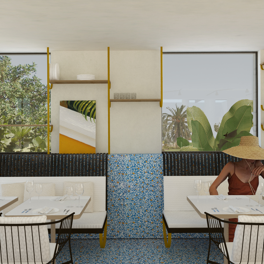 In this renovation of an existing restaurant in Kos, we are looking for ways to connect many different spaces within a restaurant that serves more than 1000 people every day. The basic aim of the design is to make the tenant of a hotel -who visits the restaurant two times per day- obtain many different images, included in an overall proposal. Thus, individual restaurants, such as a garden restaurant or a floating restaurant, are created. The concept of tactility is being sought after in every space as it strengthens the intimacy and the idea of handmade, so much needed in the digital age. The necessity of surrounding ourselves with surfaces that have particular textures and colors is answered with the selection of glossy, complex textures and patterns, fabrics with strong references to the natural, such as leather, as well as the enhancement of the concept of collecting and exhibiting objects. The contact with nature is achieved here with references to vegetation and the augmentation of the contact with the aquatic element, either literally or pictorially. In this way, many individual stories are created, which make the user’s stay in the restaurant, each time, a special experience.