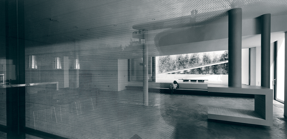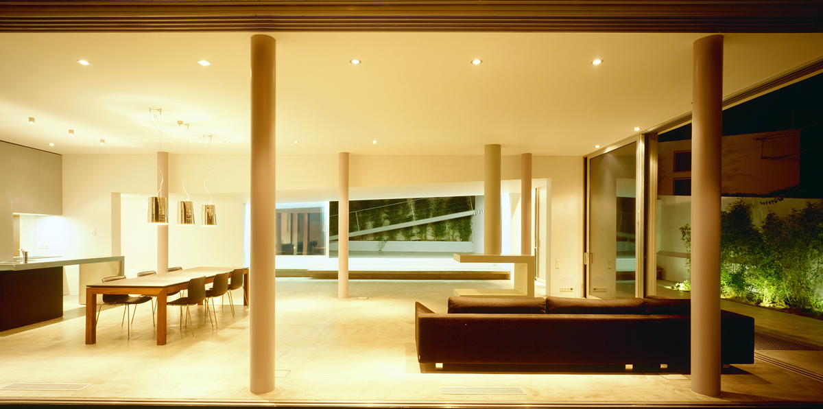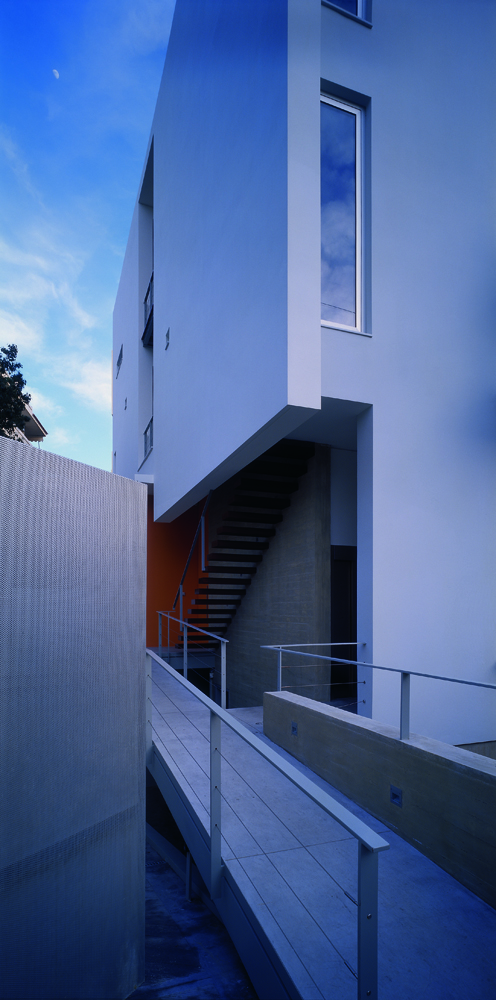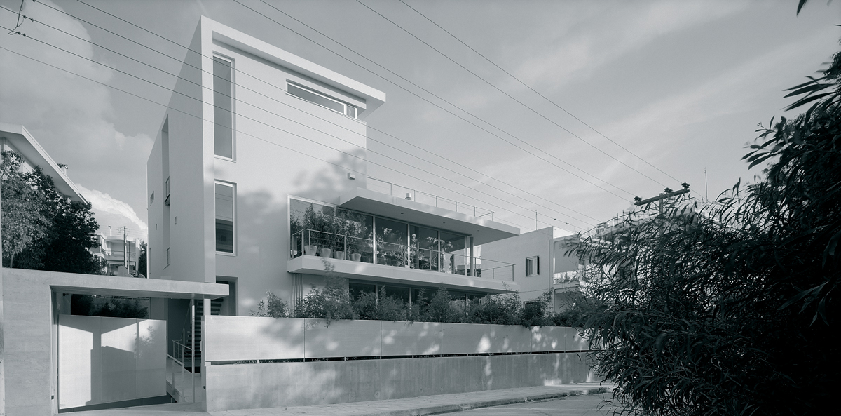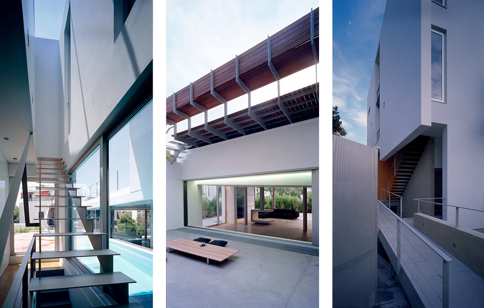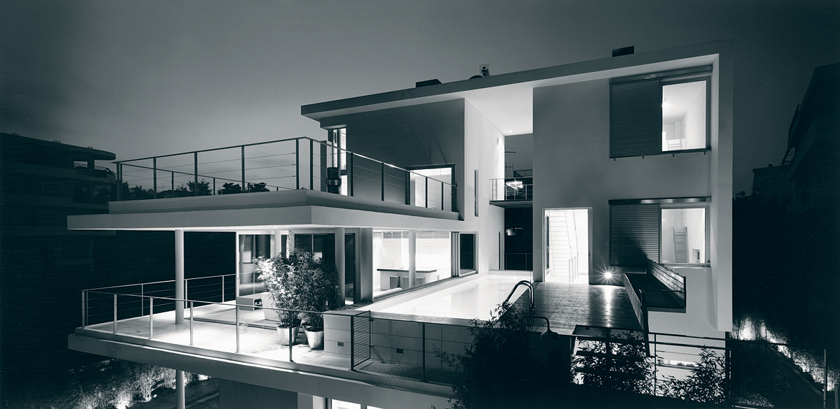 This house was designed for two related families that until then had been living in adjoining apartments. In their new house in Alimos, a pool reestablishes this proximity while acting also as a demarcating limit. Next to this pool on the first floor a cantilevered deck offers views towards the surrounding trees, simulating an experience one would normally have from a ground floor. Facing the pool and deck the living room of the second house is partly submerged under the water’s surface. The living areas of the first house are placed underneath, on the ground floor. The visitor opens a high orange door and a skylight offers glimpses of the roof slab that covers the pool. Then follows a hinged space under the inclined bottom of the pool, a space that becomes gradually higher before leading to the living area. Large openings connect the street with the backyard on the ground floor. The bedrooms of this residence are stacked on the other side of the pool while the bedrooms of the second house are placed above its living area, towards the street.