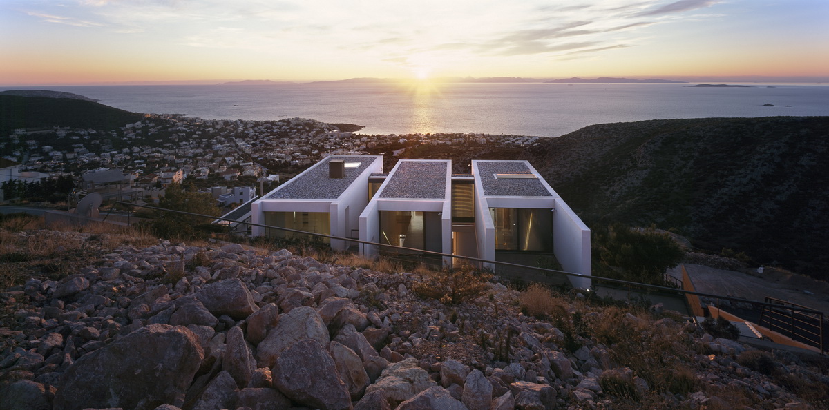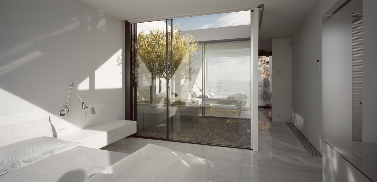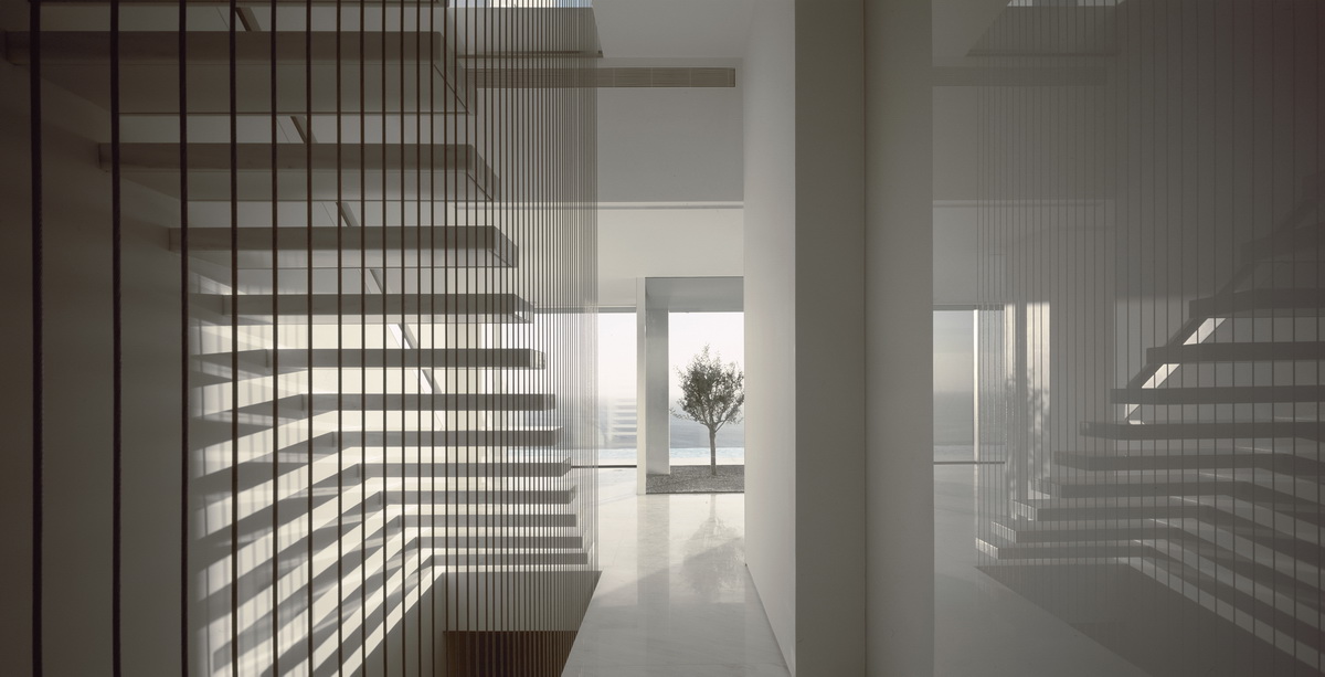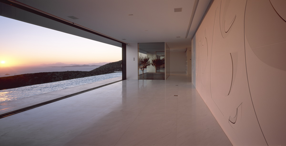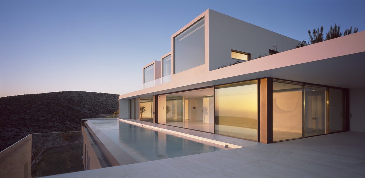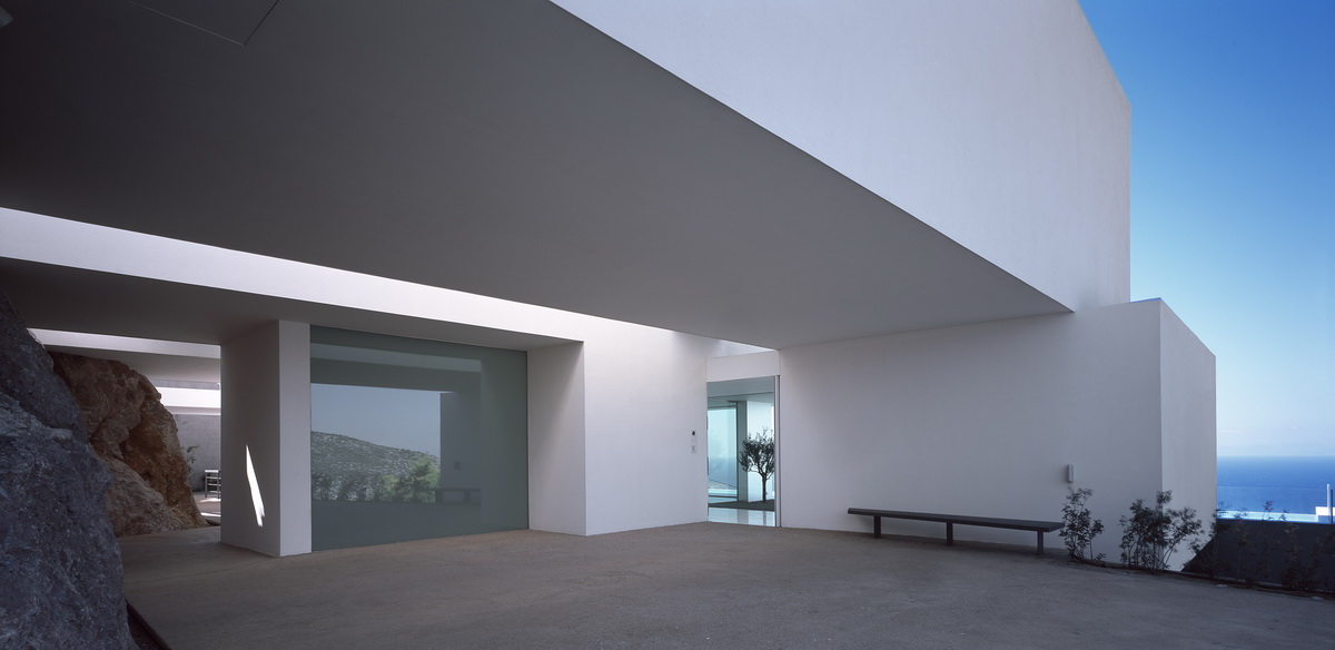 In this steeply inclined site with sweeping views, a pool extends parallel to the contours of the ground. Immediately behind this pool and enclosed behind a glass façade, all living areas are deployed in an open arrangement. Their continuity is interrupted only by a covered courtyard, disclosed to the visitor upon his entry to the house. Having turned left and traversing the living room and dining room, one reaches a second, open-air terrace. The horizontal panoramic view from the ground floor corresponds to the linear pool while on the first floor the same view is framed independently by the three bridges that are placed perpendicular to the pool. These bridges contain bedrooms; they connect to the rock behind through planted private courtyards and hover above the entry to the house. One may also approach the southern terrace from the back, passing underneath the three bridges that allow slots of light in-between. As one reaches the bedrooms, the glass connecting corridors momentarily allow views of the sea and the mountain.