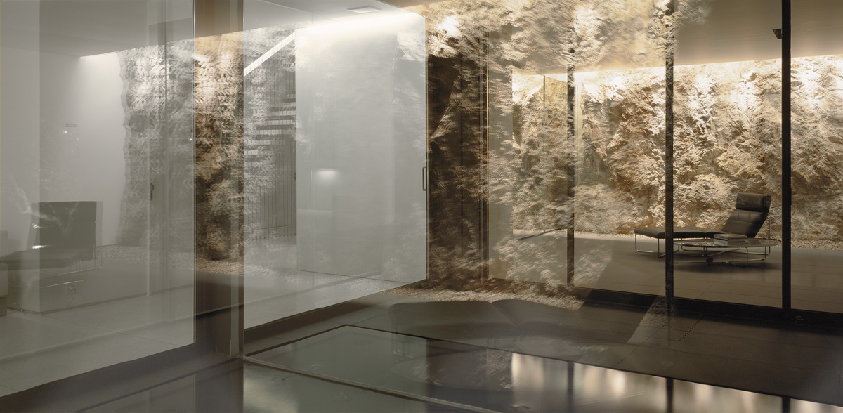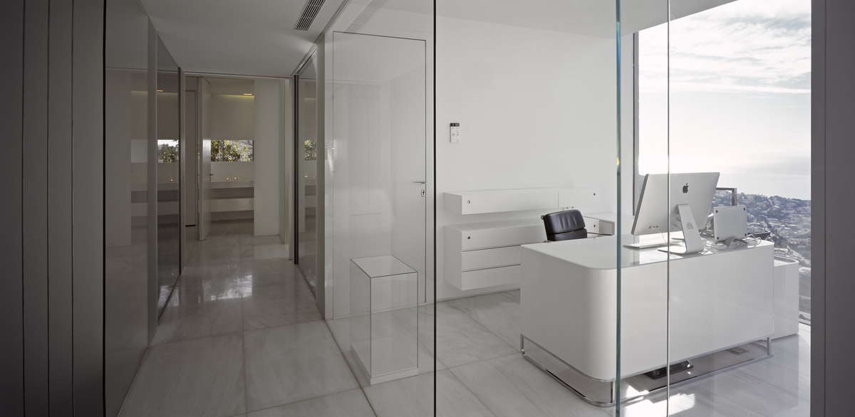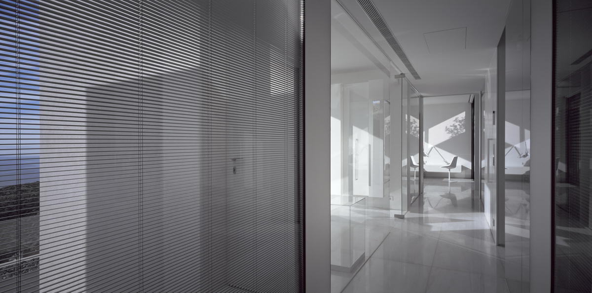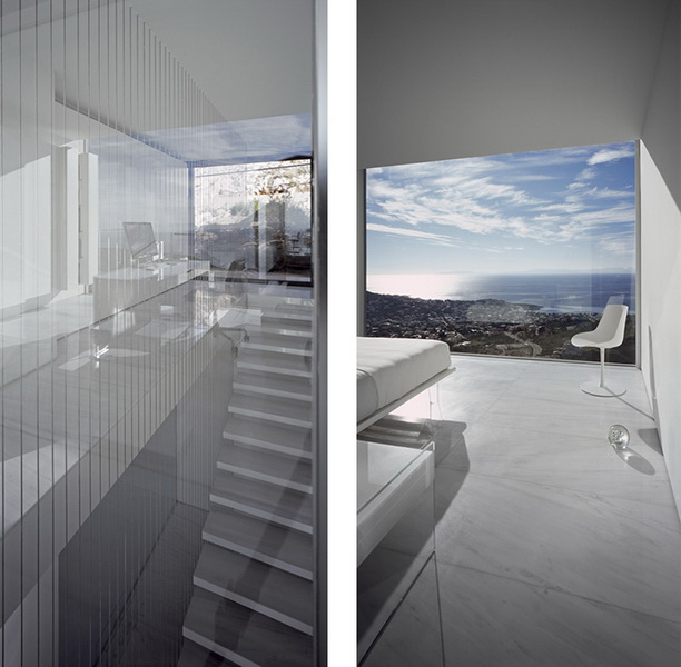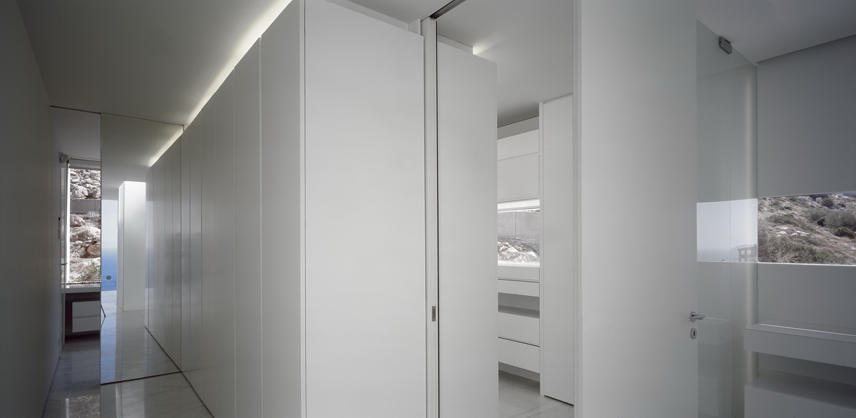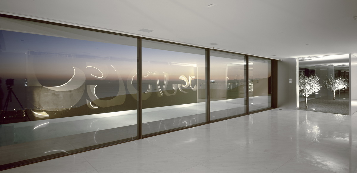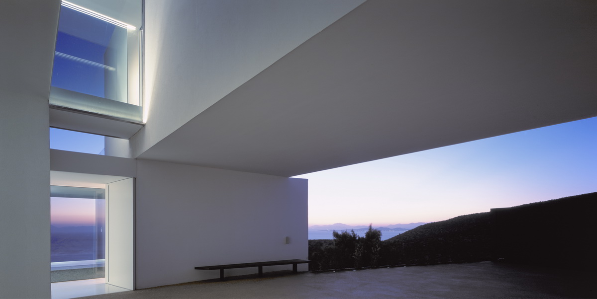 In this steeply inclined site with sweeping views, a pool extends parallel to the contours of the ground. Immediately behind this pool and enclosed behind a glass façade, all living areas are deployed in an open arrangement. Their continuity is interrupted only by a covered courtyard, disclosed to the visitor upon his entry to the house. Having turned left and traversing the living room and dining room, one reaches a second, open-air terrace. The horizontal panoramic view from the ground floor corresponds to the linear pool while on the first floor the same view is framed independently by the three bridges that are placed perpendicular to the pool. These bridges contain bedrooms; they connect to the rock behind through planted private courtyards and hover above the entry to the house. One may also approach the southern terrace from the back, passing underneath the three bridges that allow slots of light in-between. As one reaches the bedrooms, the glass connecting corridors momentarily allow views of the sea and the mountain.