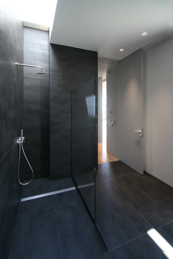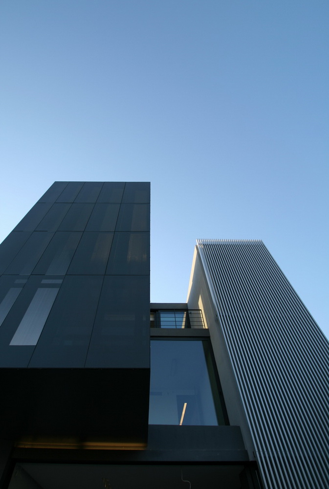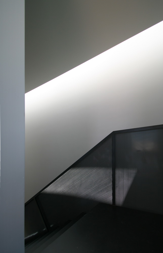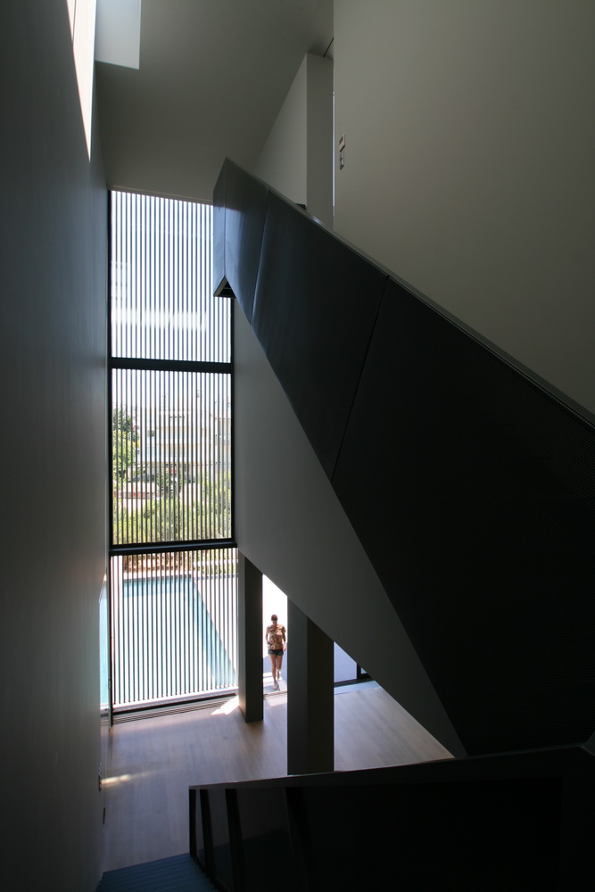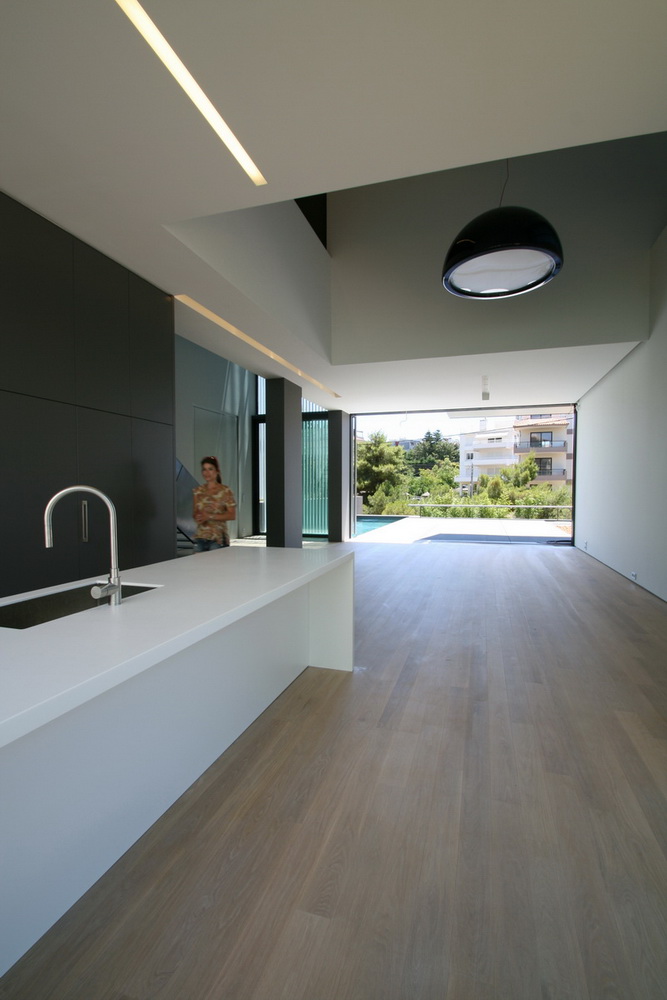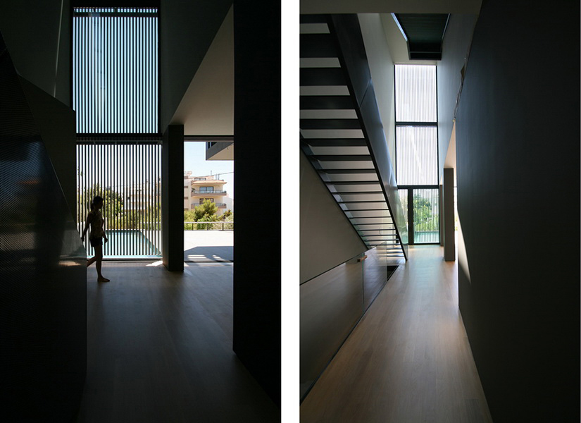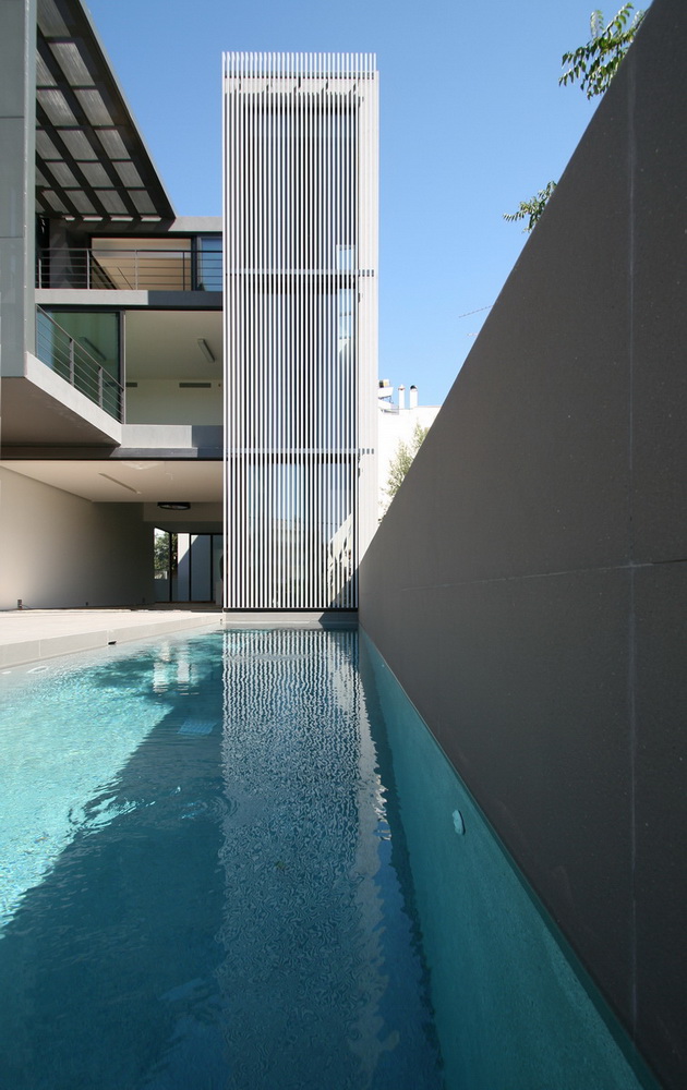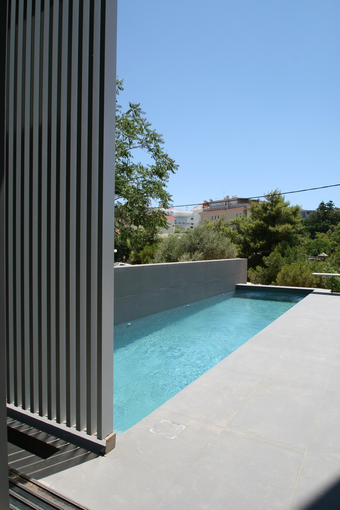 In this new residence, an oblong site with a downward slope towards the road is divided lengthwise into two strips, emphasizing the oblong form. With this linear distribution of space a clear distinction is made between living and service zones. The entrance forms a transverse element in the narrower of the two zones– a three-storey space where the linear stairs are lit from above and narrow slits between metal louvers offer glimpses towards the swimming pool. Immediately adjacent to this is an open-plan zone with the living-dining and kitchen functions that is open at its ends towards the gardens. Above the dining area, a void mediates between the two children’s rooms on the first floor. The master bedroom is located on the second floor with an extensive terrace that spreads out to the front along its entire width. Its set-back in relation to the children’s room helps to distance it from the street, creating a retreat whose privacy is emphasized by the slender metal louvers rising from the floor below.