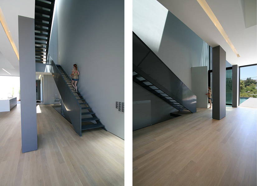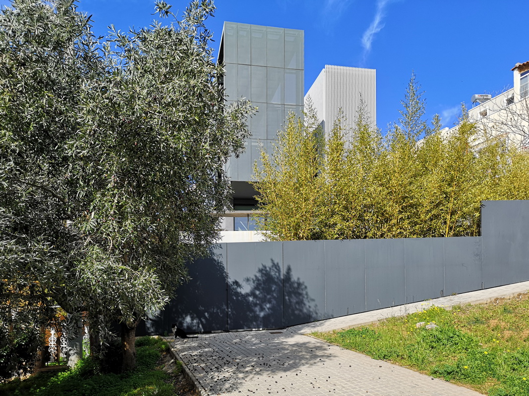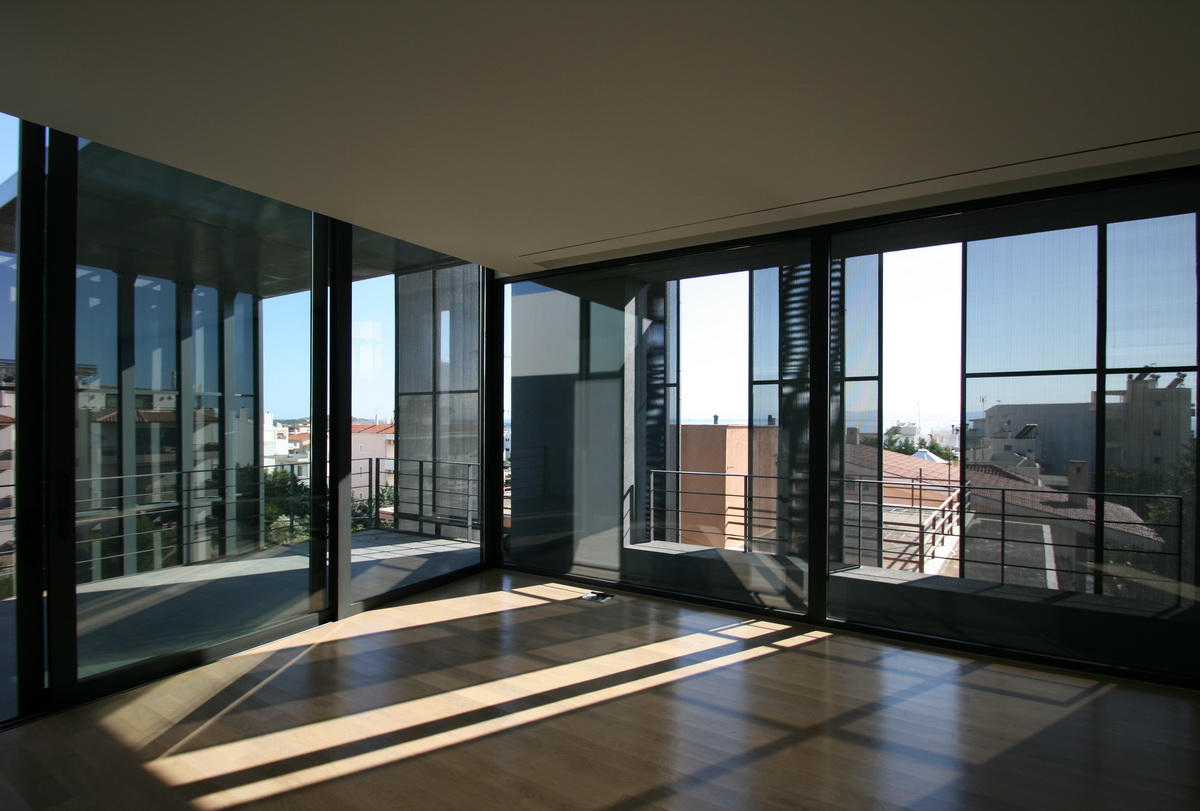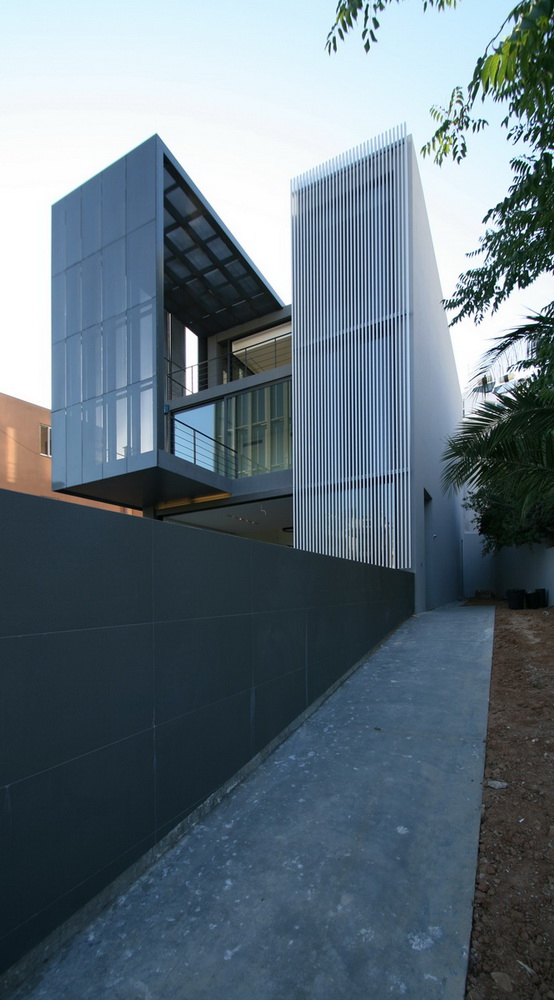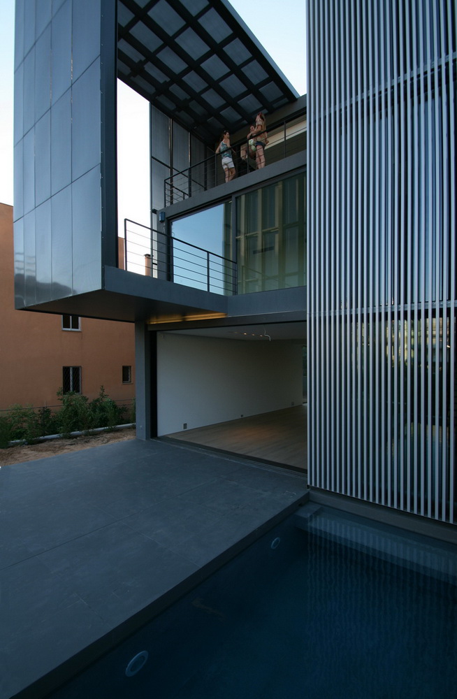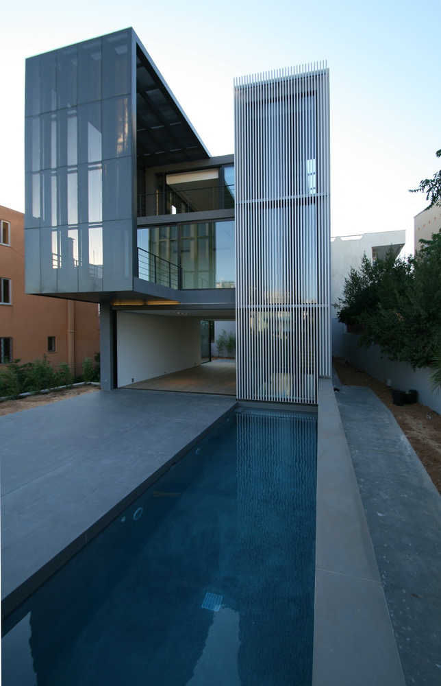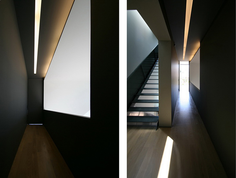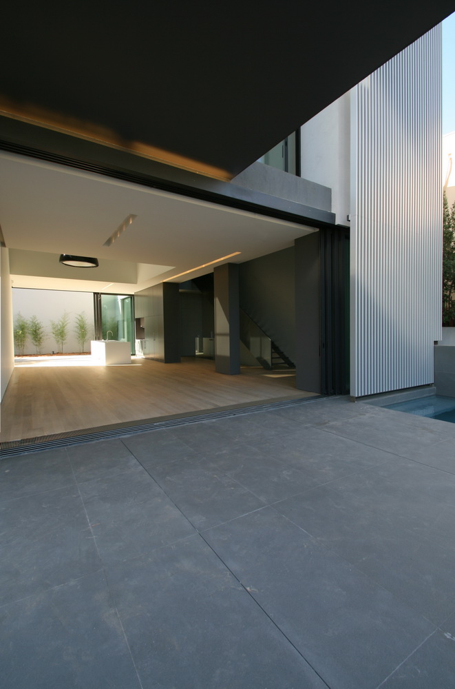 In this new residence, an oblong site with a downward slope towards the road is divided lengthwise into two strips, emphasizing the oblong form. With this linear distribution of space a clear distinction is made between living and service zones. The entrance forms a transverse element in the narrower of the two zones– a three-storey space where the linear stairs are lit from above and narrow slits between metal louvers offer glimpses towards the swimming pool. Immediately adjacent to this is an open-plan zone with the living-dining and kitchen functions that is open at its ends towards the gardens. Above the dining area, a void mediates between the two children’s rooms on the first floor. The master bedroom is located on the second floor with an extensive terrace that spreads out to the front along its entire width. Its set-back in relation to the children’s room helps to distance it from the street, creating a retreat whose privacy is emphasized by the slender metal louvers rising from the floor below.