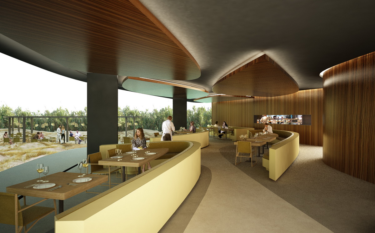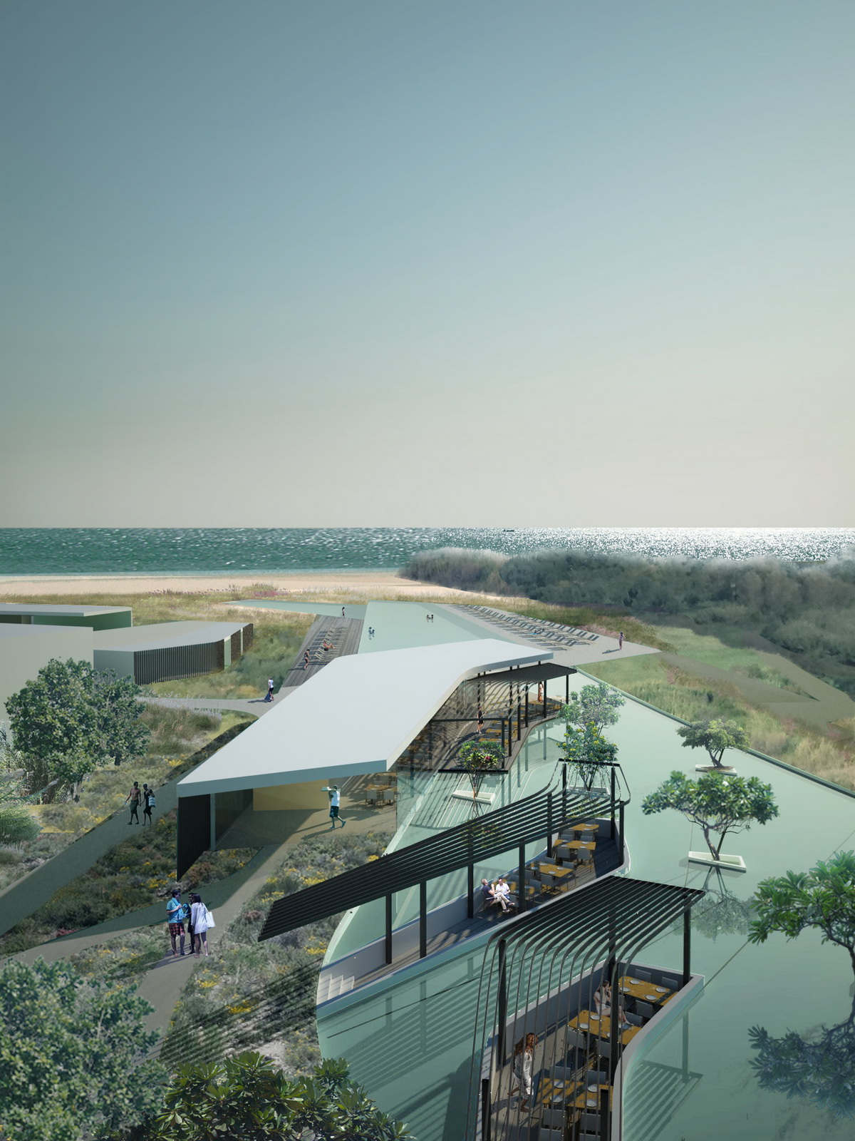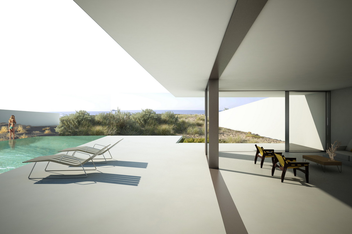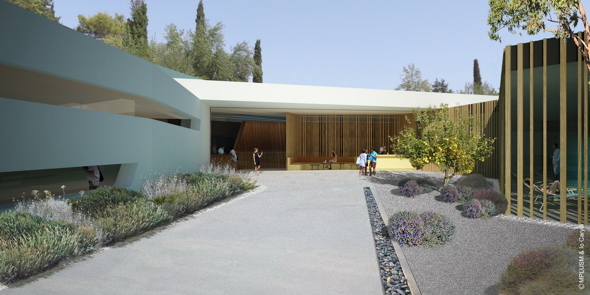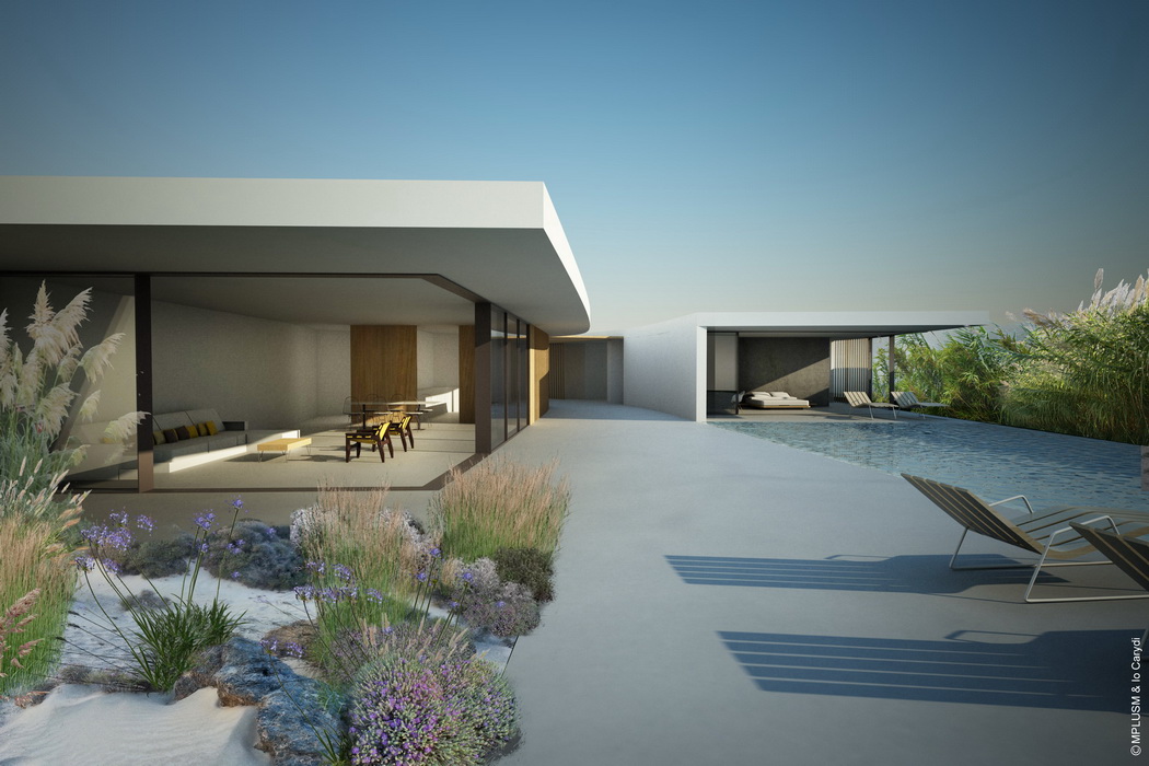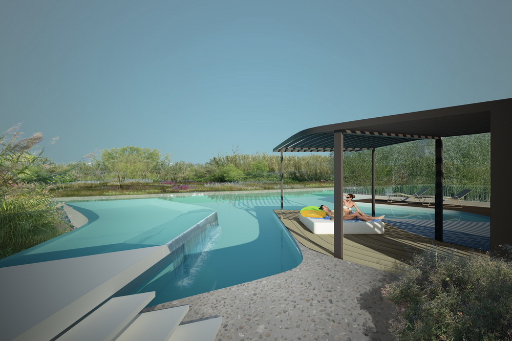 The design of this resort is anchored on the stream that traverses the 170 acre plot. On its west side luxury villas generate a low density landscape scattering of free standing units. On the east side the hotel includes communal areas of a larger scale: reception, lobbies, conference center, rooms, restaurants, spa and common pools that become a second wet landscape echoing the stream itself. Within this variety of the densities, architecture retains a single organic vocabulary with curvilinear geometries reflected in the design of all of the landscape and the water elements. The facades of these convex and concave buildings often acquire wooden vertical blinds. These blinds beyond their shading function, they refer to the reeds that line the stream. A variety of alternating views between buildings, oblique and curved geometries, make the path with the resort like a promenade in a Mediterranean landscape.